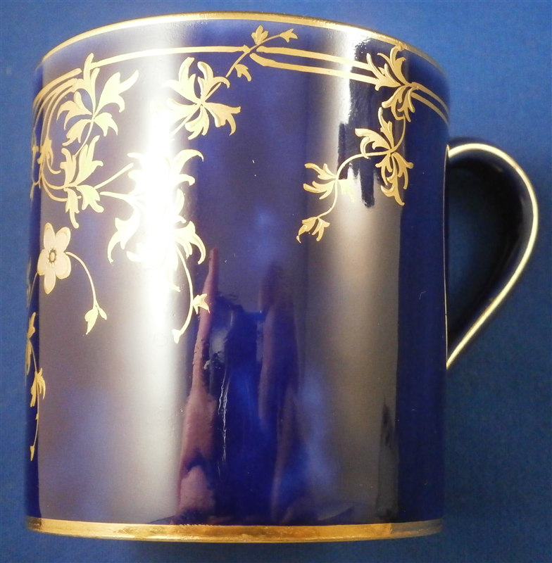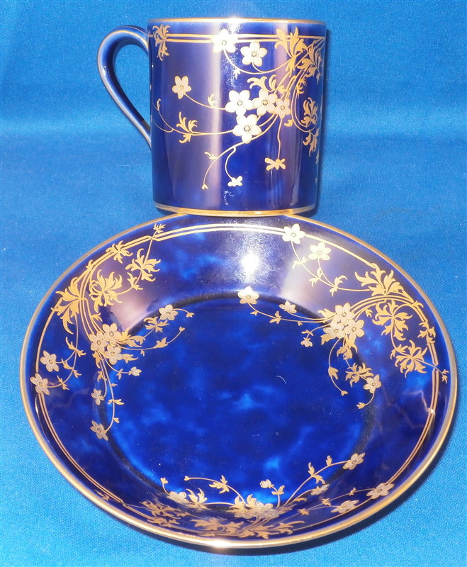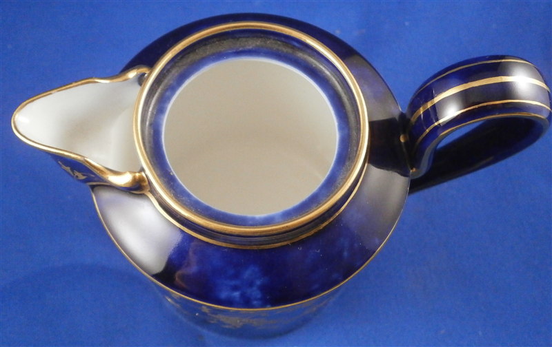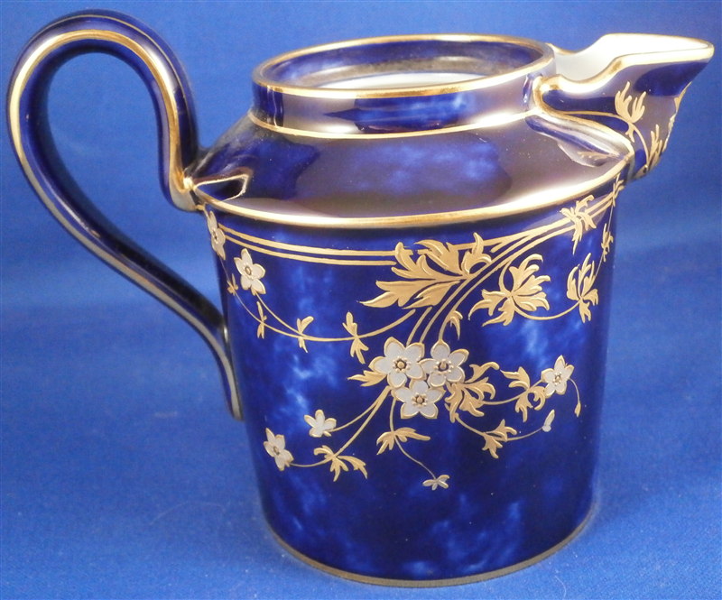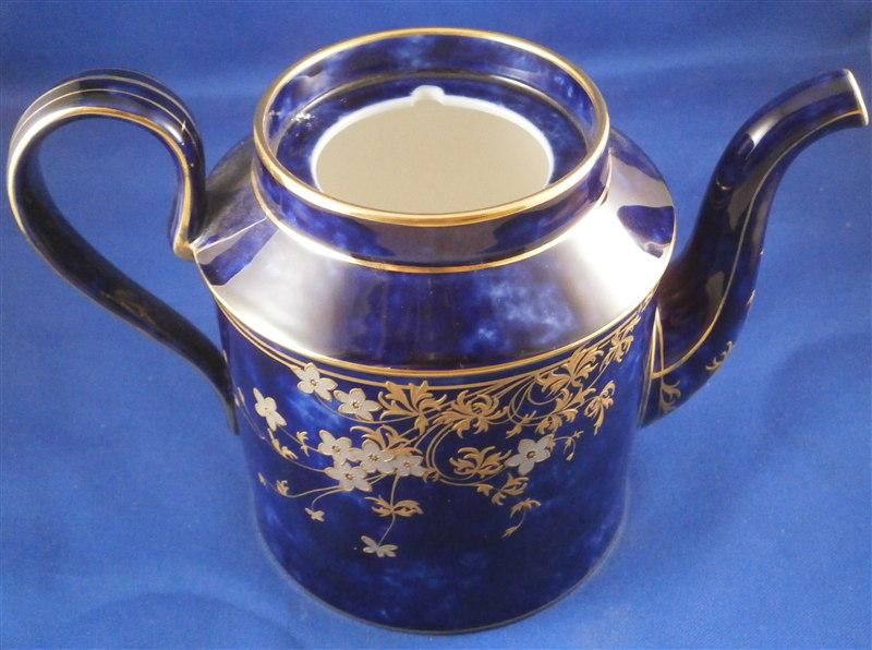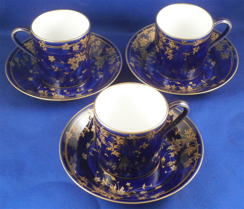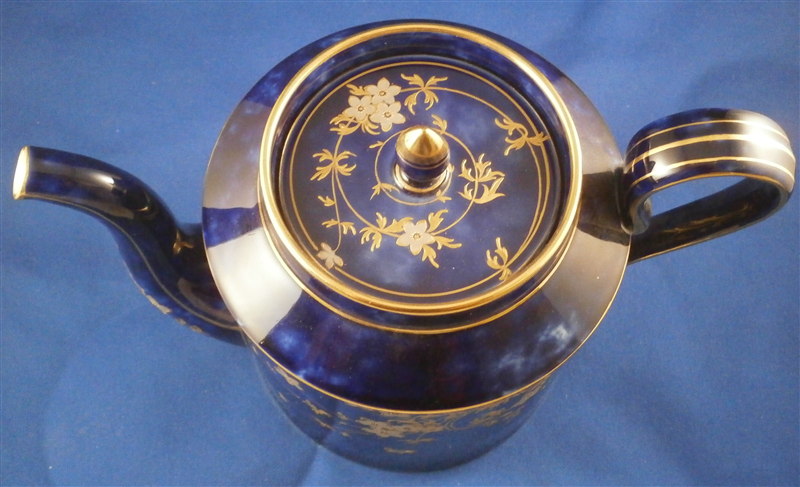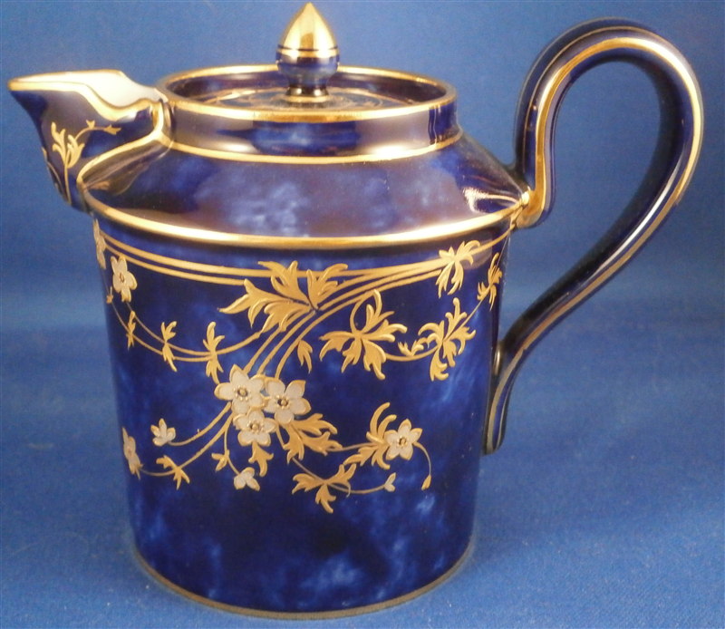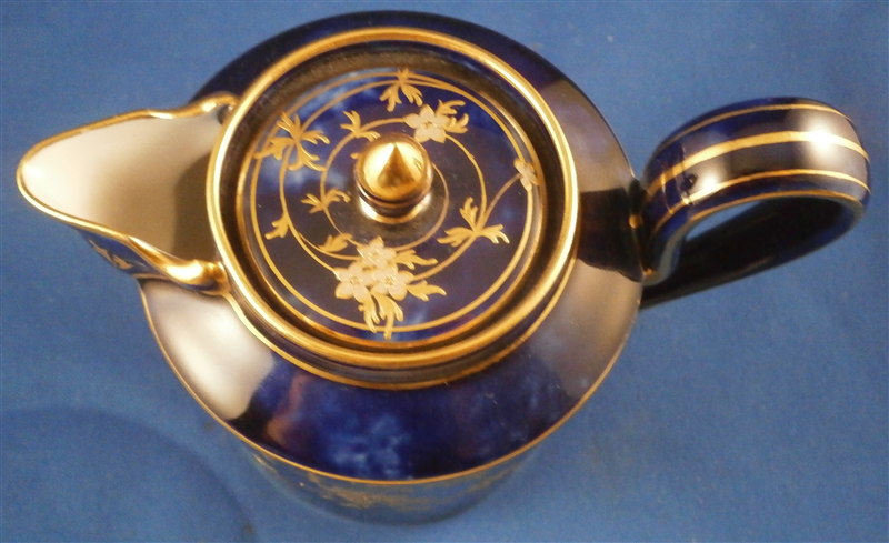 This is an amazing tea service for four people made by Sevres around 1897/1904. The set is hand painted with their famous deep blue ground color which in this case is applied unevenly which looks stunning as some areas are this rich deep cobalt blue and other are much lighter in color! The pieces have a great floral design over that ground color in gold with the blossoms having a platinum color to the petals as shown. Gold trim to the edges and handles as well as the finials. An truly stunning and elegant design! The saucer's underside rims also have that nice cobalt blue ground color and gold trim to the footring. The set consists of a tea or coffee pot with its lid, a sugar dish with its lid, a creamer with its lid and four cups with their four saucers ( I know I only show three - it looked better but the detailed pics are of the fourth set!). The set is in perfect condition except for the most minor tiny chip to the bottom edge of the teapot that is gilded in. All pieces are marked underneath as shown with a variety of dates in terms of the making of the blancs which is not unusual for Sevres as they kept white pieces in their vaults for a long time. The cups and saucers as well as the creamer and sugar dish were all made in 1895 with the cups and saucers decorated / gilded in 1897 while the rest of the set was decorated / gilded in 1904. The teapot was made in 1848 and decorated / gilded along with the rest of the main pieces in 1904. All pieces have the usual incised marks as shown and some have decorator's marks as well. The saucers are about 1.125 inches tall and 5.375 inches in diameter. The cups are about 2.625 inches tall and 2.5 inches in diameter. The creamer is 3.875 inches tall and 3 inches in diameter. The sugar dish is 4.75 inches tall and 3.875 inches in diameter. The tea pot is 5.375 inches tall and has a diameter of 4.5 inches. The nicest set by far of this period I have owned! Please email me for more information or other pictures.