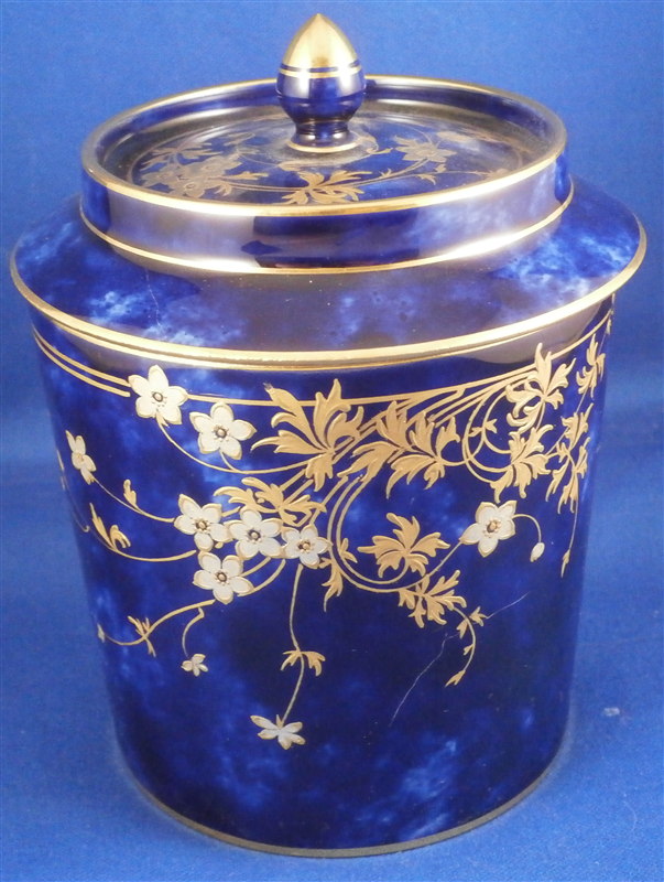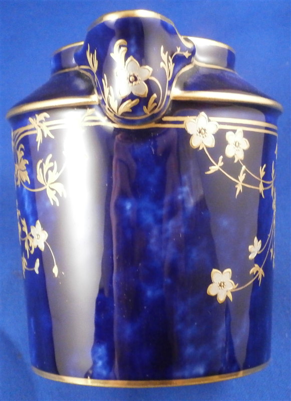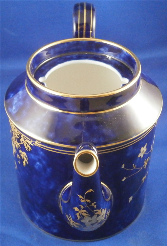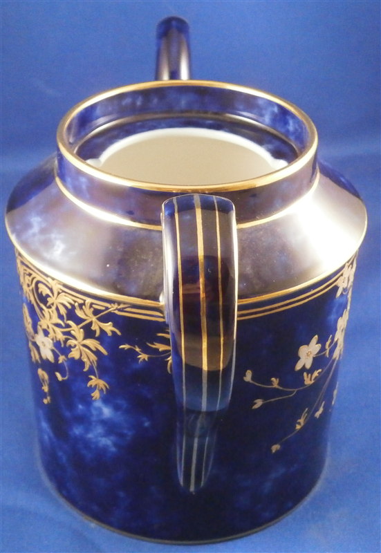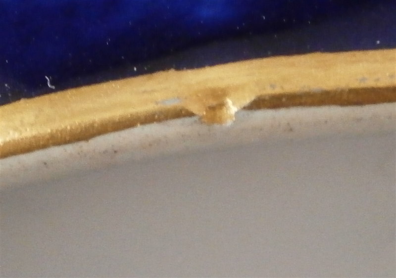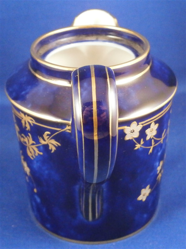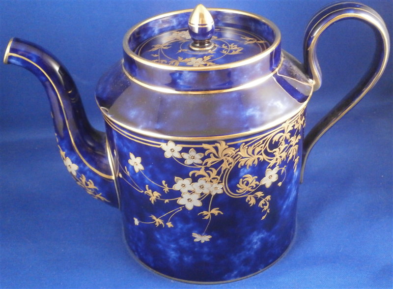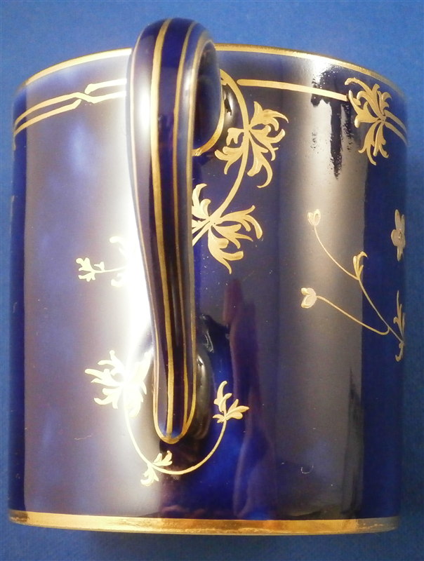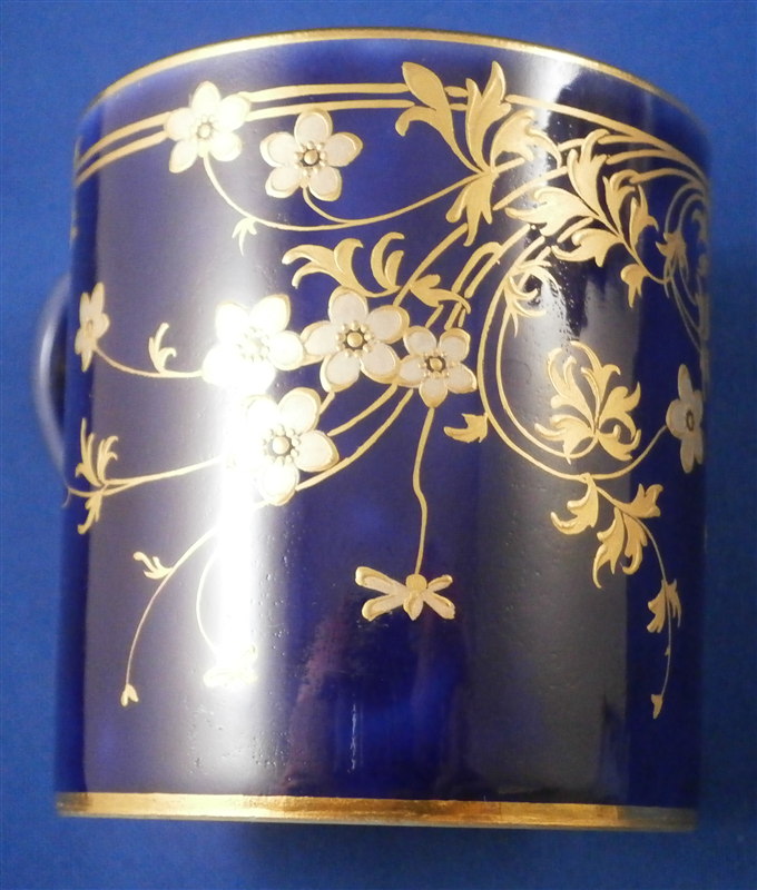 This is an amazing tea service for four people made by Sevres around 1897/1904. The set is hand painted with their famous deep blue ground color which in this case is applied unevenly which looks stunning as some areas are this rich deep cobalt blue and other are much lighter in color! The pieces have a great floral design over that ground color in gold with the blossoms having a platinum color to the petals as shown. Gold trim to the edges and handles as well as the finials. An truly stunning and elegant design! The saucer's underside rims also have that nice cobalt blue ground color and gold trim to the footring. The set consists of a tea or coffee pot with its lid, a sugar dish with its lid, a creamer with its lid and four cups with their four saucers ( I know I only show three - it looked better but the detailed pics are of the fourth set!). The set is in perfect condition except for the most minor tiny chip to the bottom edge of the teapot that is gilded in. All pieces are marked underneath as shown with a variety of dates in terms of the making of the blancs which is not unusual for Sevres as they kept white pieces in their vaults for a long time. The cups and saucers as well as the creamer and sugar dish were all made in 1895 with the cups and saucers decorated / gilded in 1897 while the rest of the set was decorated / gilded in 1904. The teapot was made in 1848 and decorated / gilded along with the rest of the main pieces in 1904. All pieces have the usual incised marks as shown and some have decorator's marks as well. The saucers are about 1.125 inches tall and 5.375 inches in diameter. The cups are about 2.625 inches tall and 2.5 inches in diameter. The creamer is 3.875 inches tall and 3 inches in diameter. The sugar dish is 4.75 inches tall and 3.875 inches in diameter. The tea pot is 5.375 inches tall and has a diameter of 4.5 inches. The nicest set by far of this period I have owned! Please email me for more information or other pictures.