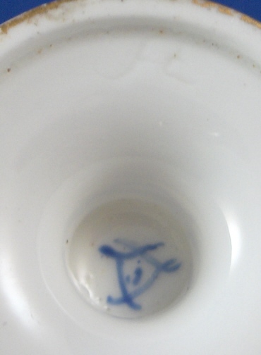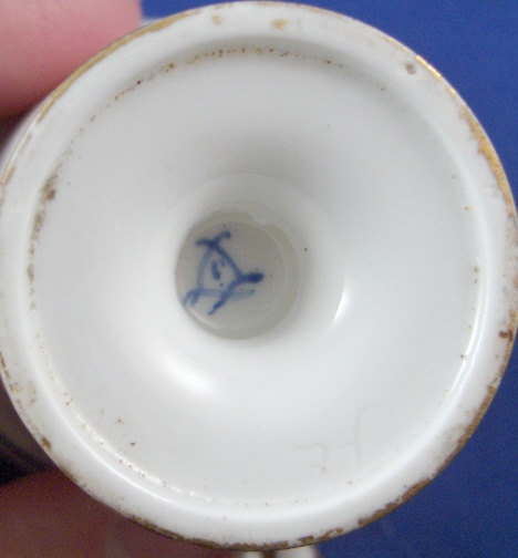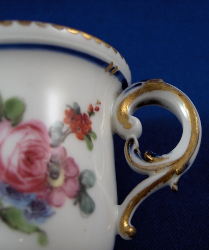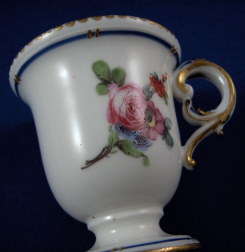 This is a rare ice cup made by Sevres around 1762. The ice cup, tasse à glace or tasse à sorbet was used as a palate cleanser between the elaborate courses of the French dinner banquets of the period. The simple, refined decoration of this cup was featured on large dinner services of the period and is a favorite of serious collectors. (No saucer or under-plate was used with the ice cup.) It is made of soft paste porcelain and is in superb condition with a tiny amount of wear to the gilding on the handle. It is the honey gold they used which has a nice color and is thickly applied. One firing flaw in the bottom inside in the form of a piece of dirt. The enamel colors of the flowers are amazing. Not flat like the Paris copies but alive looking. You can feel them with your fingers as you run over them. The piece is handpainted with a famous design by them with the flowers and the blue and gold trim. The piece is marked with the blue interlaced LL mark with the letter i or j. Also incised letter HC maybe (hard to make out). The piece is 2.5 inches tall and 2.25 inches in diameter. Please email me for more information or other pictures.