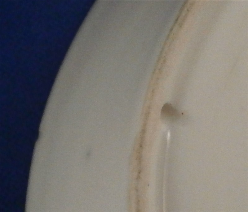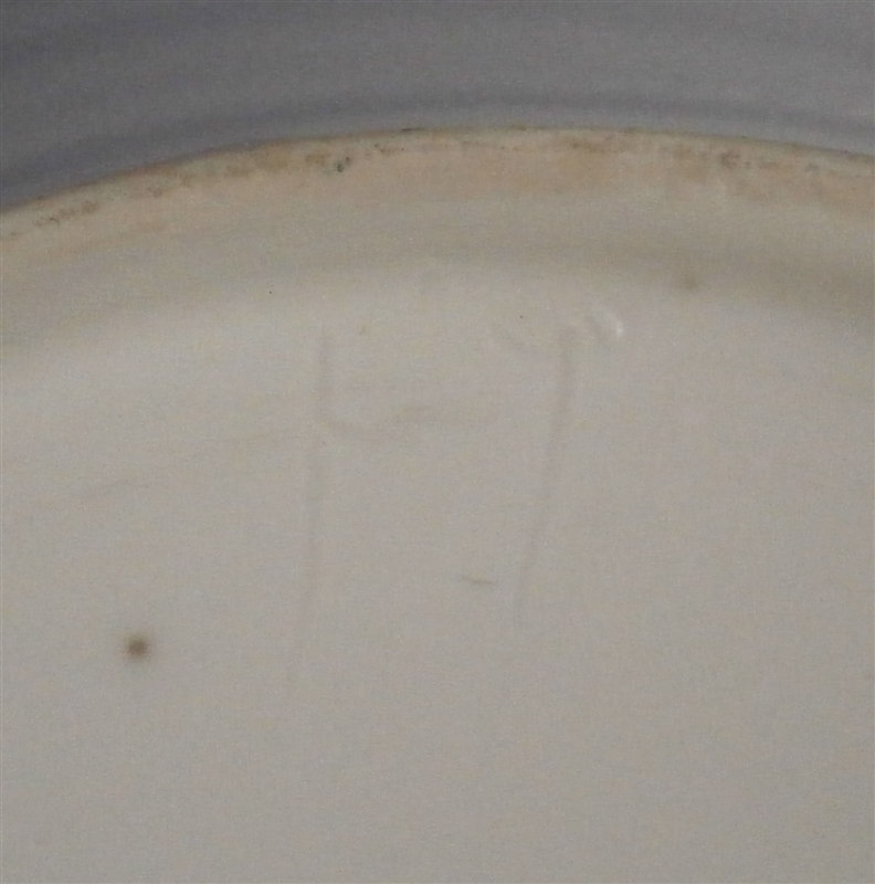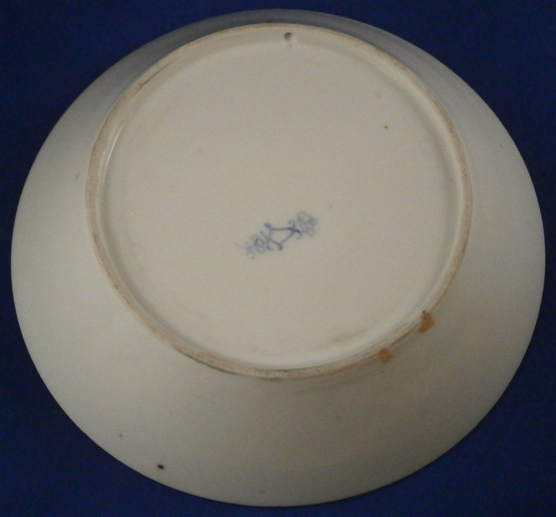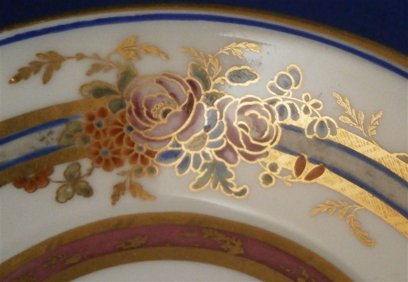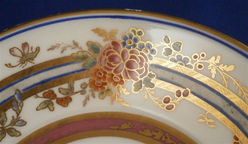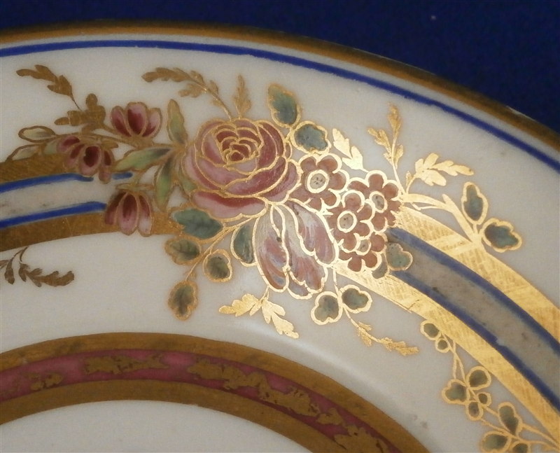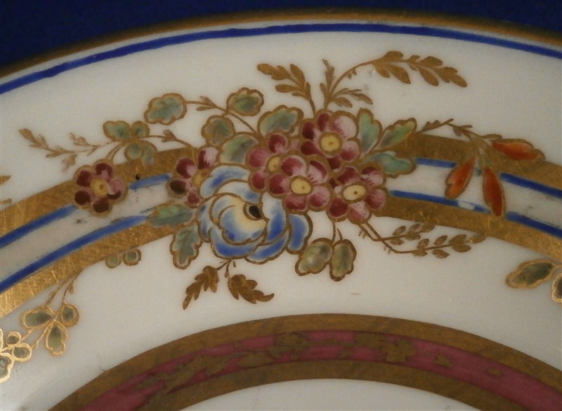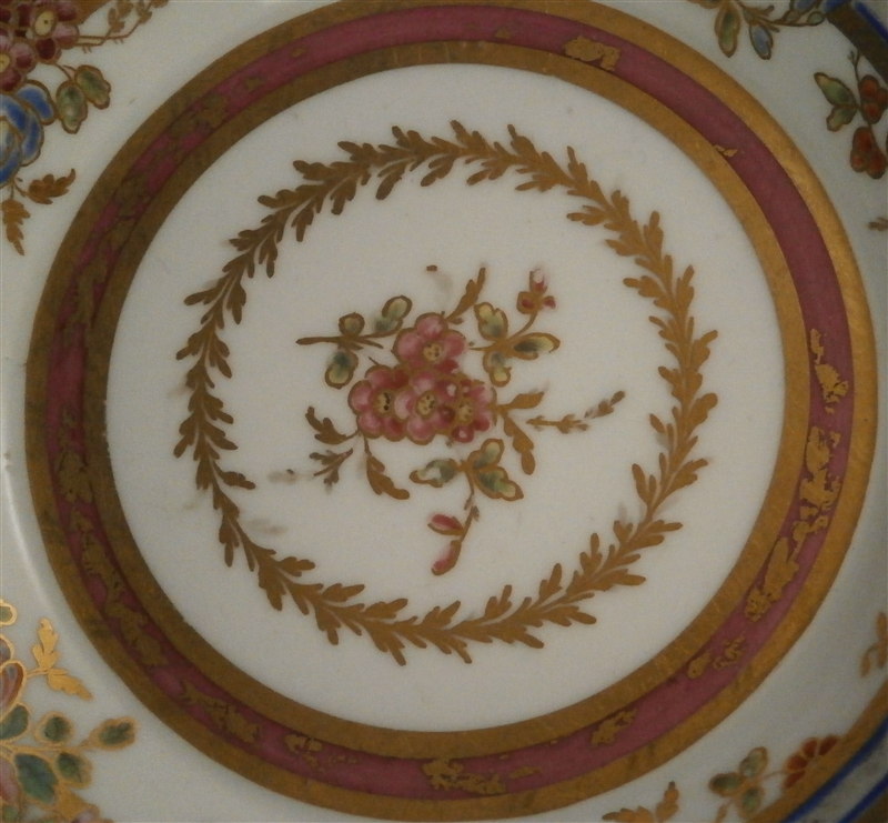 This is an interesting saucer made by Sevres in the 18th century around 1770. The piece is made of hard paste porcelain and marked as such with a fairly rare mark of the interlaced double L with the crown above and the flower below only used on some of the hard paste pieces. Not sure why! The saucer It is hand painted with a superb design including floral arrangements highlighted with gilding, blue and gold bands as well as a pink band and more gilding. Quite the fancy design! The saucer is in great condition with some wear mostly to the gilding on the pink band and a minute outside edge chip as shown. The saucer is marked as mentioned above as well as with an incised F7 or something along those lines. It has the hole for hanging in the kiln near the foot rim as shown. The saucer is 1.125 inches tall and 4.875 inches in diameter. Please email me for more information or other pictures.