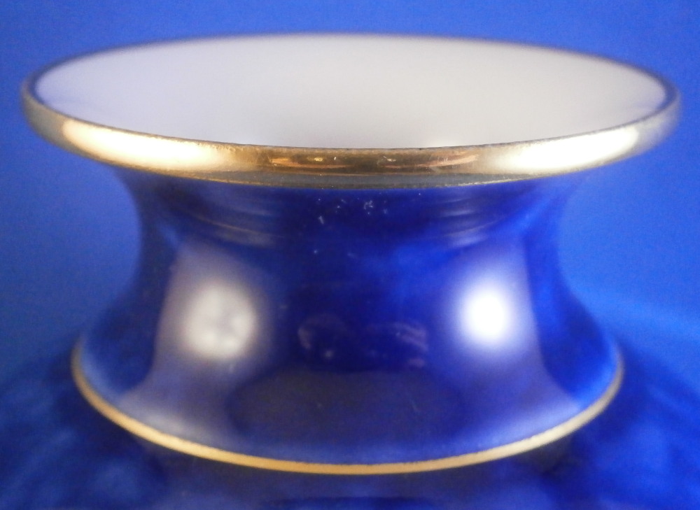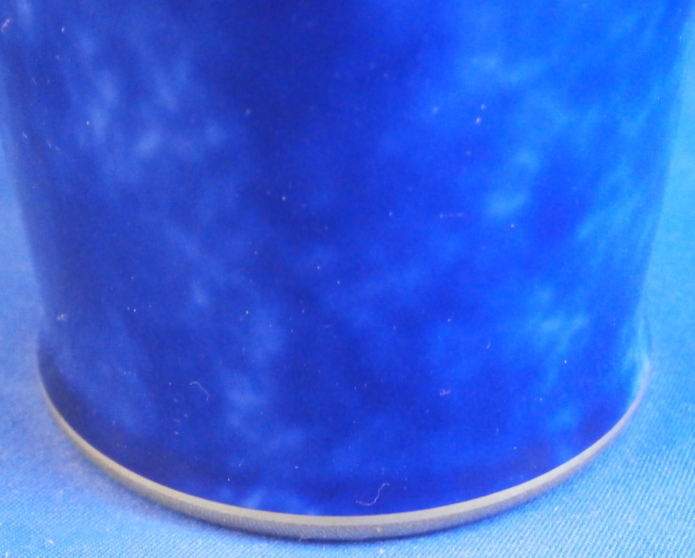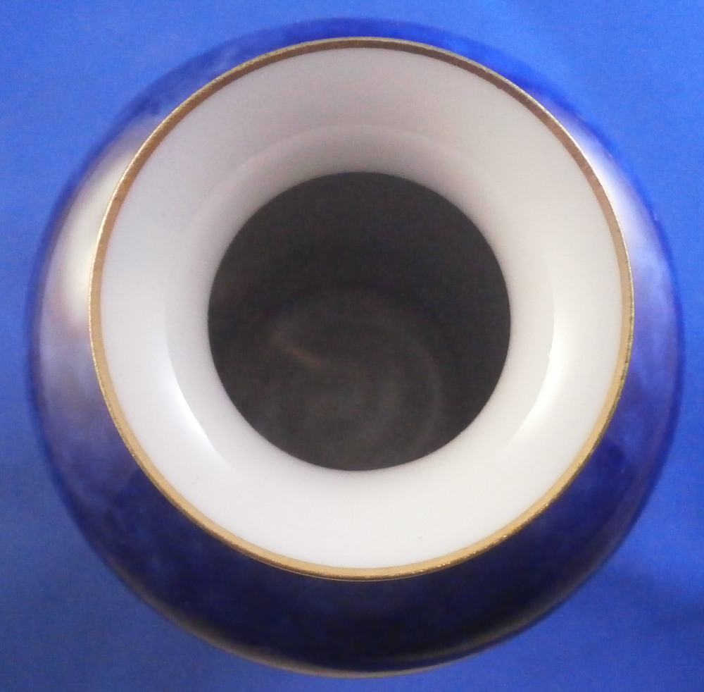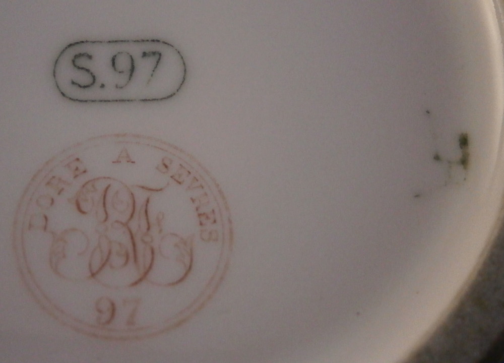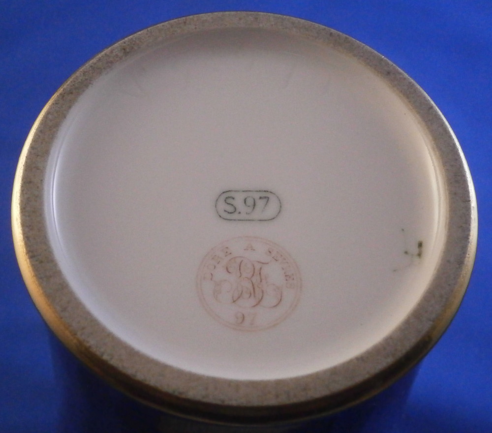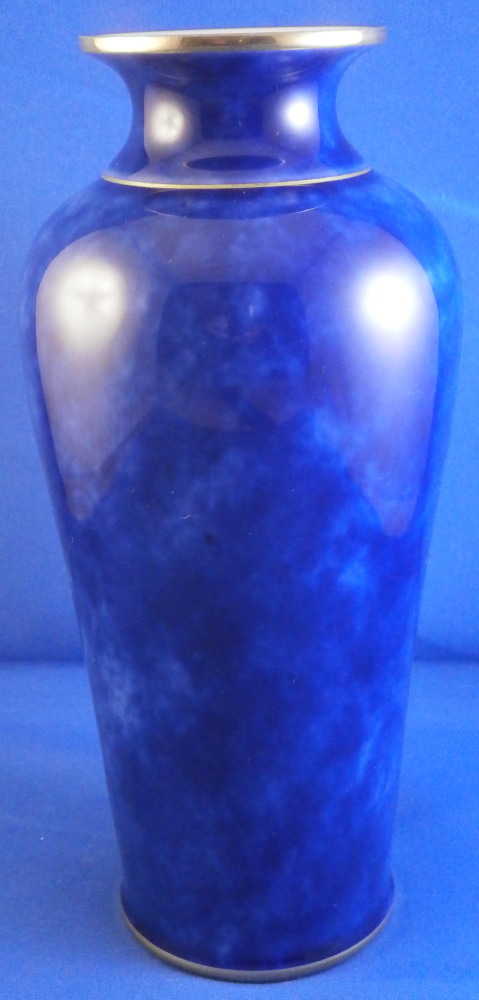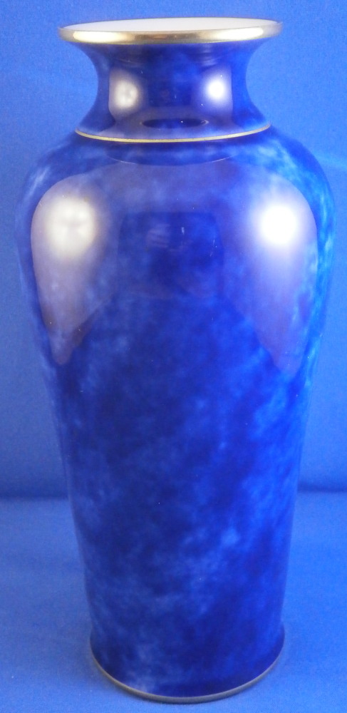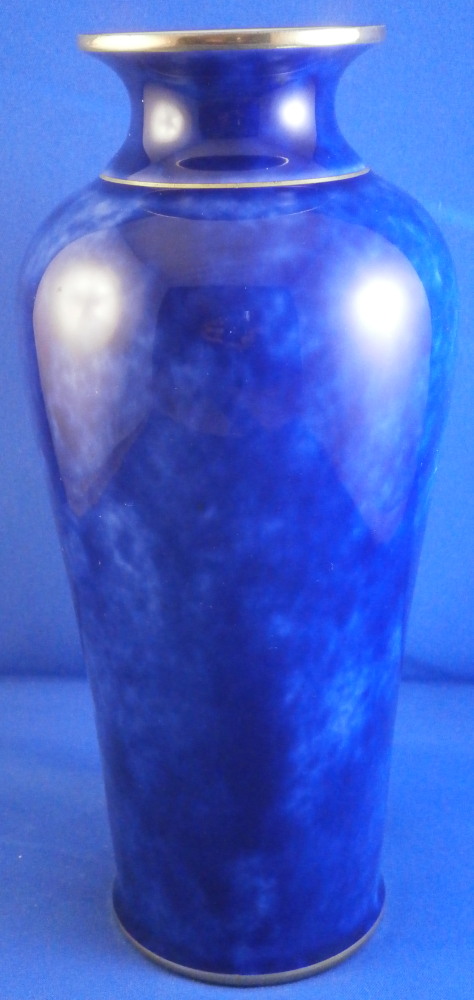 This is a superb little vase made by Sevres in 1897. It is covered in a mottled deep cobalt blue color meant to imitate Lapis Lazuli and has a simple gold trim along the top, bottom and shoulder edge. Really a very elegant looking example! The vase is in great condition with some very minor scratches to the clear glaze. It displays perfectly and looks amazing! It is marked underneath with the S.97 oval mark in green as well as their red Dore a Sevres circular mark with the year mark 97 in it and an artist mark near the foot ring plus the usual incised marks underneath as shown. The vase is7.75 inches tall and 3.5 inches in diameter. The top has a diameter of just over 2.25 inches. Please email me for more information or other pictures.