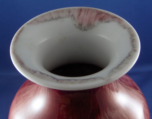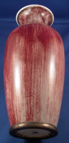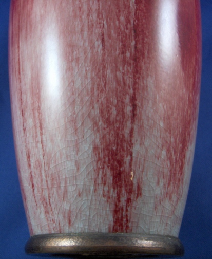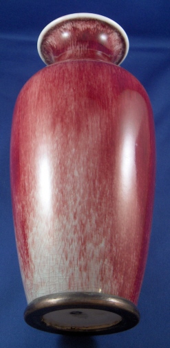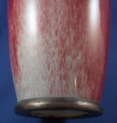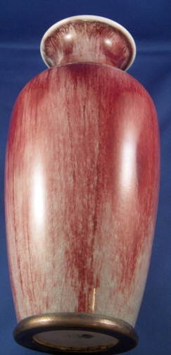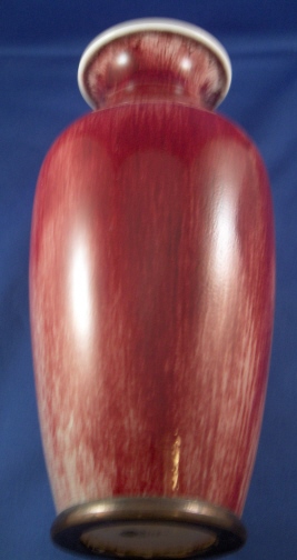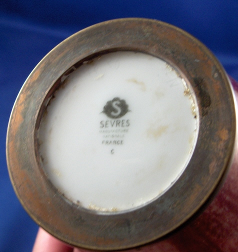 This is a vase made by Sevres around 1930. It is covered with their famous and quite rare oxblood glaze in mostly red with the light bluish white coming through in areas. This is truly an amazing glaze! The vase is in perfect condition but it does have some crazing in the clear outer glaze which is quite normal on this type of glaze. It is marked underneath with the S over Sevres Manufacture Nationale France and the letter C. There are also quite a few incised marks underneath near the rim but I cannot make them out well. The bottom has a nice bronze or brass trim attached to it. The vase is rather large for an oxblood piece being 9.125 inches tall and 4 inches in diameter. Please email me for more information or other pictures.