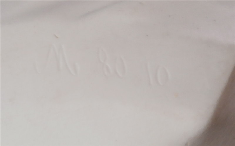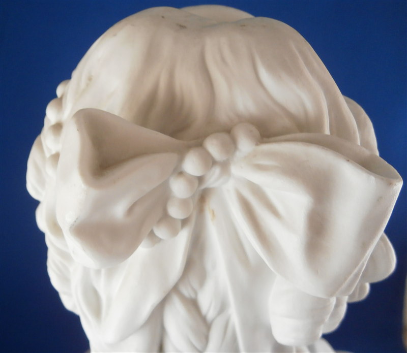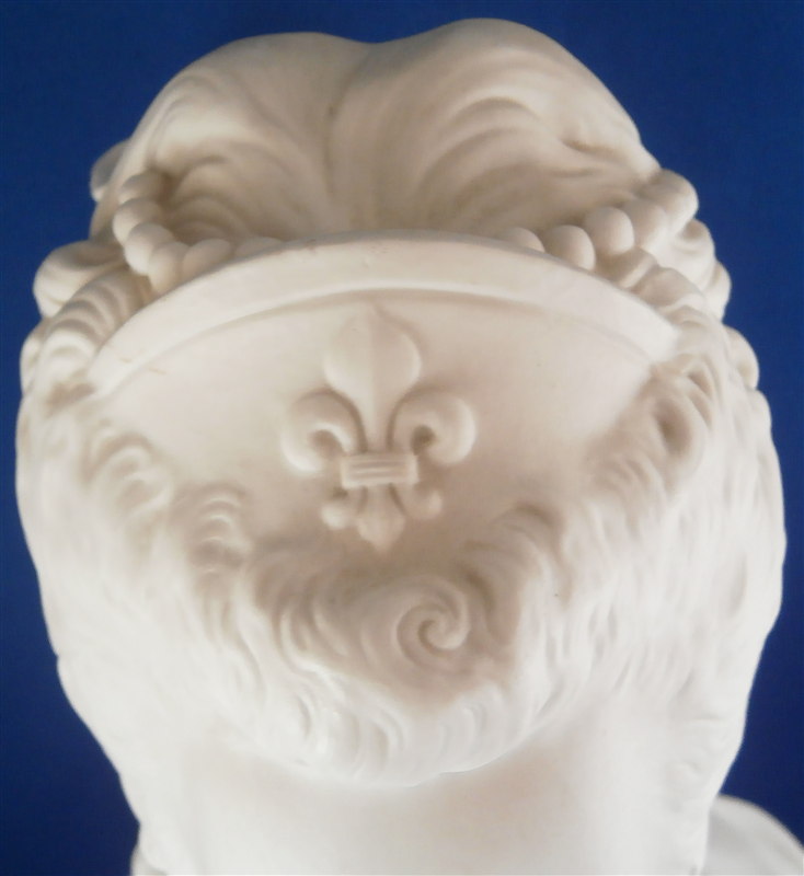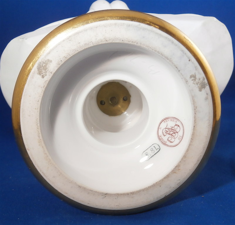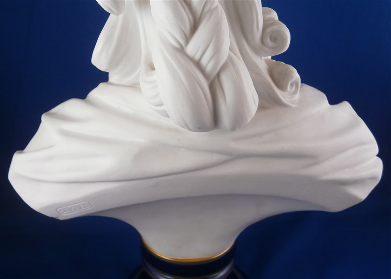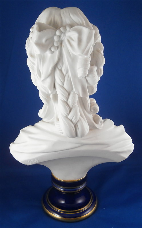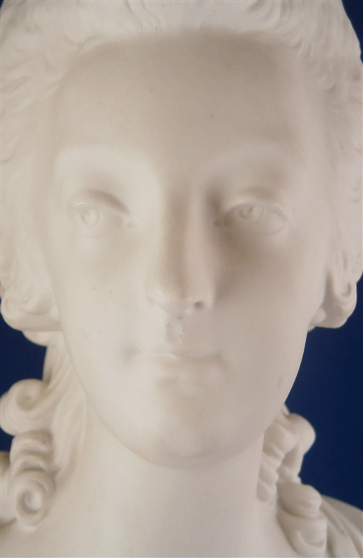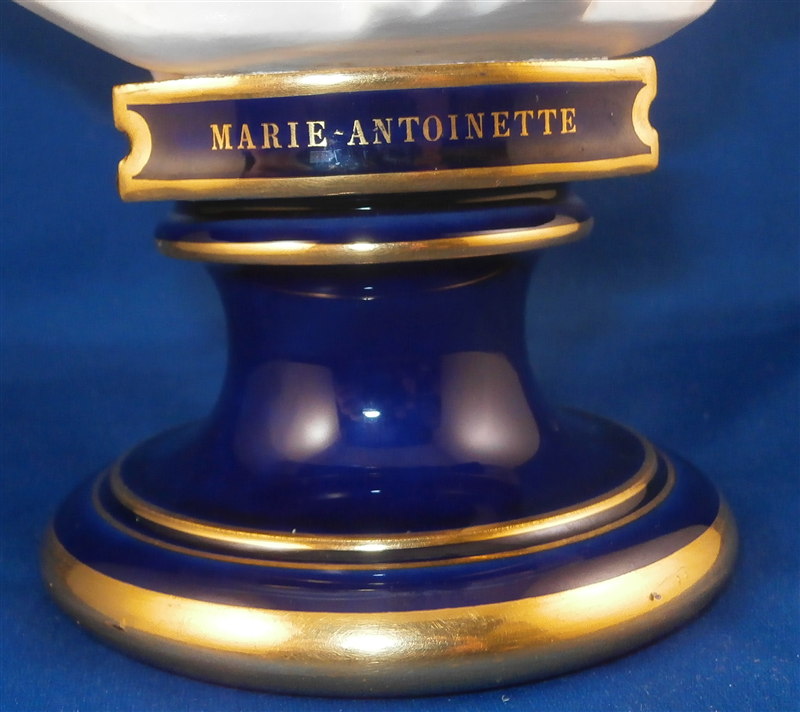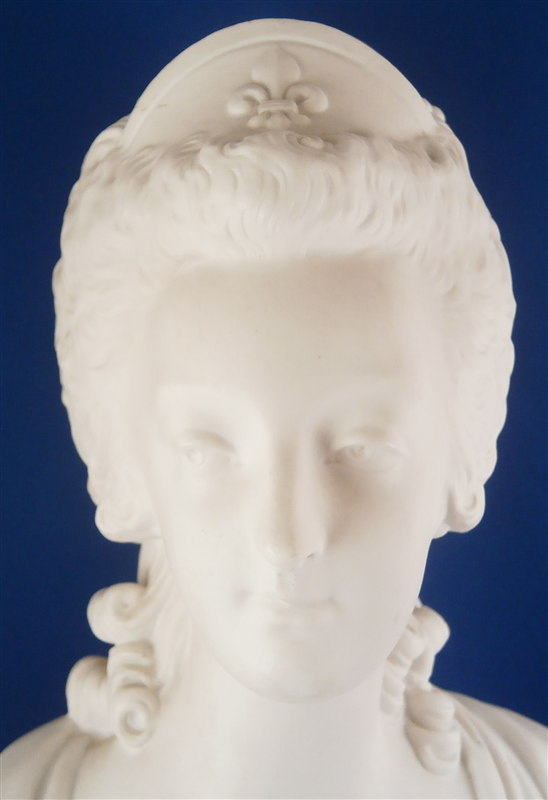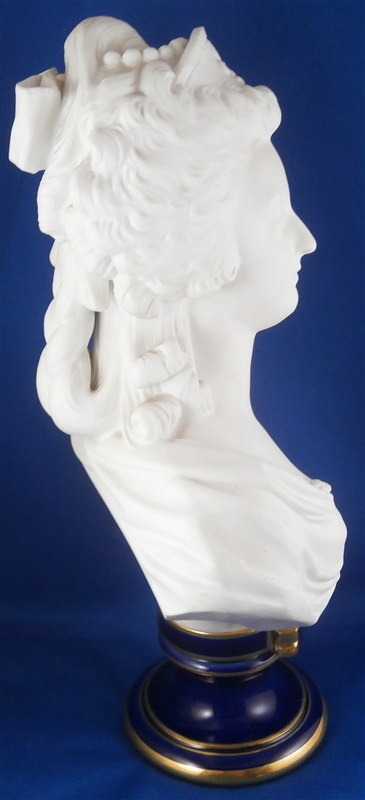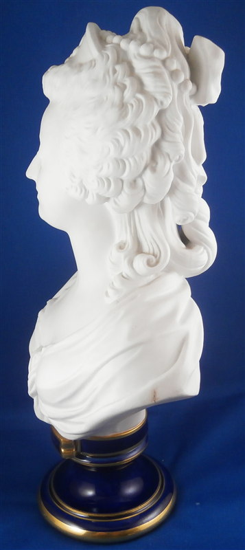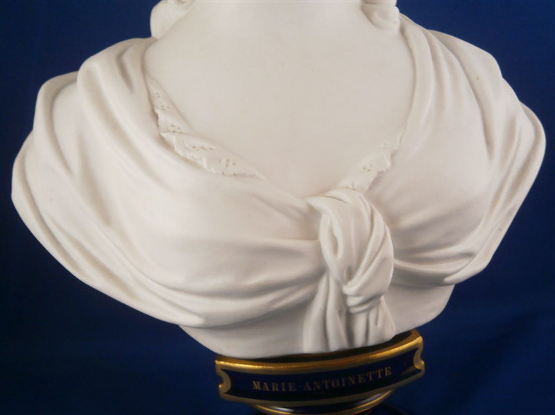 This is a large biscuit figurine of the famous Marie Antoinette made by Sevres in 1881. The bust is made of unglazed bisque or biscuit porcelain and is extremely well modeled with lots of superb details. A stunning piece and the blue ground colored base with the gold trim only brings it out even more. Just in case on didn't know who she was her name is on the front of the base :) The piece is in perfect condition with two or three extremely minor chips that look to be mostly from the manufacturing process. A bit of dirt in a spot or two but all in all about as good an example as you can find! The bust is marked on the back by her shoulders with the impressed Sevres mark as well as the letter M 80 10. The base has the green Sevres mark year mark 81 in an oval type shape as well as the red gilder's mark and the usual incised marks of this period. She is 12.5 inches tall, about 7 inches wide and 4 inches deep. I have the matching bust of her husband Louis 16th as well and it is almost impossible to find the pair! Please email me for more information or other pictures.