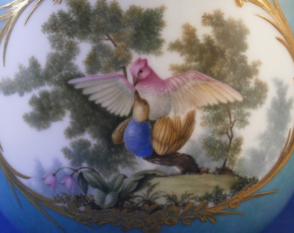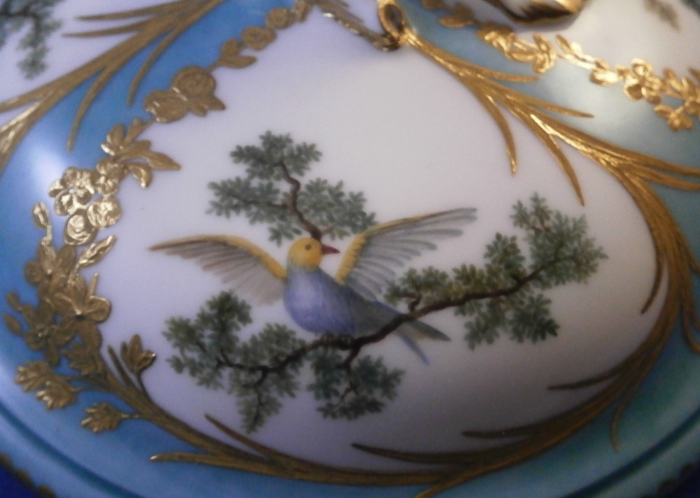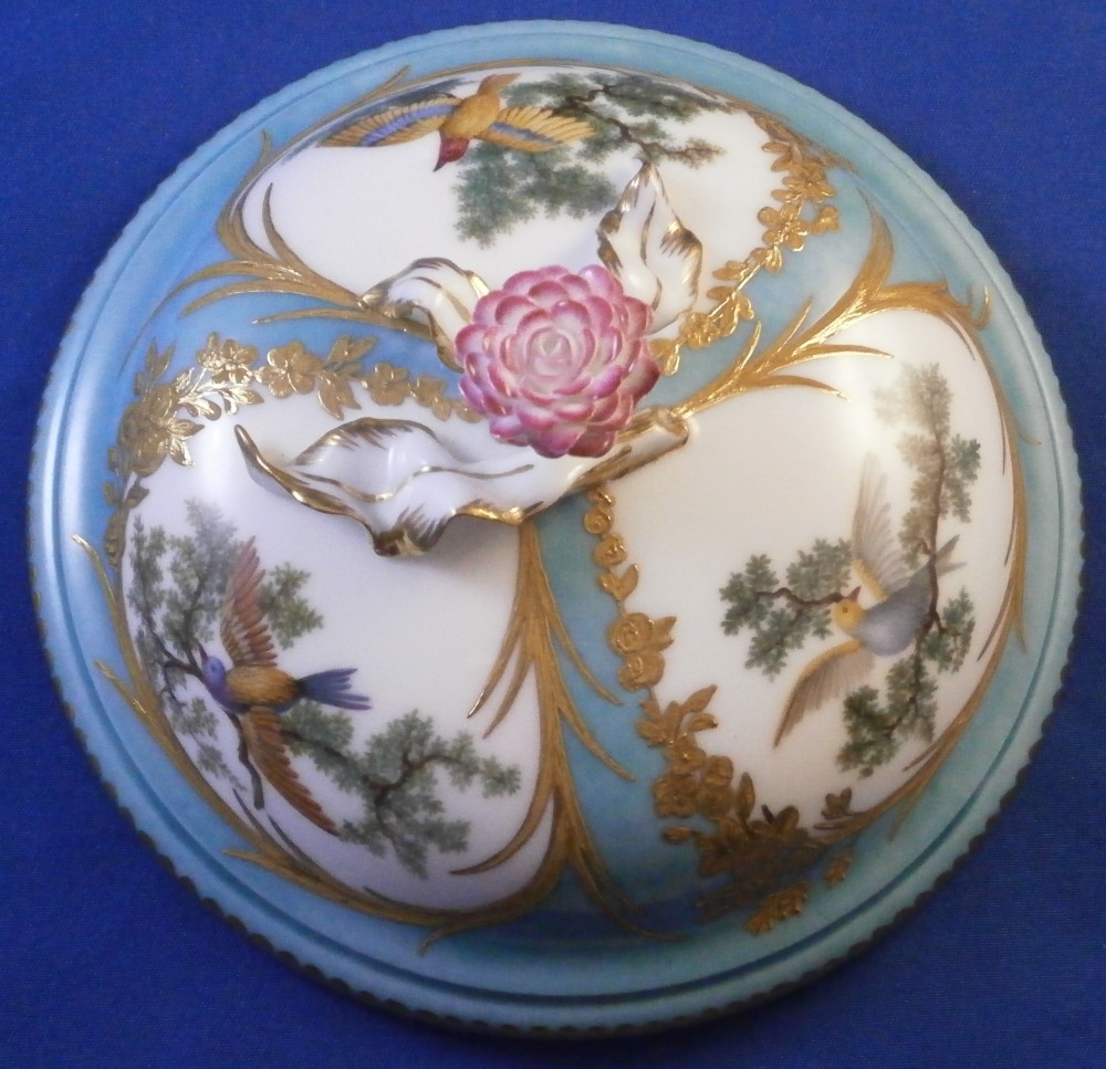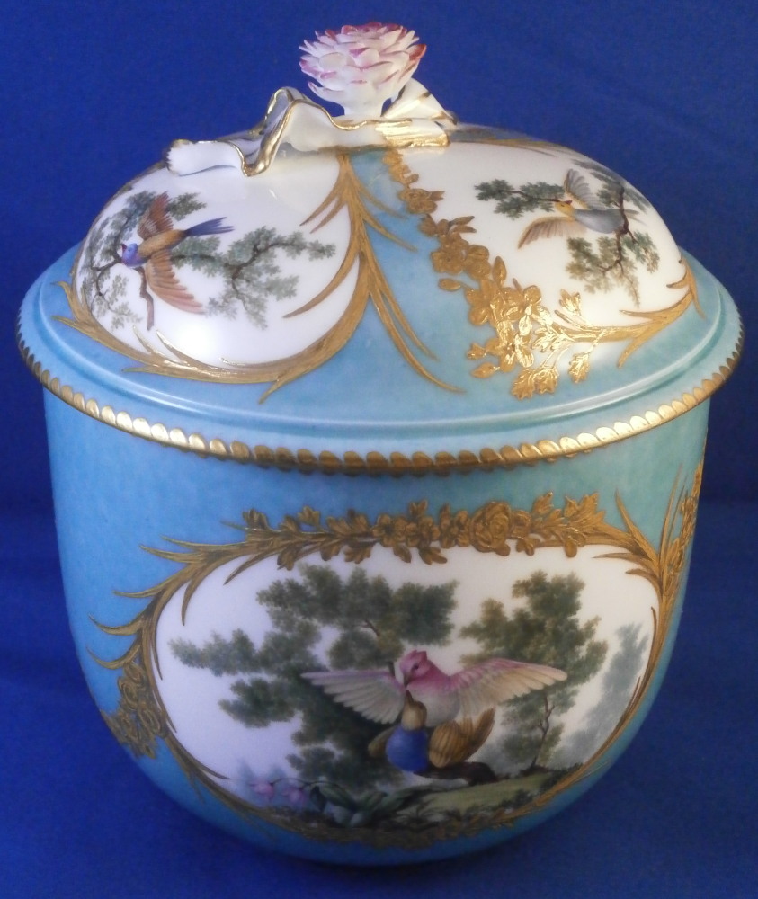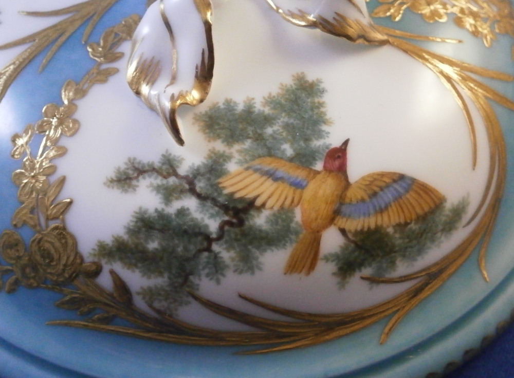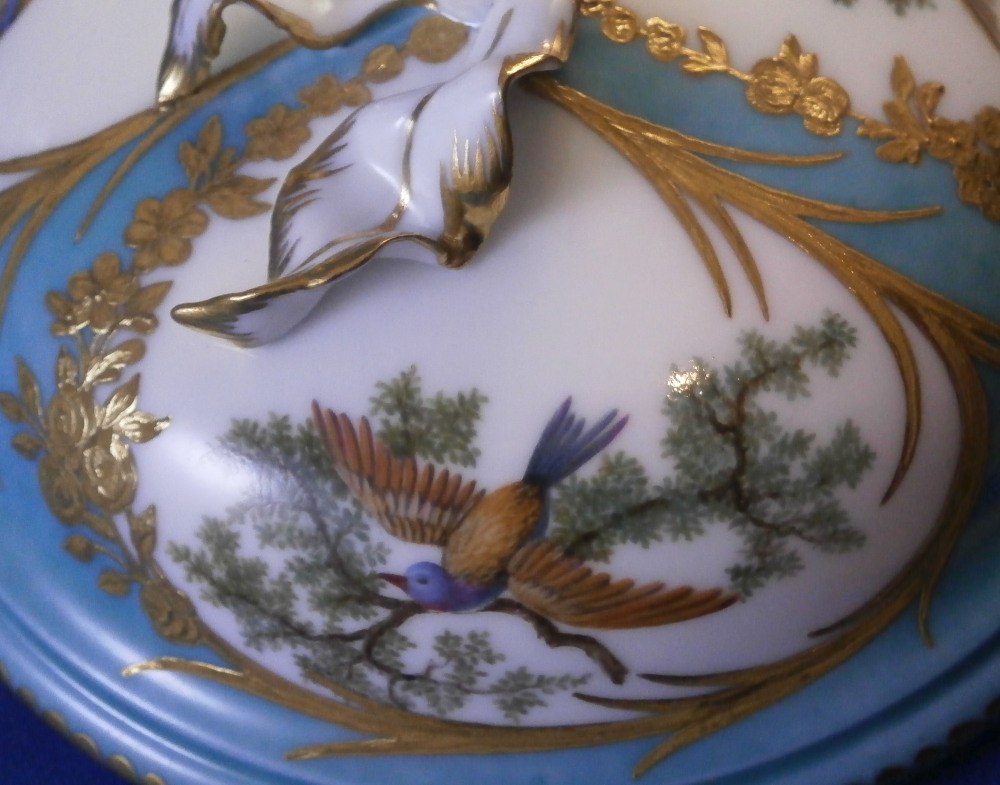 This is an amazing lidded dish made by Sevres in the later 20th century or to be more exact in 1995. I guess this would be considered a giant sugar bowl but could be used for a number of things due to its nice size. If you like 18th century Sevres but want an absolutely perfect example (which does not exist from back then) this is your best option here :) The dish is decorated with a superb turquoise ground color with two hand painted polychrome bird scenes on white ground on the main body and three on the lid. Each scene on the main body has two birds in a landscape surrounding while the ones on the lid have a single bird in a landscape surrounding. Each scene is surrounded with the most amazing gold trim of flowers with lots of tooled details. Gold trim to the edges and a really nice floral finial to the lid including three leaves with gold highlights and a superb pink blossom. A little buttefly to the inside probably to hide a tiny firing imperfection. It really does not get any better than this and I have not seen a redo of an 18th century piece before so they cannot be common at all. A truly stunning piece!!! Both pieces are perfect condition. The main body is marked underneath as shown with the green Sevres 95 mark as shown as well as the Dore et Decore a Sevres mark in red, an artist mark plus the usual incised marks to the paste as would expect on an original piece from this period as shown. The dish including the lid is 5.625 inches tall and 4.75 inches in diameter. Please email me for more information or other pictures.