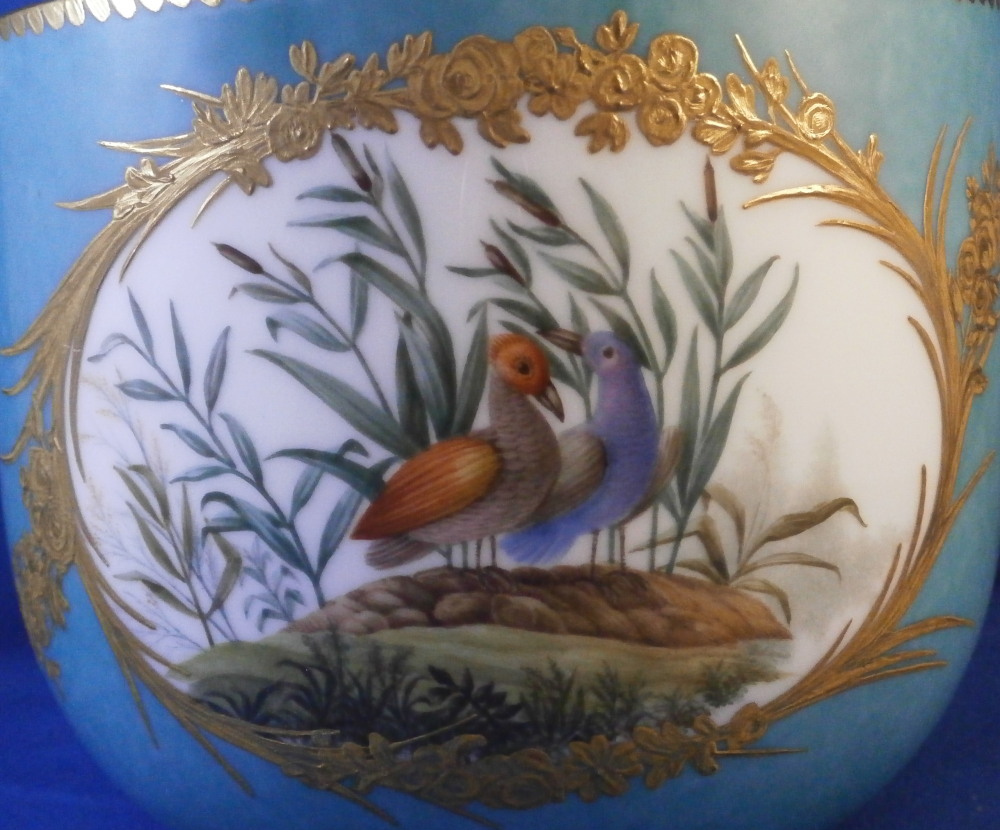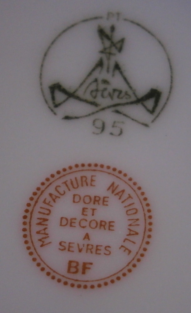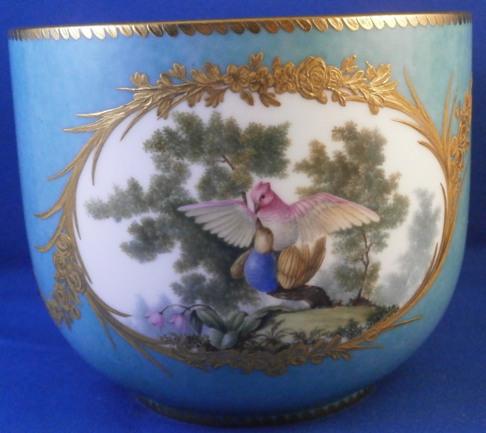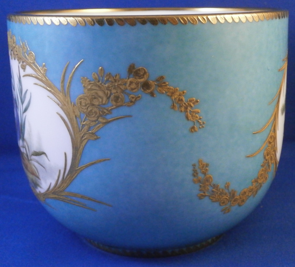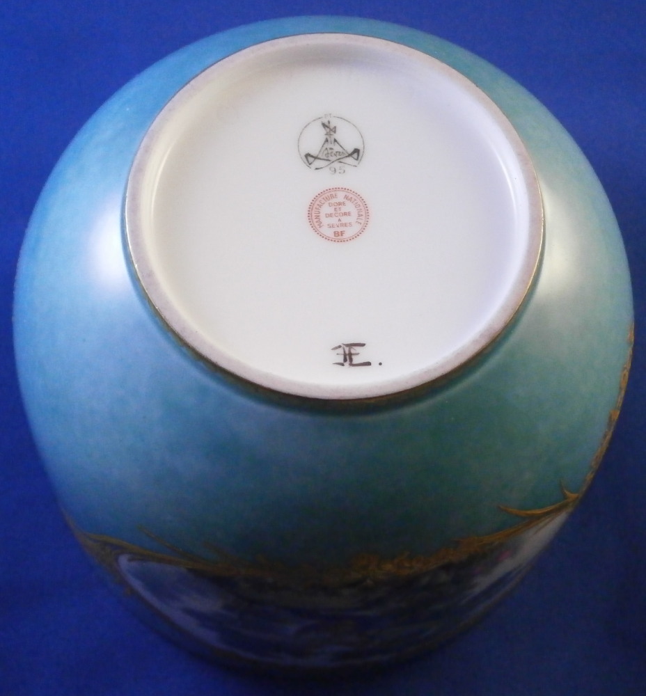 This is an amazing lidded dish made by Sevres in the later 20th century or to be more exact in 1995. I guess this would be considered a giant sugar bowl but could be used for a number of things due to its nice size. If you like 18th century Sevres but want an absolutely perfect example (which does not exist from back then) this is your best option here :) The dish is decorated with a superb turquoise ground color with two hand painted polychrome bird scenes on white ground on the main body and three on the lid. Each scene on the main body has two birds in a landscape surrounding while the ones on the lid have a single bird in a landscape surrounding. Each scene is surrounded with the most amazing gold trim of flowers with lots of tooled details. Gold trim to the edges and a really nice floral finial to the lid including three leaves with gold highlights and a superb pink blossom. A little buttefly to the inside probably to hide a tiny firing imperfection. It really does not get any better than this and I have not seen a redo of an 18th century piece before so they cannot be common at all. A truly stunning piece!!! Both pieces are perfect condition. The main body is marked underneath as shown with the green Sevres 95 mark as shown as well as the Dore et Decore a Sevres mark in red, an artist mark plus the usual incised marks to the paste as would expect on an original piece from this period as shown. The dish including the lid is 5.625 inches tall and 4.75 inches in diameter. Please email me for more information or other pictures.