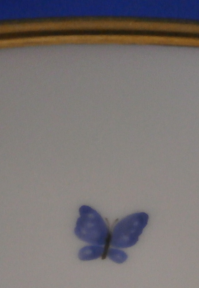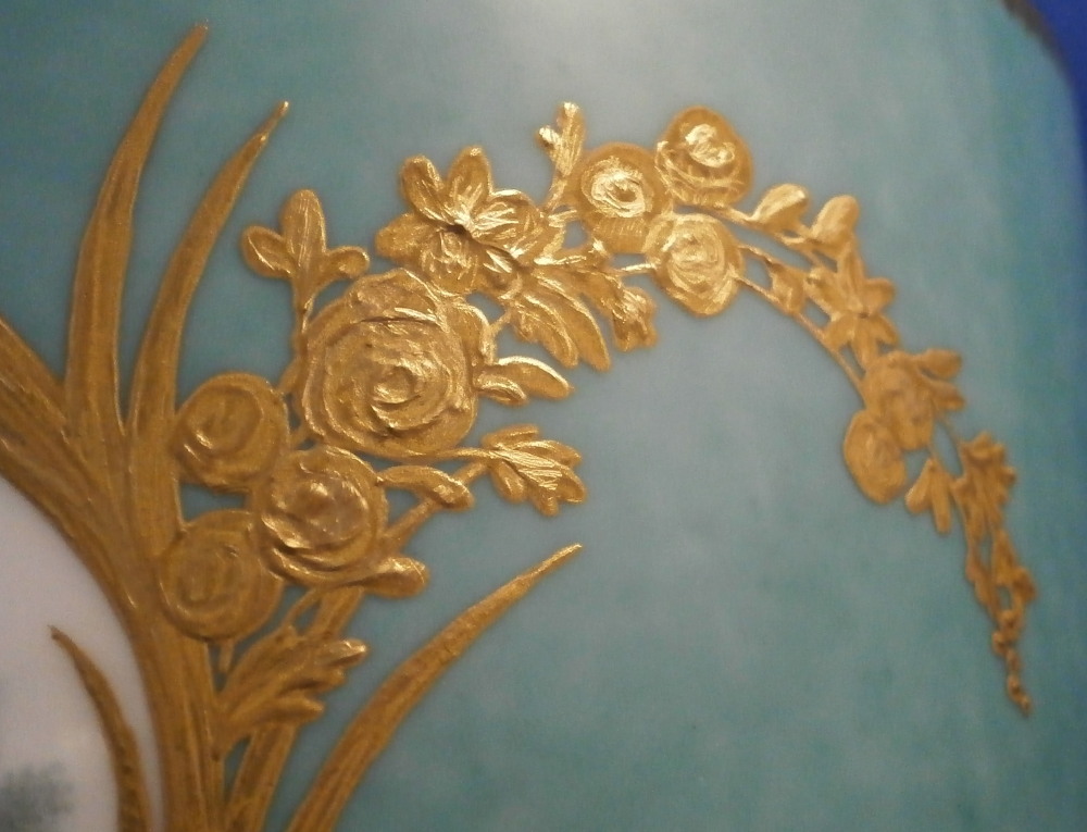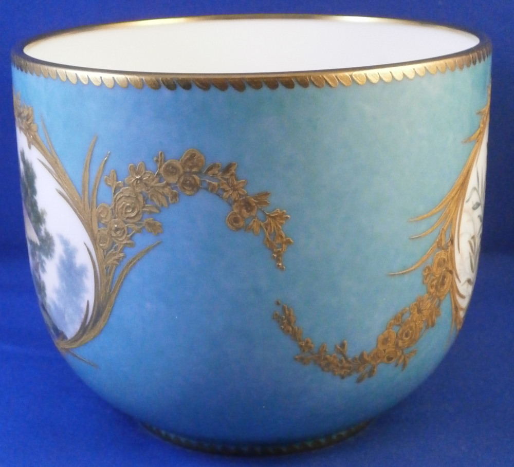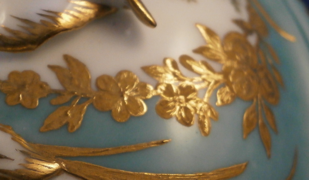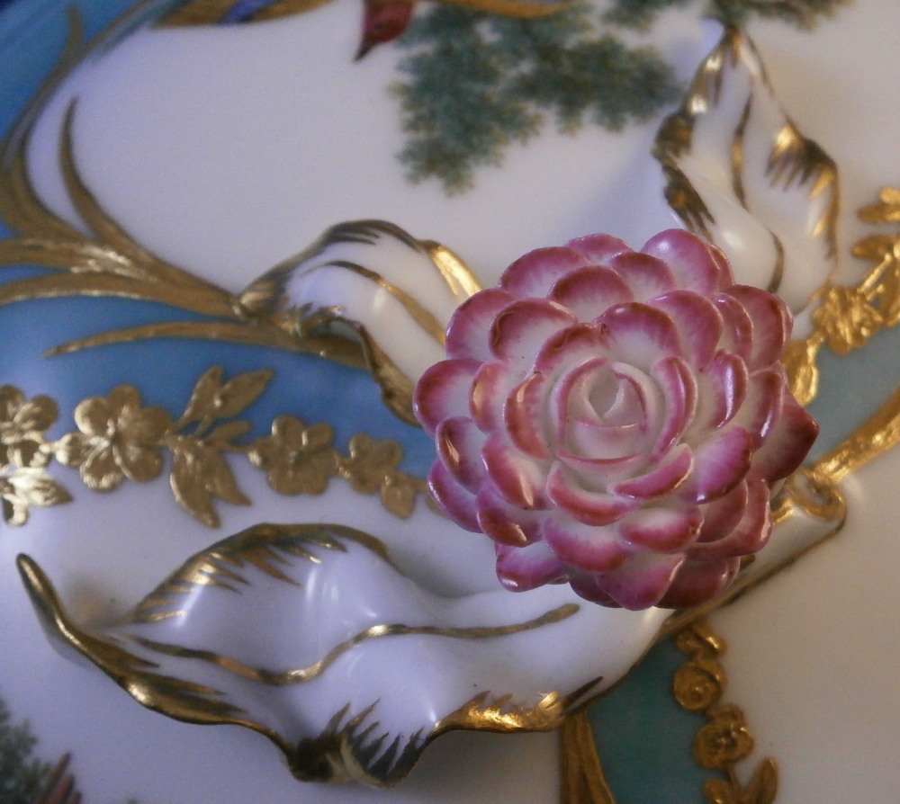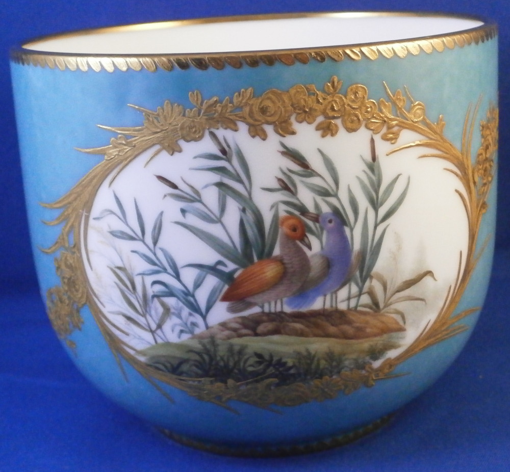 This is an amazing lidded dish made by Sevres in the later 20th century or to be more exact in 1995. I guess this would be considered a giant sugar bowl but could be used for a number of things due to its nice size. If you like 18th century Sevres but want an absolutely perfect example (which does not exist from back then) this is your best option here :) The dish is decorated with a superb turquoise ground color with two hand painted polychrome bird scenes on white ground on the main body and three on the lid. Each scene on the main body has two birds in a landscape surrounding while the ones on the lid have a single bird in a landscape surrounding. Each scene is surrounded with the most amazing gold trim of flowers with lots of tooled details. Gold trim to the edges and a really nice floral finial to the lid including three leaves with gold highlights and a superb pink blossom. A little buttefly to the inside probably to hide a tiny firing imperfection. It really does not get any better than this and I have not seen a redo of an 18th century piece before so they cannot be common at all. A truly stunning piece!!! Both pieces are perfect condition. The main body is marked underneath as shown with the green Sevres 95 mark as shown as well as the Dore et Decore a Sevres mark in red, an artist mark plus the usual incised marks to the paste as would expect on an original piece from this period as shown. The dish including the lid is 5.625 inches tall and 4.75 inches in diameter. Please email me for more information or other pictures.