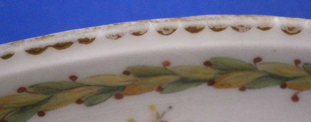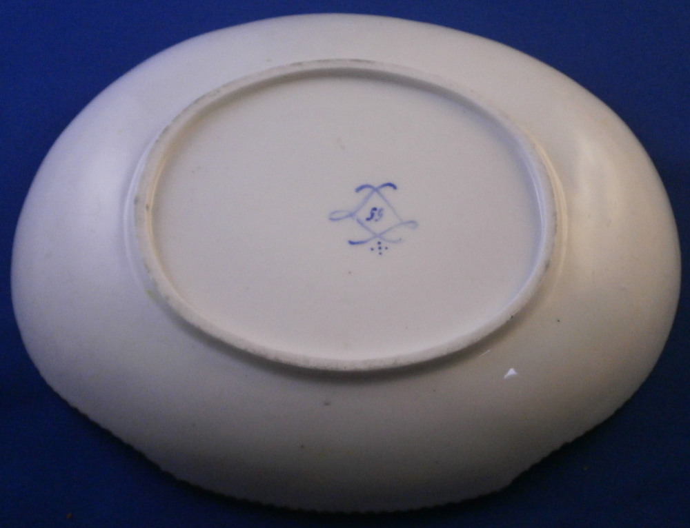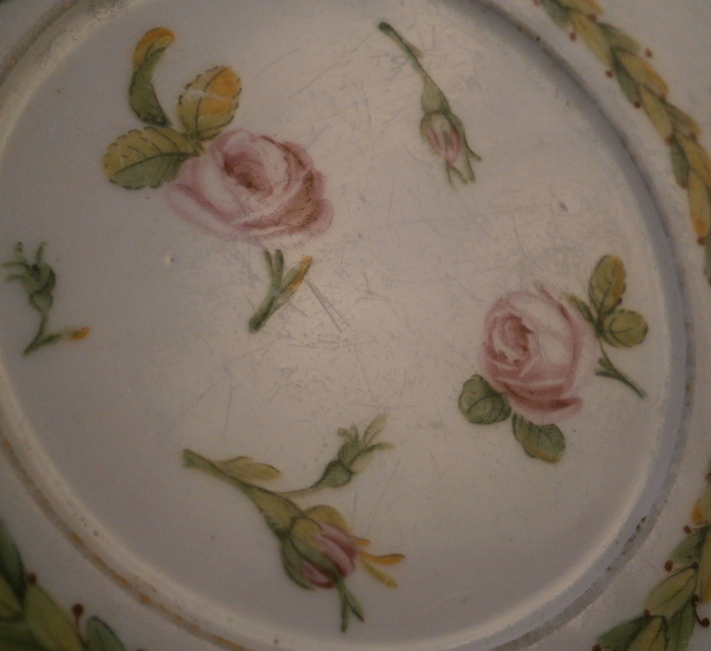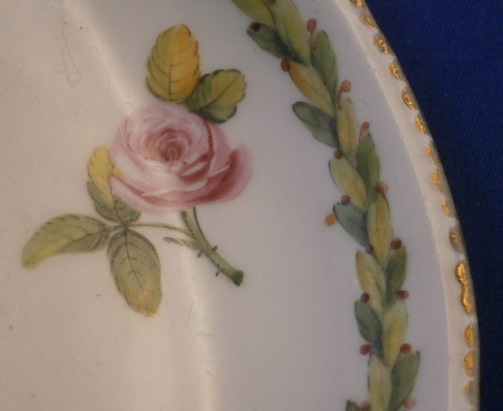 This is an interesting saucer dish made by Sevres in the 18th century- 1784 to be exact. Not entirely sure what this saucer would be for but possibly a sugar dish though the ones I could find were larger so it might be for something else. Either way the piece is hand painted with some really nice roses including buds and leaves as well as a leaf garland to the rim and around the well. Gold trim to the edge and well edge. The enamels on soft paste porcelain are stunning - much nicer than hard paste if you have never owned a piece. The dish is marked underneath with the interlaced L mark in blue with the date code GG for 1784 and the painter's mark for Fontaine (J.) who painted at the factory from 1752 until 1807 - a very long time! Typical incised marks to the paste though I cannot make them out and the little hole from the firing process. The saucer is in good condition withwear to the gilding and use marks to the enamels mainly in the center well area. That is normal on soft paste peices as they wore much more easily. The piece displays very well. If anyone out there knows what type of saucer this it I would appreciate a quite note. The saucer is 1.25 inches tall, 7 inches wide and 5.5 inches deep. Please email me for more information or other pictures.
