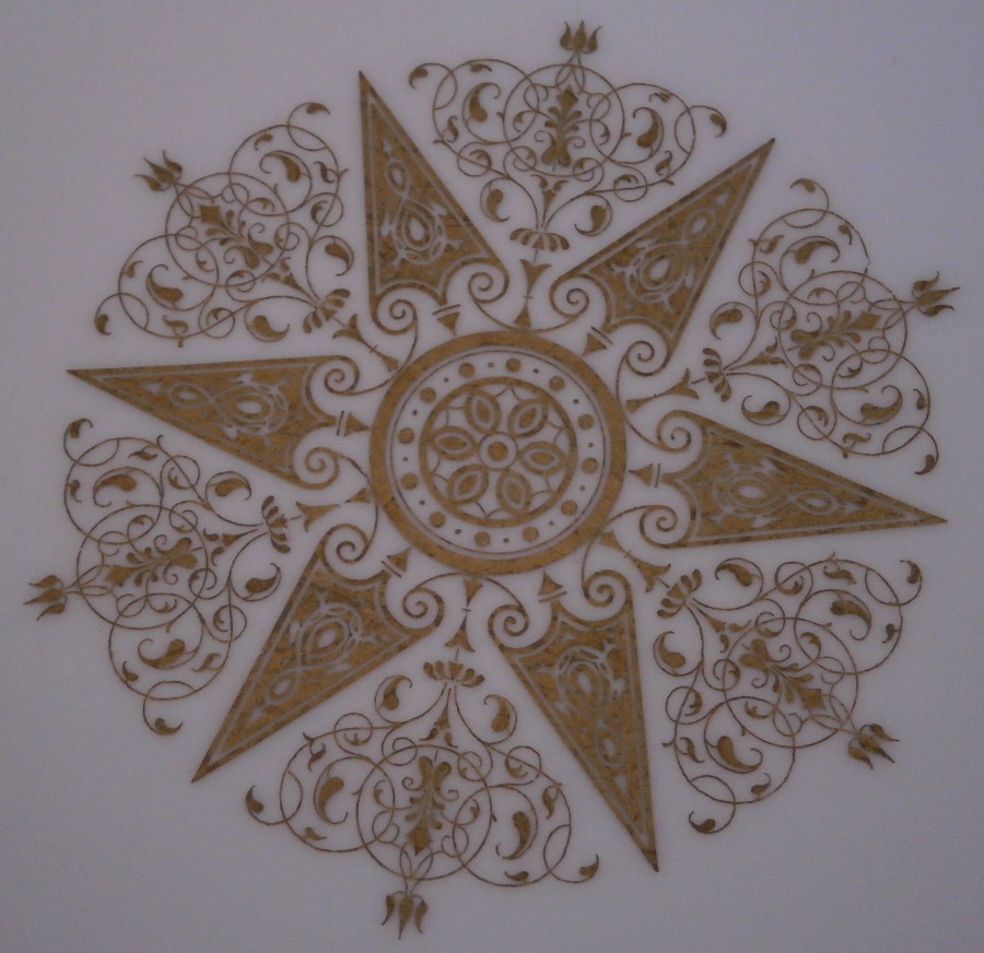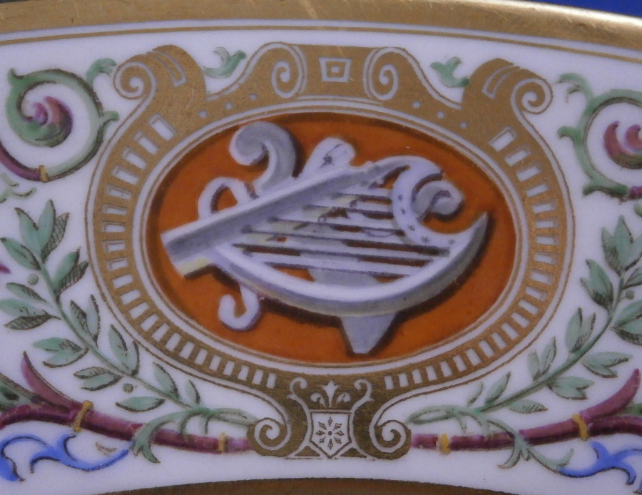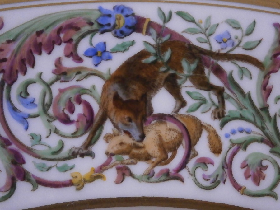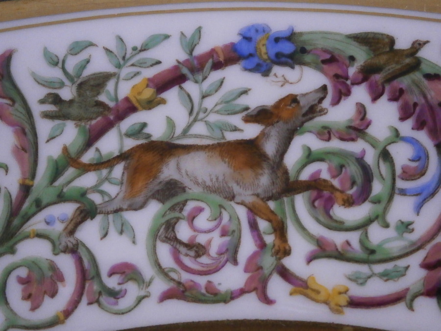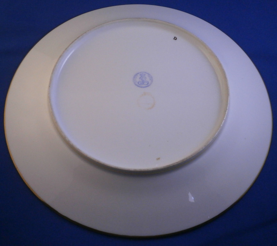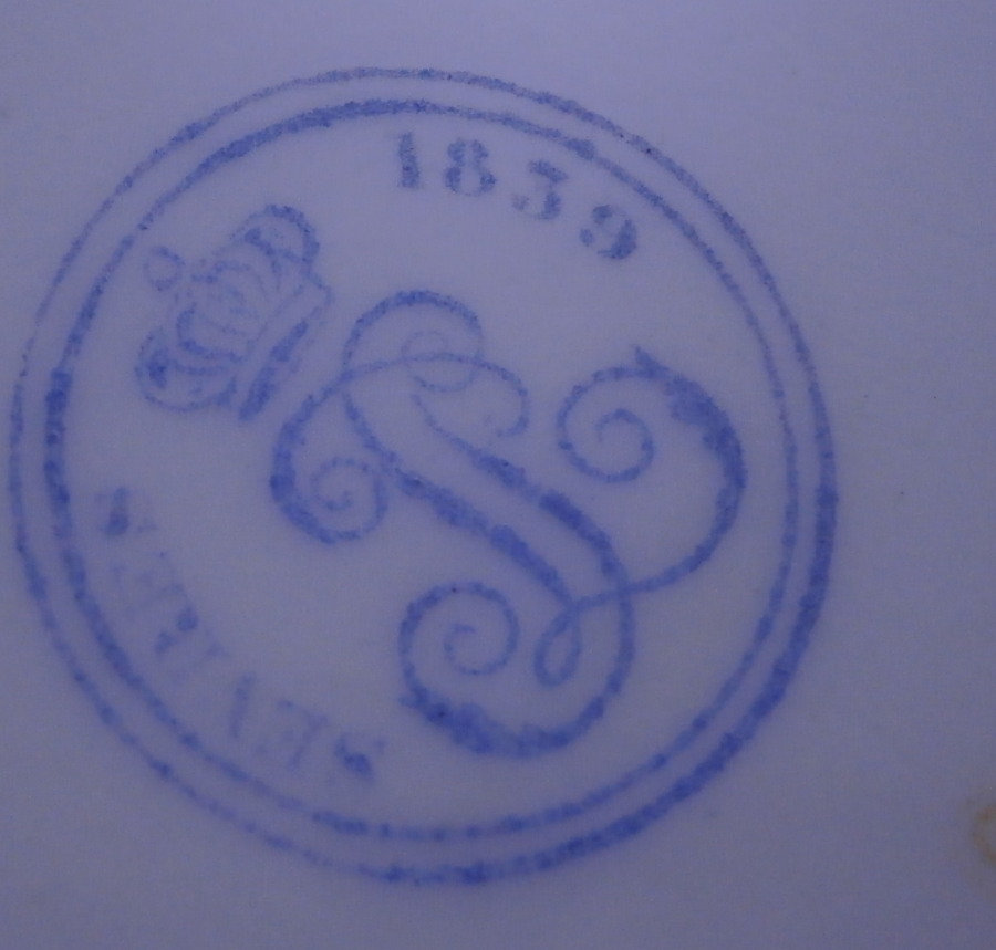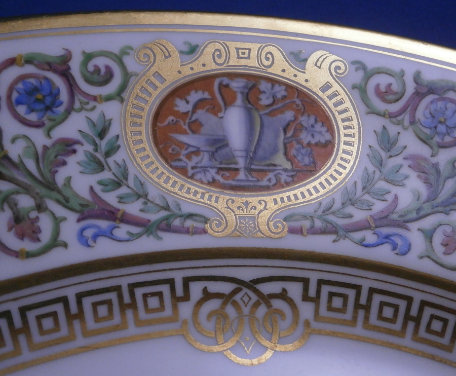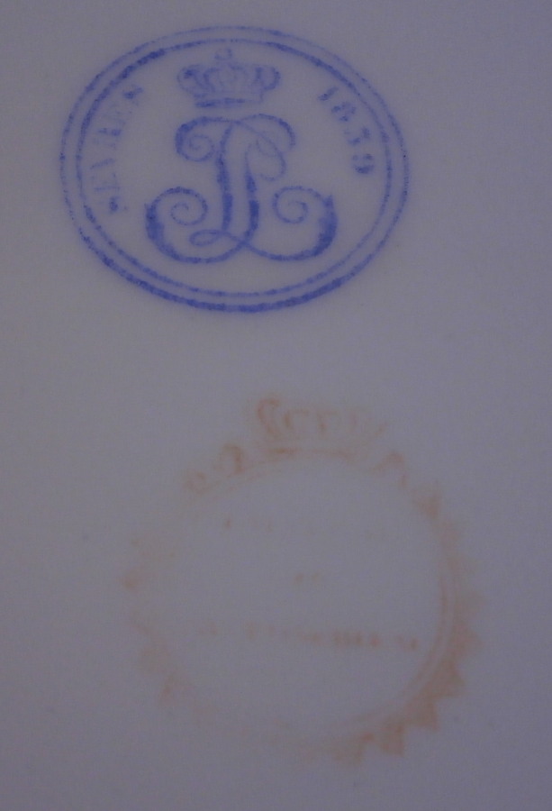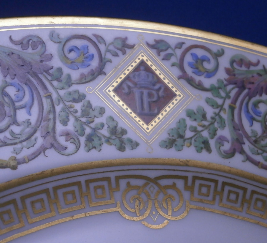 This is a superb and very rare dinner plate made by Sevres in 1839. It is from the famous Service de Chasse Fontainebleau aka the Royal Hunt or Hunting Service of King Louis Philippe of France . The set is superbly decorated with arabesques of foliage with different animals in between and three oval panel with trophies, animals or other emblems surrounded by a nice gold design, a diamond shaped panel with the Royal Cypher of Louis Philippe (initials LP under a crown), a geometric gold band around the well of the plate and a gold star design in the center of the plate. The animals elude to the hunting part that the Chateau was so famous for. The rim design has the outlines trnasfer printed but the colors are all hand painted unlike the later copies. The service was initially ordered in 1836 and the first pieces were delivered in 1839 all the way into the early 1840s. It was then augmented with more pieces until 1847. So this plate comes from the original order which is rare and seems to be one of the earlier plates from that as the incised marks show the blank to ahve been made in 1836 and then decorated in 1839. It is quite rare to find these authentic Sevres pieces nowadays especially from royal services! The plate in superb condition with just a tiny bit of wear to the gilding and two firng spots in the white area of the well. It is just over 1.25 inches tall and 9.5 inches in diameter. The piece is marked underneath with the blue interlaced LP mark under a crown in a circle in blue as well as the red Chateau Fontainebleau mark, the gilders and artist mark initials and the usual incised marking that authentic Sevres porcelain from this period always has as shown. A plate from this service recently sold for $4000 (including fees) at auction at one of the major auction houses. Please email me for more information or other pictures.