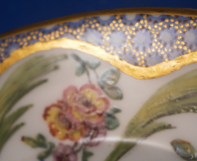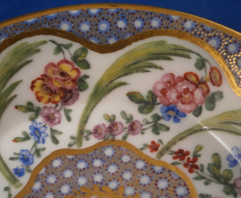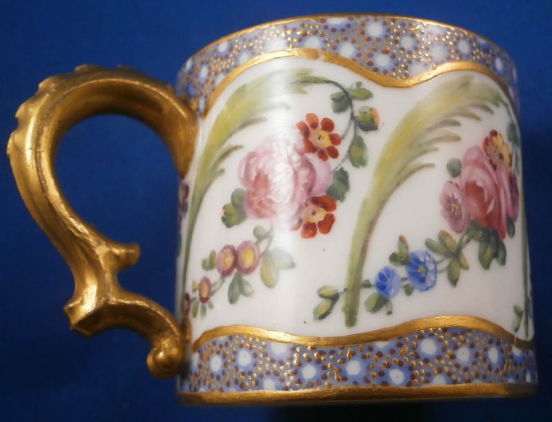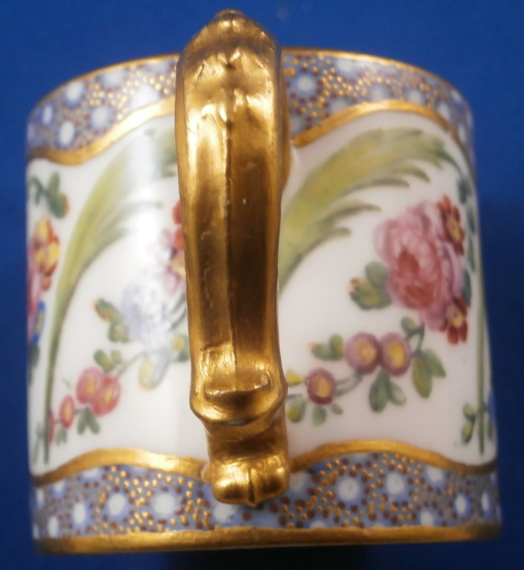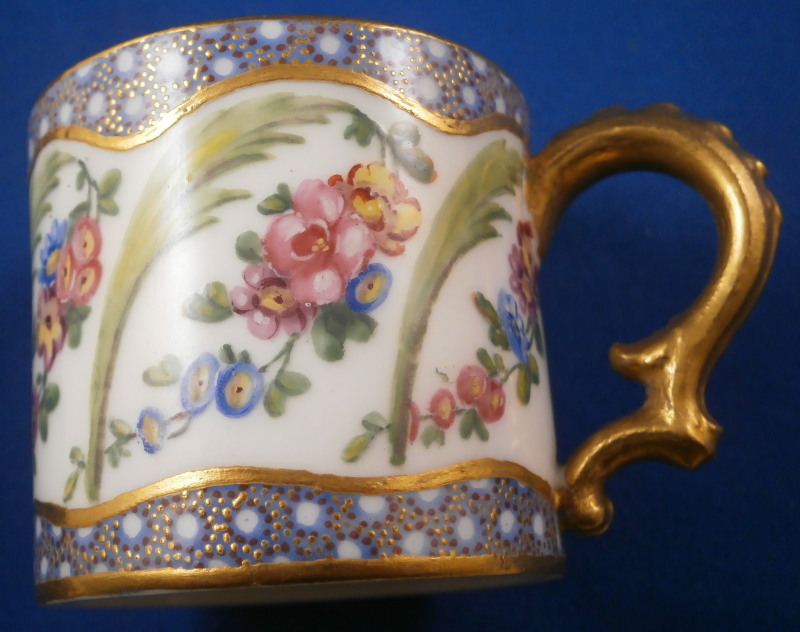 This is a superb little cup and saucer made by Sevres during the 18th century or to be more exact in 1774. This set is made of soft paste porcelain which just has a stunning warmth to it and the enamel colors are just stunning! Both pieces are hand painted with a superb floral design including floral arrangements, a green leaf between each arrangement and a blue dot design highlighted with tiny purple dots and gold dots as the trim along the edge and center. Gilding along the edges and the handle complete a stunning and elegant design. They are both marked underneath with the interlaced L mark with the date code 1774, a painter's mark that I cannot find and the usual inclsed marks one would find on Sevres of this period. The porcelain of this set is a stunning pure white that has almost zero defects which is amazing. The foot rings haven't been ground either so definitely made and painted at Sevres. The saucer has the little hole from the firing process typical of Sevres. The set is in perfect condition with virtually no wear at all! The cup is 1.75 inches tall and 2 inches in diameter. The saucer is 0.875 inches tall and 4.125 inches in diameter. Please email me for more information or other pictures.