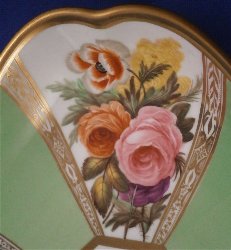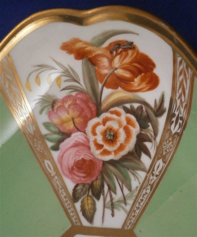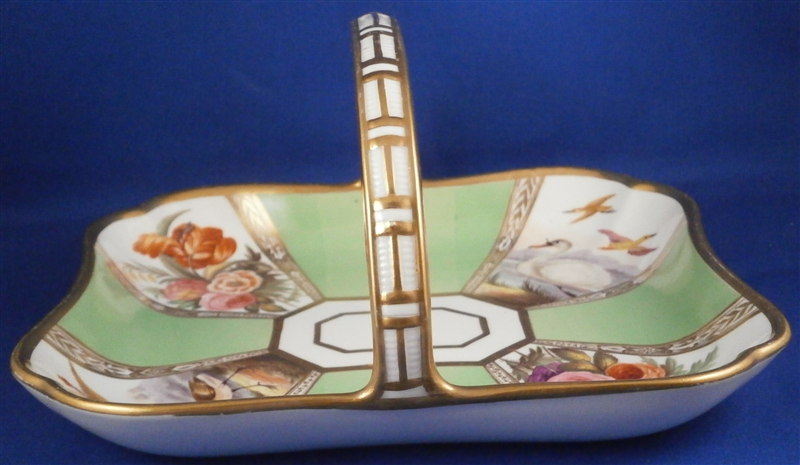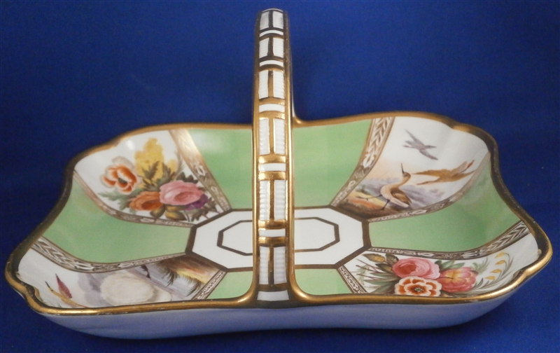 This is a superb handled dish or basket probably made by Spode in the early 19th century. I have always wanted a piece of this shape but msot are damaged or the decoration boring or worn so when I came across this piece I was thrilled! The dish has a nice shape to it with the corner decorated with either a floral arrangement or a birds in nature arrangement surrounded by a nice gold trim. The handle has a relief design to it and some gold highlights as well. The rest of the piece has a green ground color with a little white and gold area in the center. Just a really nice piece to look at and amazingly it is in perfect condition! The piece is about 3.75 inches tall including the handle, 7.75 inches wide and 6.5 inches deep. The basket itself is 1 inch tall. It is marked only with a pattern number 1793 underneath but definitely English and I suspect Spode . Please email me for more information or other pictures.
