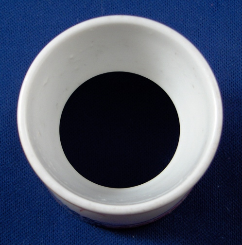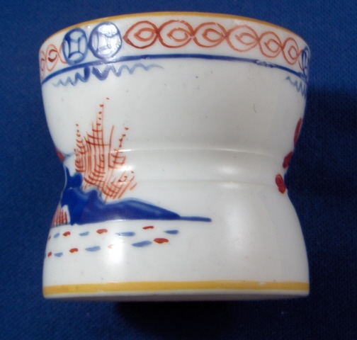This is a very scarce egg ring (kind of like an egg cup but different looking) made in England around 1800. It is made of bone china I believe and probably in the Staffordshire region but possibly by Spode or a number of other makers. This pattern was very popular around that time. It is handpainted with the dollhouse pattern in red and blue with a nice yellowish trim to the top and bottom rims. The piece is in perfect condition besides a teeny chip to the top rim. A little paint over that and you will never know it was there and it might actually be from the making! It is not marked but that isn't unusual at all just makes it more difficult to figure out who made it so I will leave it up to you guys :) The eggring is just over 1.625 inches tall, the top diameter is 1.875 inches (outside) and the bottom diameter is 1.75 inches (outside). Please email me for more information or other pictures.