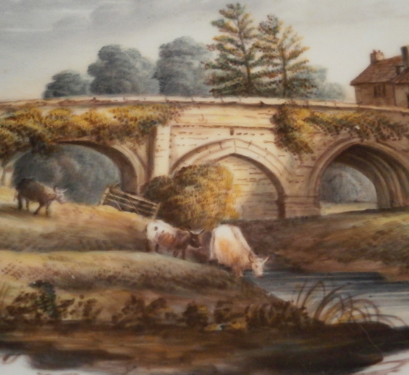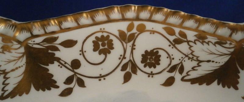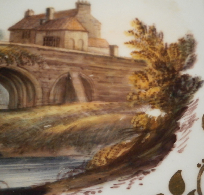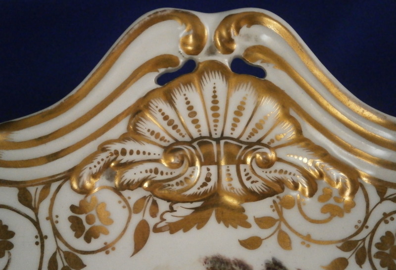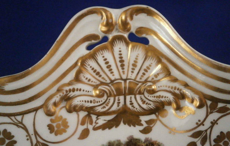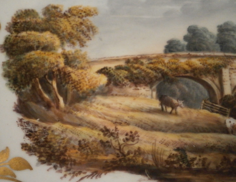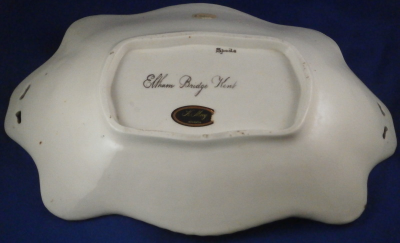 This is a superb dish made by Spode in the early 19th century. It reminds me more of Derby pieces I owned and I wonder if it is maybe a replacement piece but I have no idea. The dish has a nice shape to it with two handles, is hand painted with some superb gold trim all along the edge and a very high quality scene in the center with a view that is named underneath - Eltham Bridge Kent - which still can be seen today near Eltham Palace in Kent near London. Amazingly it is in great condition with almost no wear to the gilding at all and only a spot of wear on the right side of the scene in the trees as shown. A couple of very minor scratches so in as good a shape as you can hope for. It marked underneath with the black SPODE mark as well as the name of the scene and has an old dealer sticker and crazy price attached to the underside as well. The platter is 2.25 inches tall, 11.75 inches wide and 7.75 inches deep. Please email me for more information or other pictures.