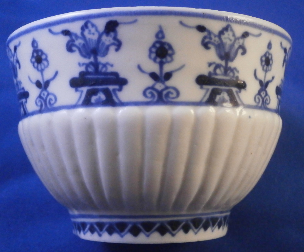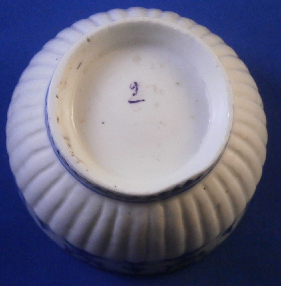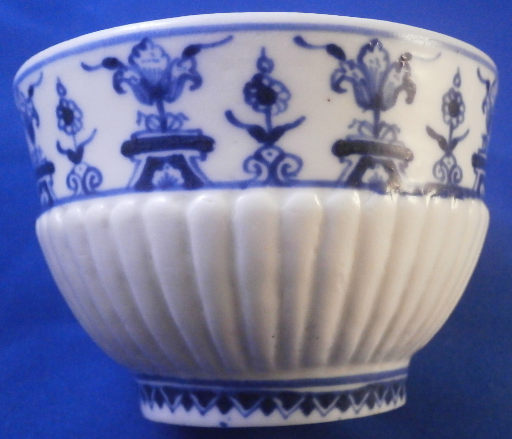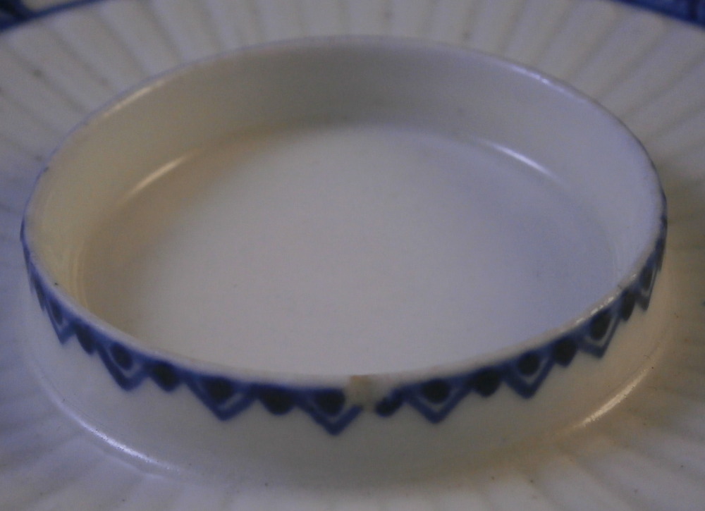 This is a superb cup and saucer made by St-Cloud during the first quarter of the 18th century. It is made of a creamy colored soft paste with a Renaissance inspired lambrequin design in under glaze blue loosely derived from the broderie ornaments of the designer Jean Berain (1640-1711) and his followers. Really quite nice! Softpaste porcelain has a charm to it unlike any other porcelain and is a must have for any collector! The cup and saucer have a ribbed design to the paste in a section below the blue decoration and the saucer has a little rim around the center well to keep the cup from moving around much like a trembleuse saucer. A nice addition that is a bit unsual is the blue floral design to the cup inside as shown. Seems to have only been done on this cup shape which is rare. This is a handleless cup aka a tea bowl. The set is in great condition with a small chips to the trembleuse ring of the saucer and to the underside edge as shown from both views! The saucer is unmarked with the cup have an number 9 with a line below it as shown. The cup is 2.125 inches tall and 3.25 inches in diameter. The saucer is 1.25 inches tall and 5.625 inches in diameter. Please email me for more information or other pictures.