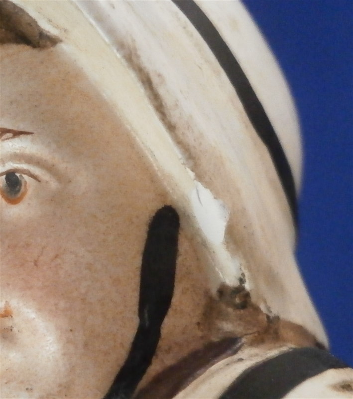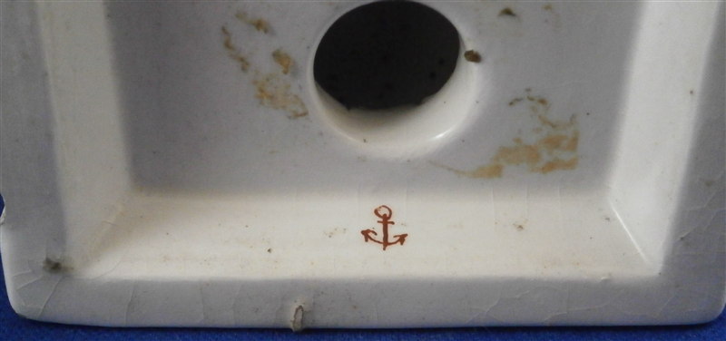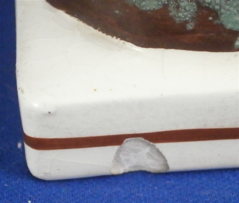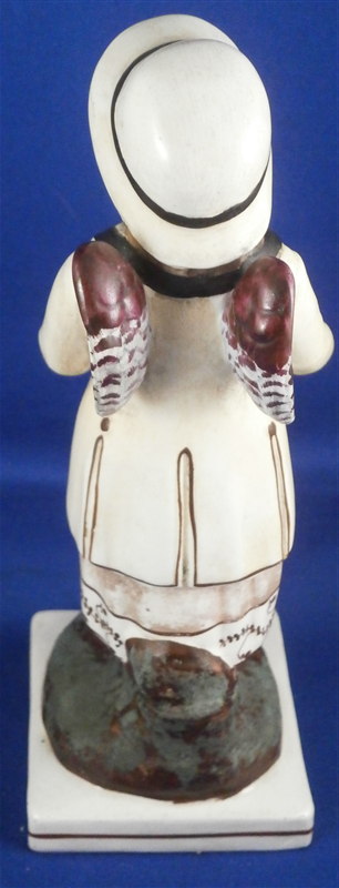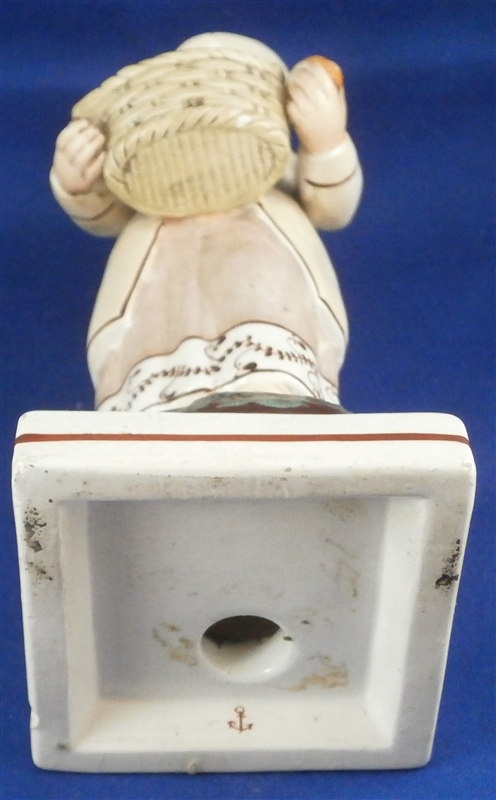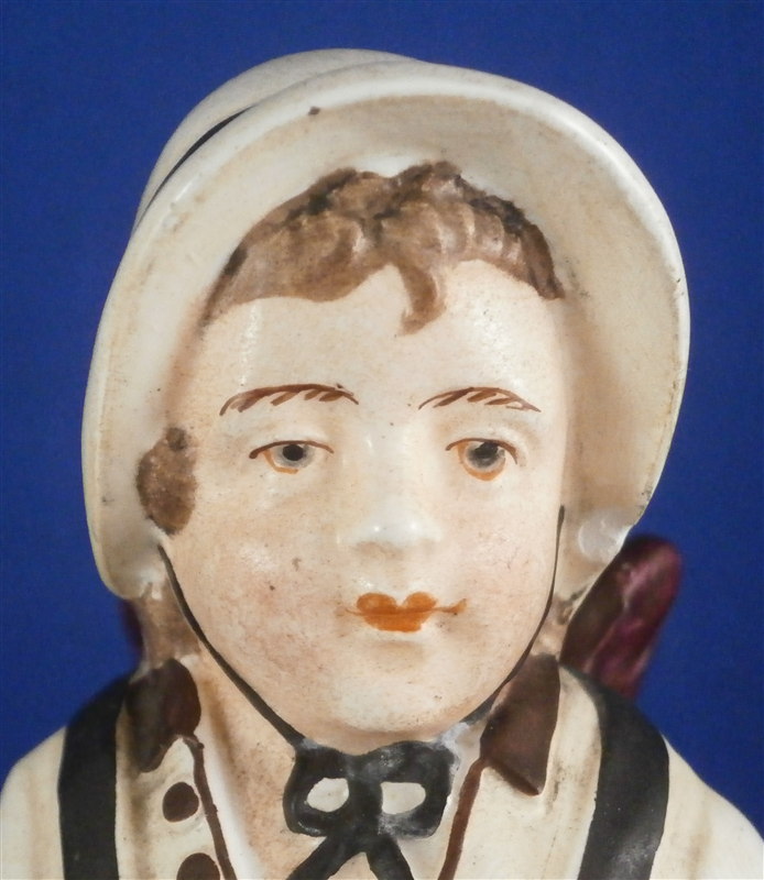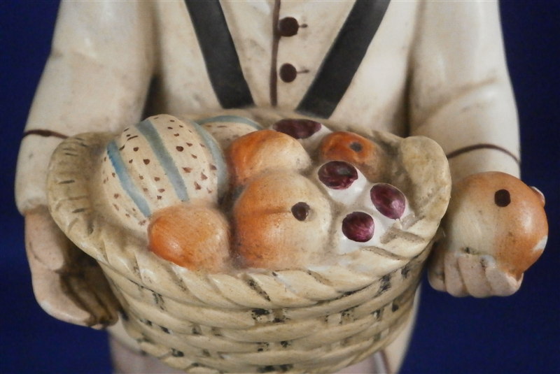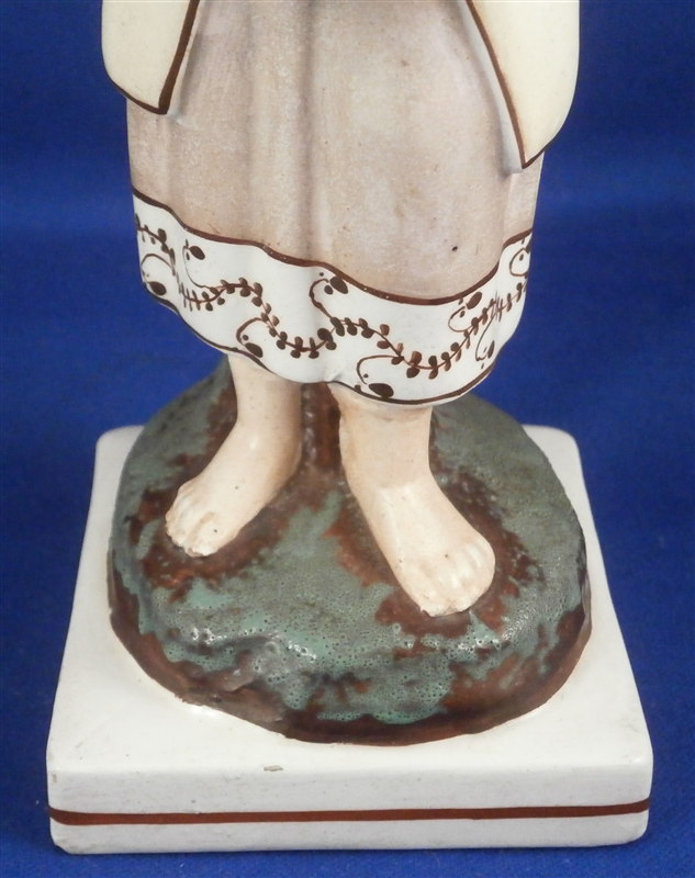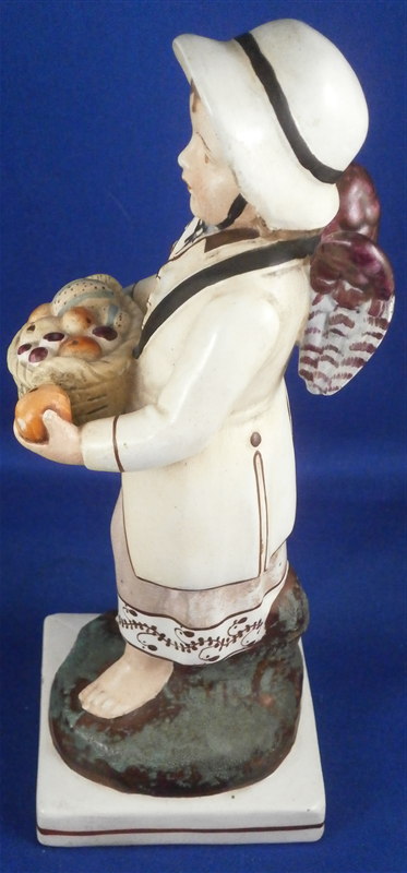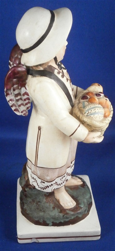 This is a great figurine of an angel holding a bsket full of fruit made in the Staffordshire region around 1800. The figurine is really well done with the colorful fruit in the basket being my favorite. She is made of Creamware which looks superb and is very light. The figurine is about 7 inches tall with the base being about 2.5 inches on each side. The figure is in great condition with a small chip to the right side of the bonnet a glaze chip to one finger, a spot on the udnerside of the basket and one fruit and a chip to the left side of the base. None of these take away from the piece and it displays superbly! The figurine is marked with a red anchor mark which is a bit odd since it obviously wasn't made by Chelsea but maybe someone back then tried to pull a fast one :) Please email me for more information or other pictures.