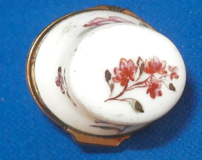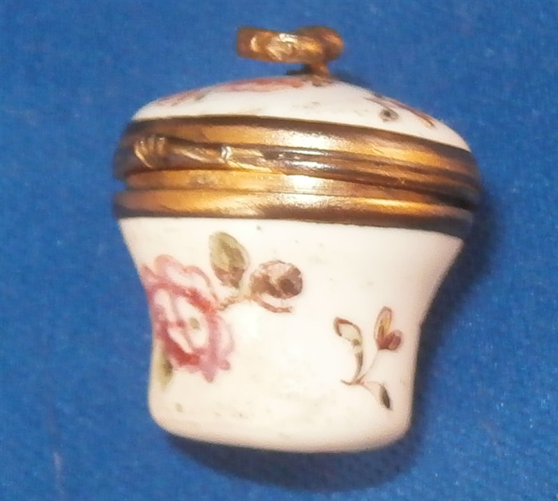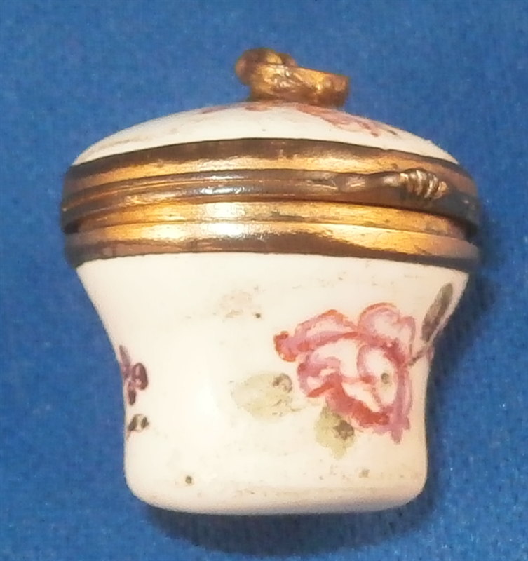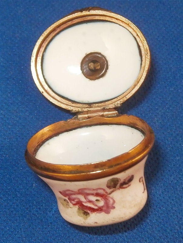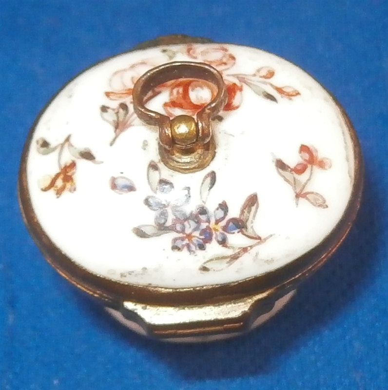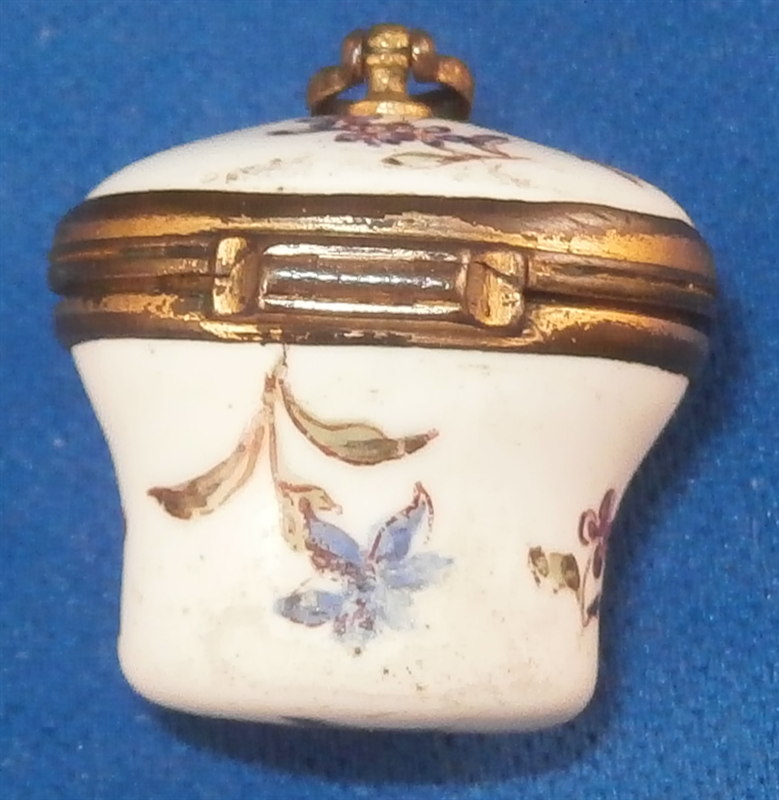 This is a superb little piece made in England in the 18th century. It was probably made in the Bilston area of Southern Staffordshire. They are famous for their enamel pieces. This piece is a tiny little box meant to be worn as a pendant on a chain. It is a miniature version of the snuff boxes one sees much more often. The piece has some nicely handpainted flowers all around on a white enamel ground color which is seems to be done on copper. The mounts are gold washed bronze I think. A very cute little piece and not something you come across often if ever. It is in great condition with the gold wash worn a bit as is the white enamel in some areas or it might be from the making with tiny firing black spots here and there. Looks much worse in the pics since they are way bigger than the box is! Displays perfectly! The little box pendant 0.75 inches tall, 0.875 inches wide and 0.75 inches deep. It is unmarked which is normal! Please email me for more information or other pictures.