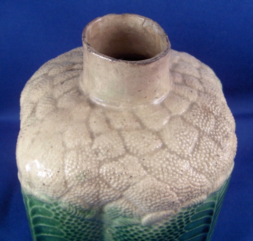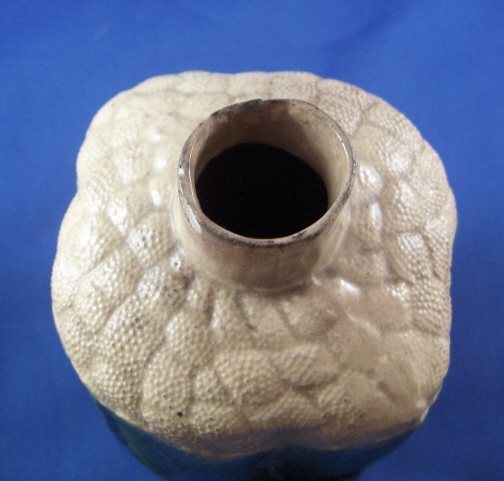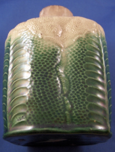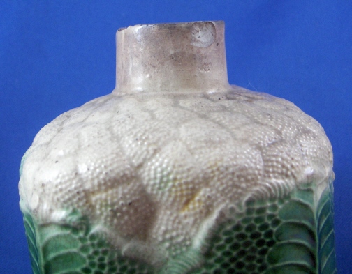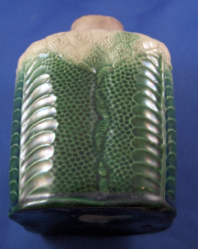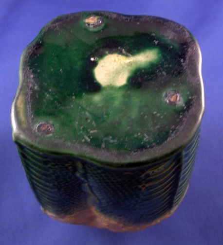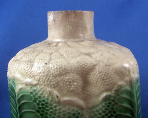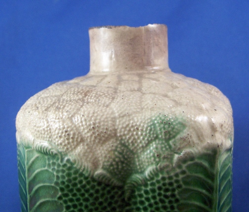 This is a superb tea jar made by one of the Staffordshire makers around 1760. It is an early creamware version and has some superb detail to it with the top part being the actual white cauliflower and the bottom the green leaves around it. The green is a very nice color and quite transparent! The caddy is about 4.25 inches tall and is about 3 inches from side to side. It is in great condition with a a little chipping to the top rim, a small hairline from the top rim and off course it is missing the lid which seems to be the norm on these pieces. A few firing / paste flaws in the form of extra paste in two areas which is also normal. The pot is off course unmarked which makes it very hard to ID further but maybe the three stilt marks underneath help someone that knows this subject a bit better than me. Please email me for more information or other pictures.