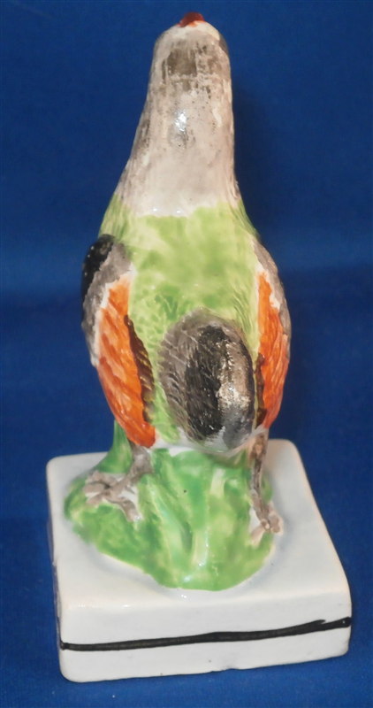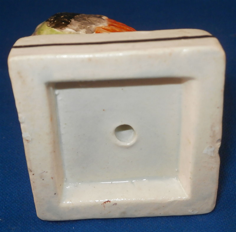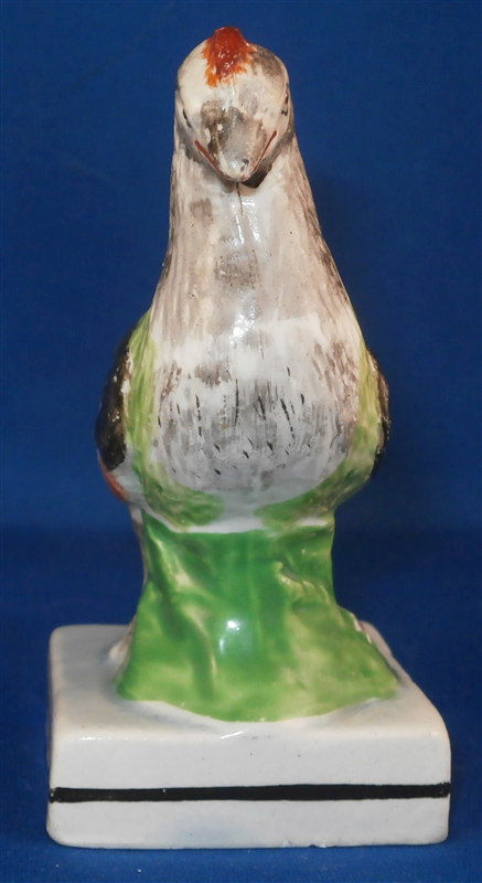 This is a fun pearlware figurine of a chicken made in the Staffordshire region in the early 19th century. Can't recall ever having seen a chicken but it certainly is a great figure to look at! The bird is superbly modeled and hand painted. The piece stand on a typical square base with a black line along the sides. The figurine is in great condition with a minor rough spot to the beak and a flake to the bottom edge of the base original to the making. As is normal the figurine is not marked. The piece is 3.375 inches tall and the base is about 1.75 inches square. Please email me for more information or other pictures.