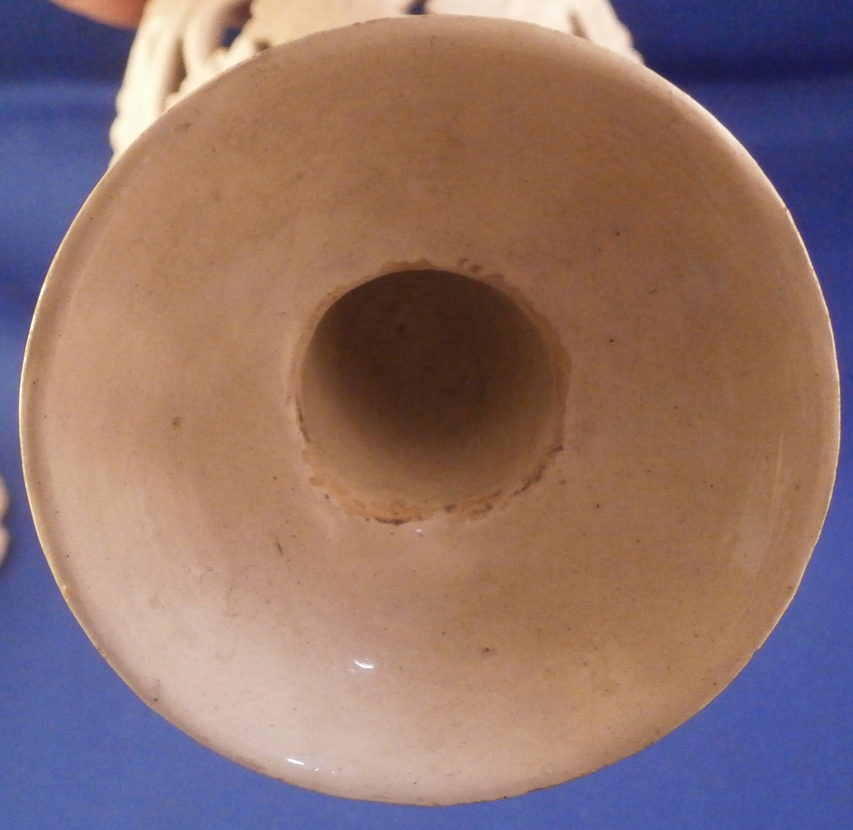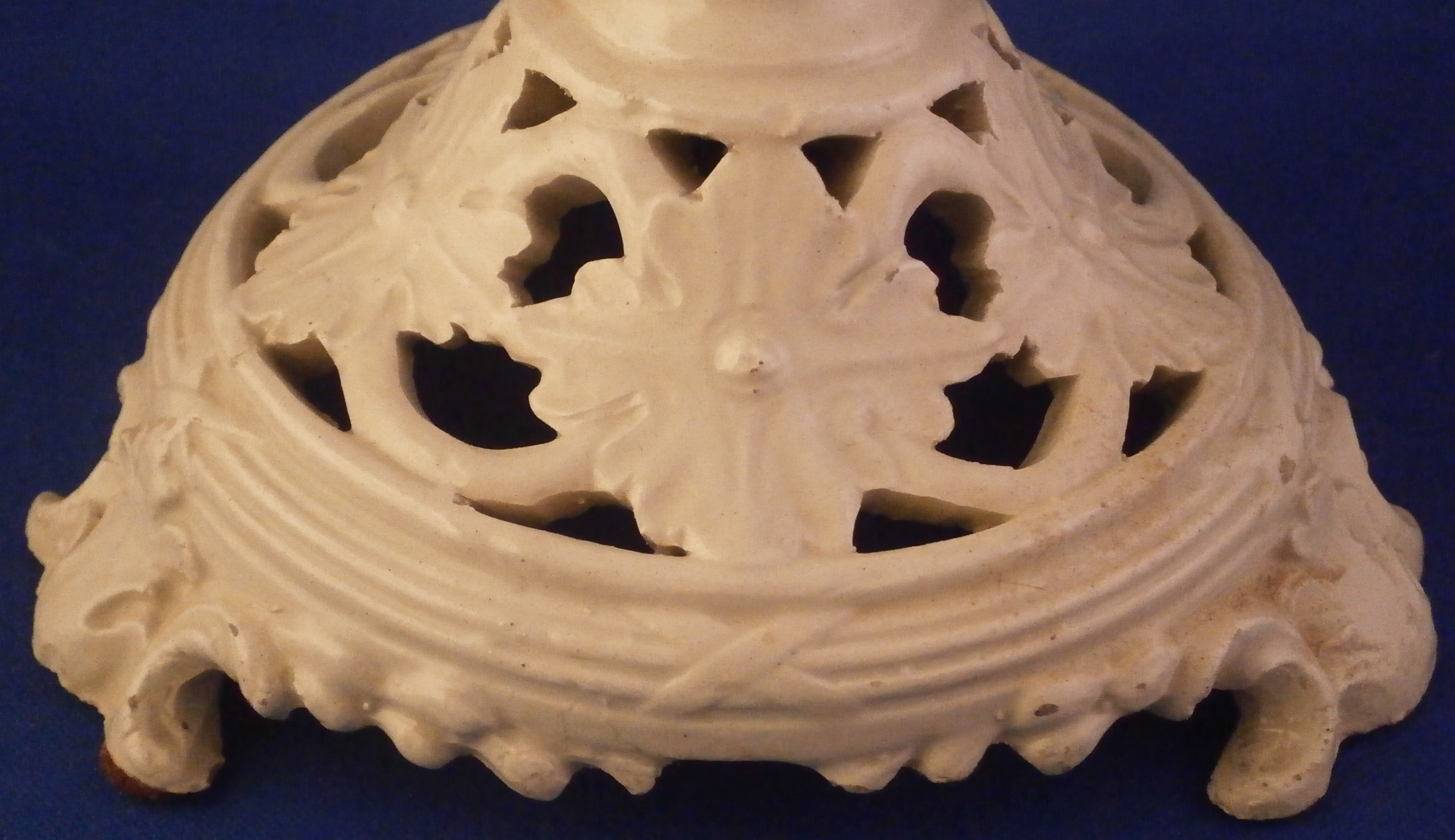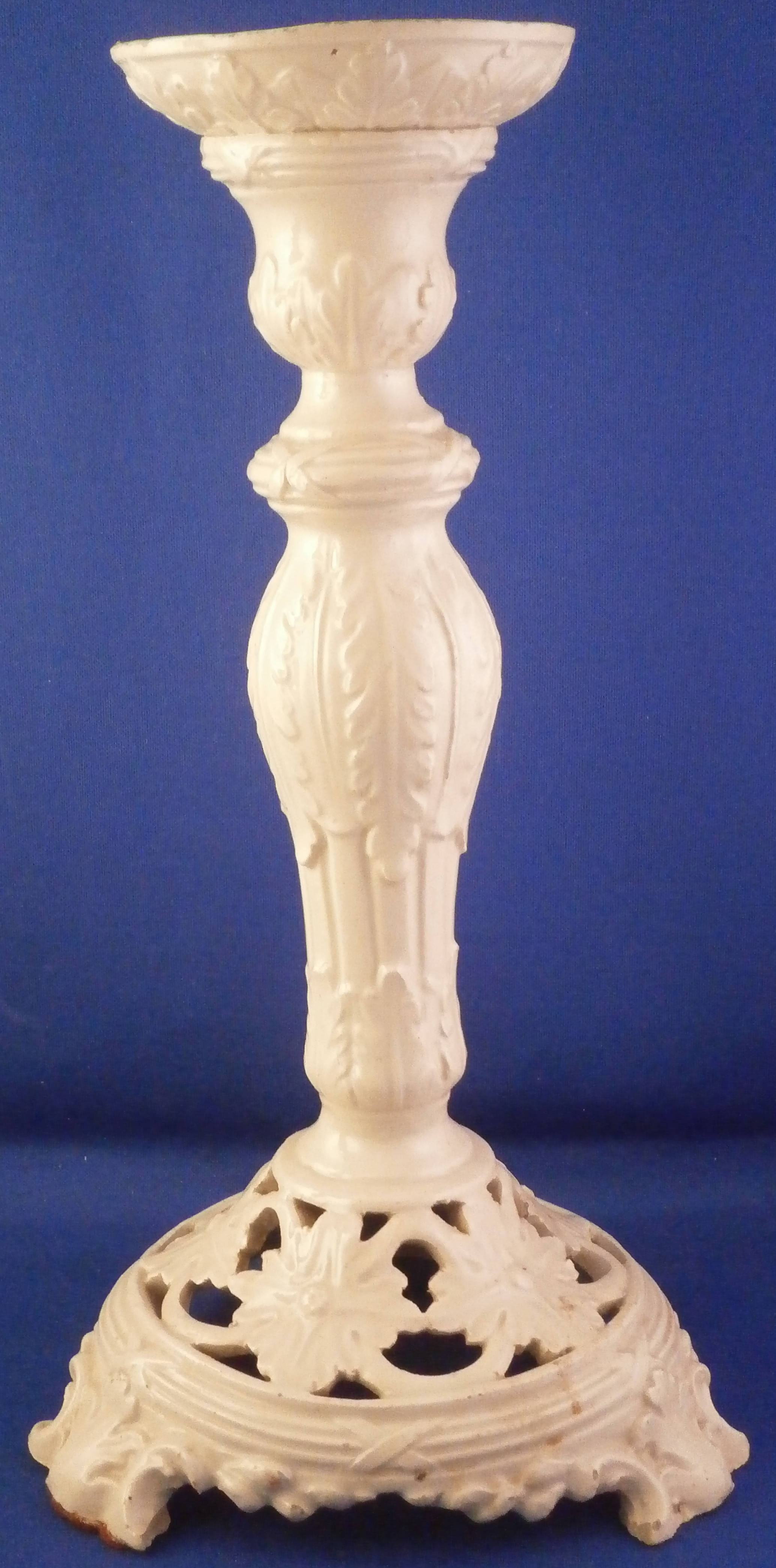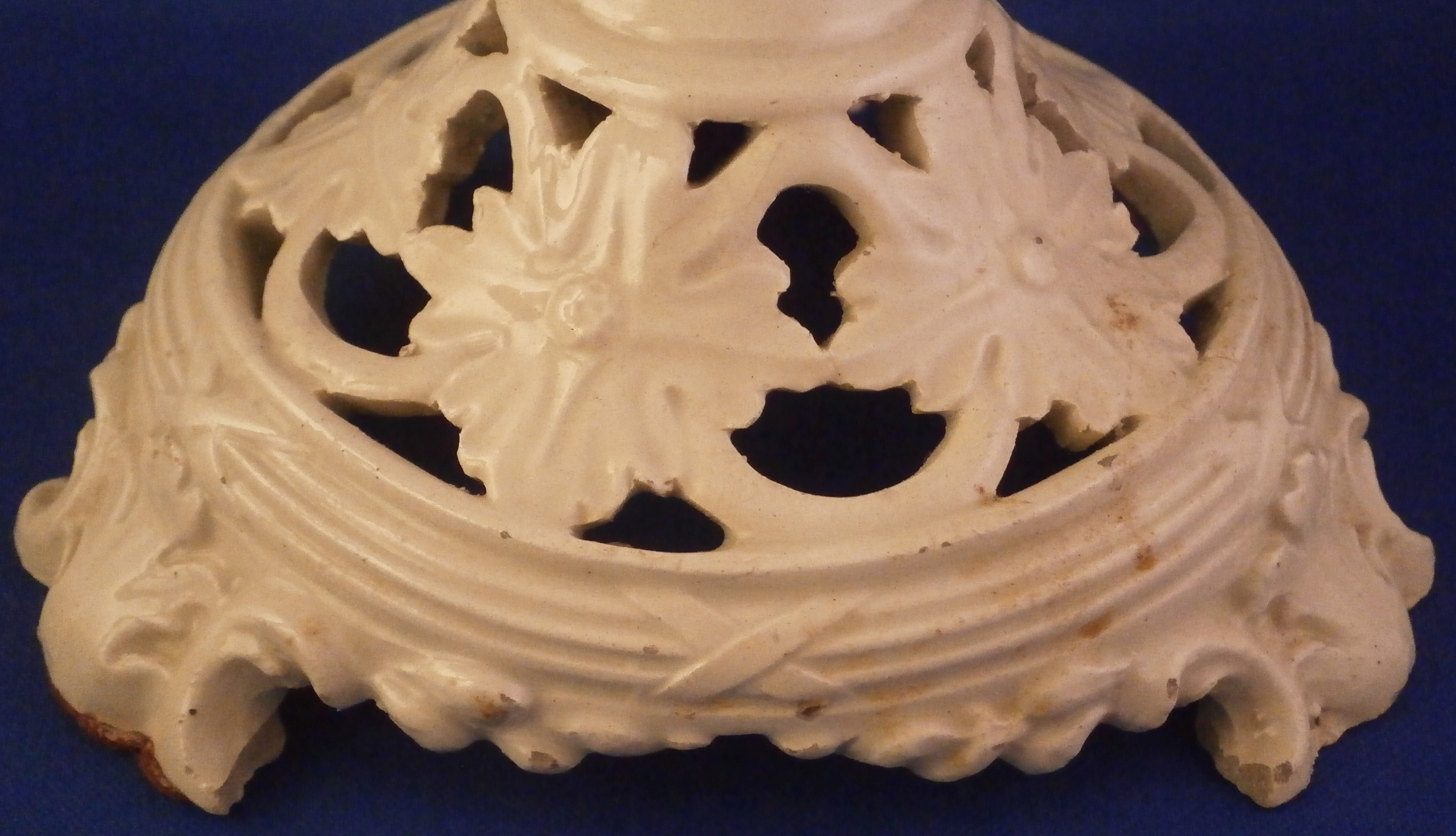 This is a superb pair of candlesticks. I think they are made of creamware but it could be some other sort of pottery in that color range as well. I could not find anything like them even after extensively seaching. Leeds ware comes to mind from the Staffordshrie region but they could be some other ENglish ro even italian maker as well. They definitely ahve some good age to them. Early 19th century or even into the 18th century. Really a nice pair of sticks ! Each has a nicely reticulated base with a nice design to them in relief. They sit on three feet and both are heavily detailed with different relief designs. The bobeche part appears to have been made separately before being joined with the rest of the piece. A stunning set of candleholders that would look amazing on any table or mantle. Both pieces are unmarked underneath but that's pretty common on antique wares of this style. They are in great condition but not without flaws - most from when they were made! A couple of minor firing cracks and a very minor hairline, a few tiny glaze chips and one has a small repaired chip to the top edge which could be done better and another large chip but that is glazed over and from when it as made. They displays amazingly together! Each is about 10.25 inches tall with the base being about 5 inches in diameter with the feet sticking out a bit from there. Please email me for more information or other pictures.