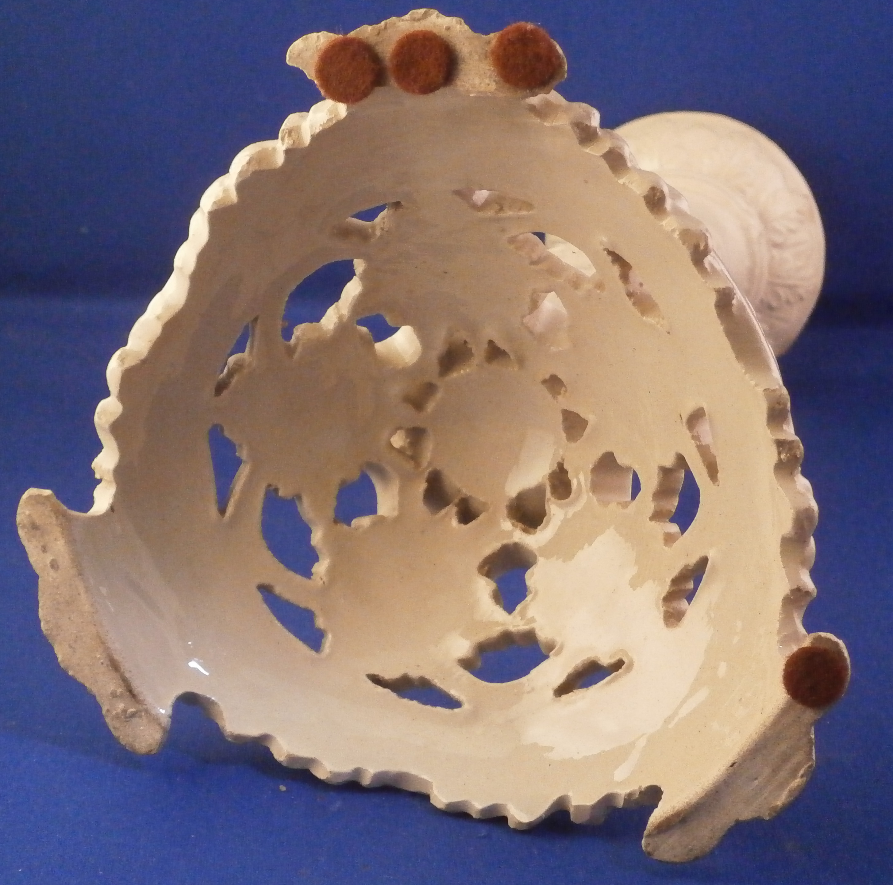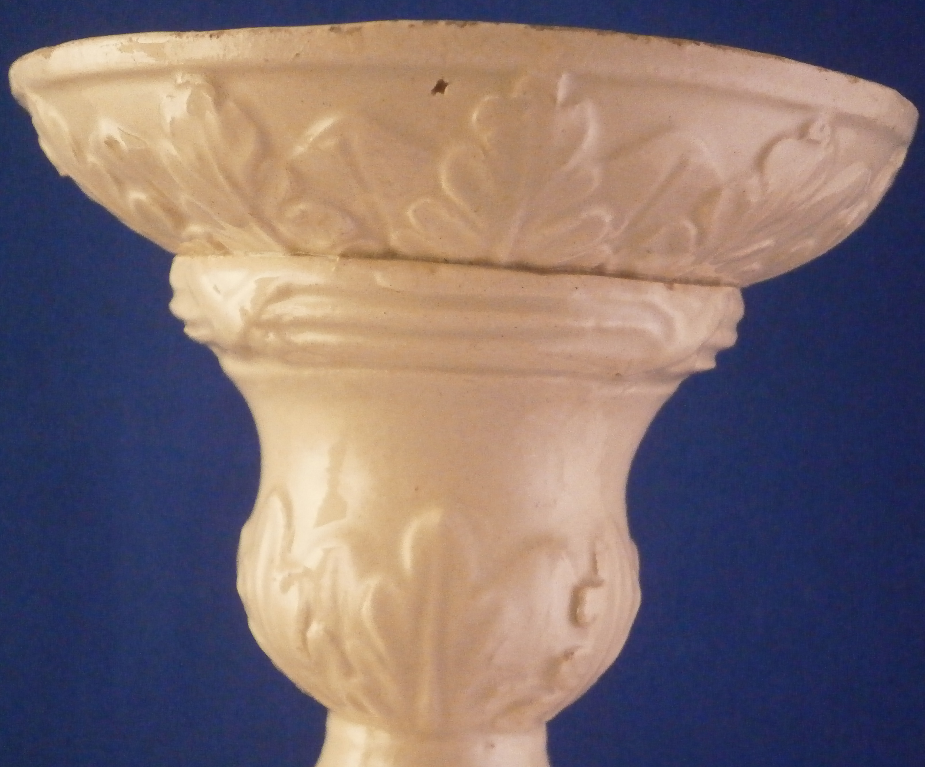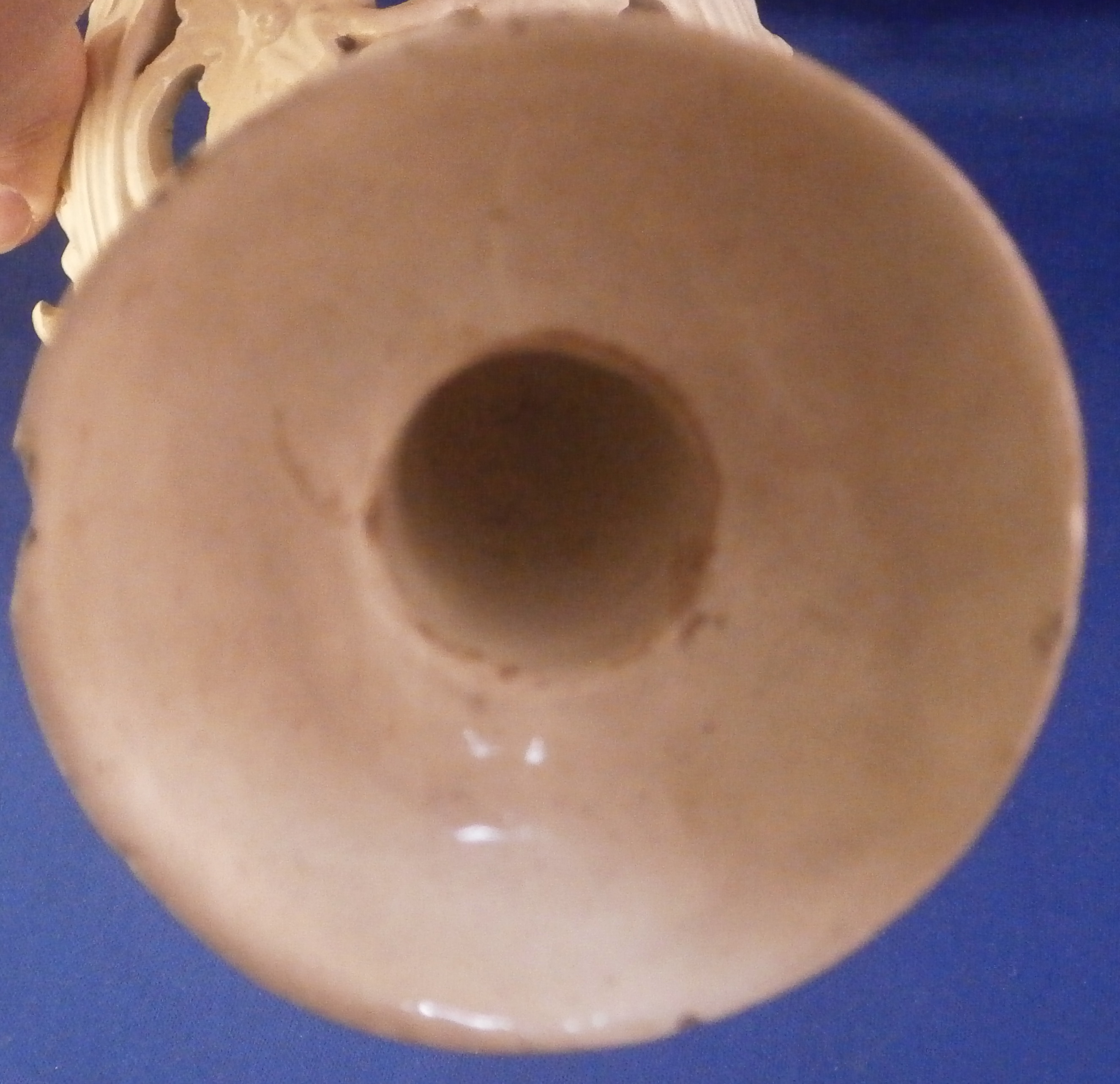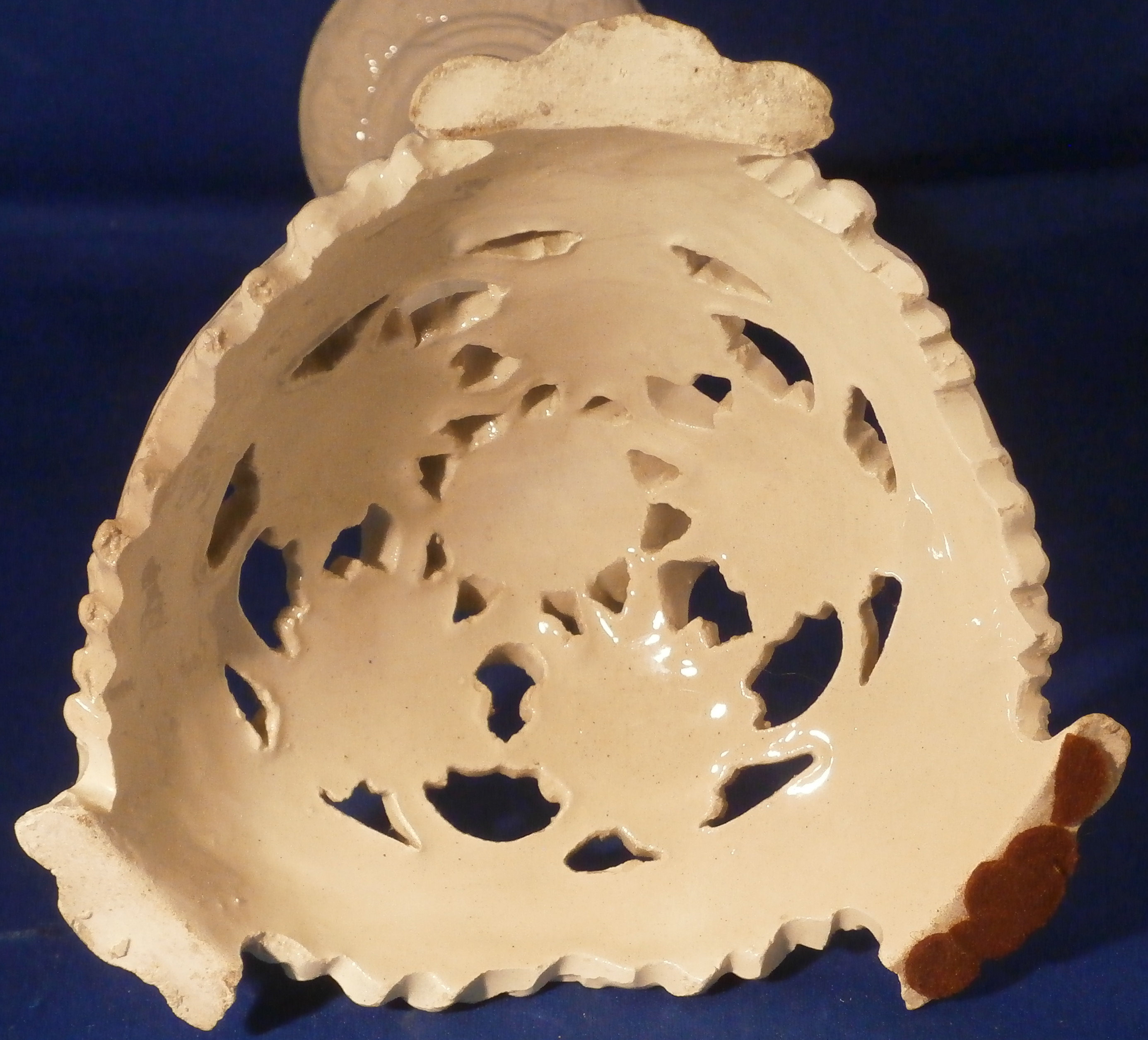 This is a superb pair of candlesticks. I think they are made of creamware but it could be some other sort of pottery in that color range as well. I could not find anything like them even after extensively seaching. Leeds ware comes to mind from the Staffordshrie region but they could be some other ENglish ro even italian maker as well. They definitely ahve some good age to them. Early 19th century or even into the 18th century. Really a nice pair of sticks ! Each has a nicely reticulated base with a nice design to them in relief. They sit on three feet and both are heavily detailed with different relief designs. The bobeche part appears to have been made separately before being joined with the rest of the piece. A stunning set of candleholders that would look amazing on any table or mantle. Both pieces are unmarked underneath but that's pretty common on antique wares of this style. They are in great condition but not without flaws - most from when they were made! A couple of minor firing cracks and a very minor hairline, a few tiny glaze chips and one has a small repaired chip to the top edge which could be done better and another large chip but that is glazed over and from when it as made. They displays amazingly together! Each is about 10.25 inches tall with the base being about 5 inches in diameter with the feet sticking out a bit from there. Please email me for more information or other pictures.