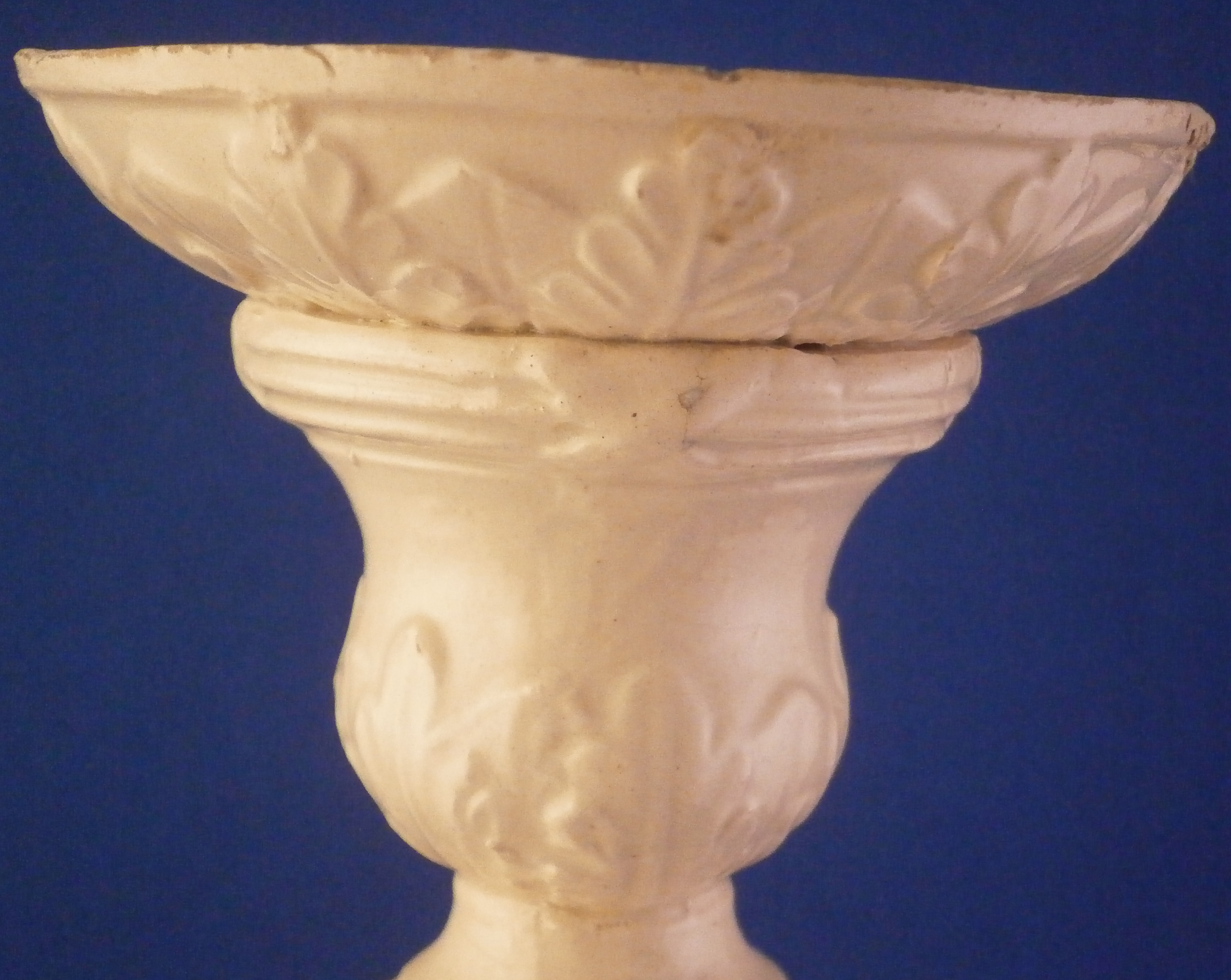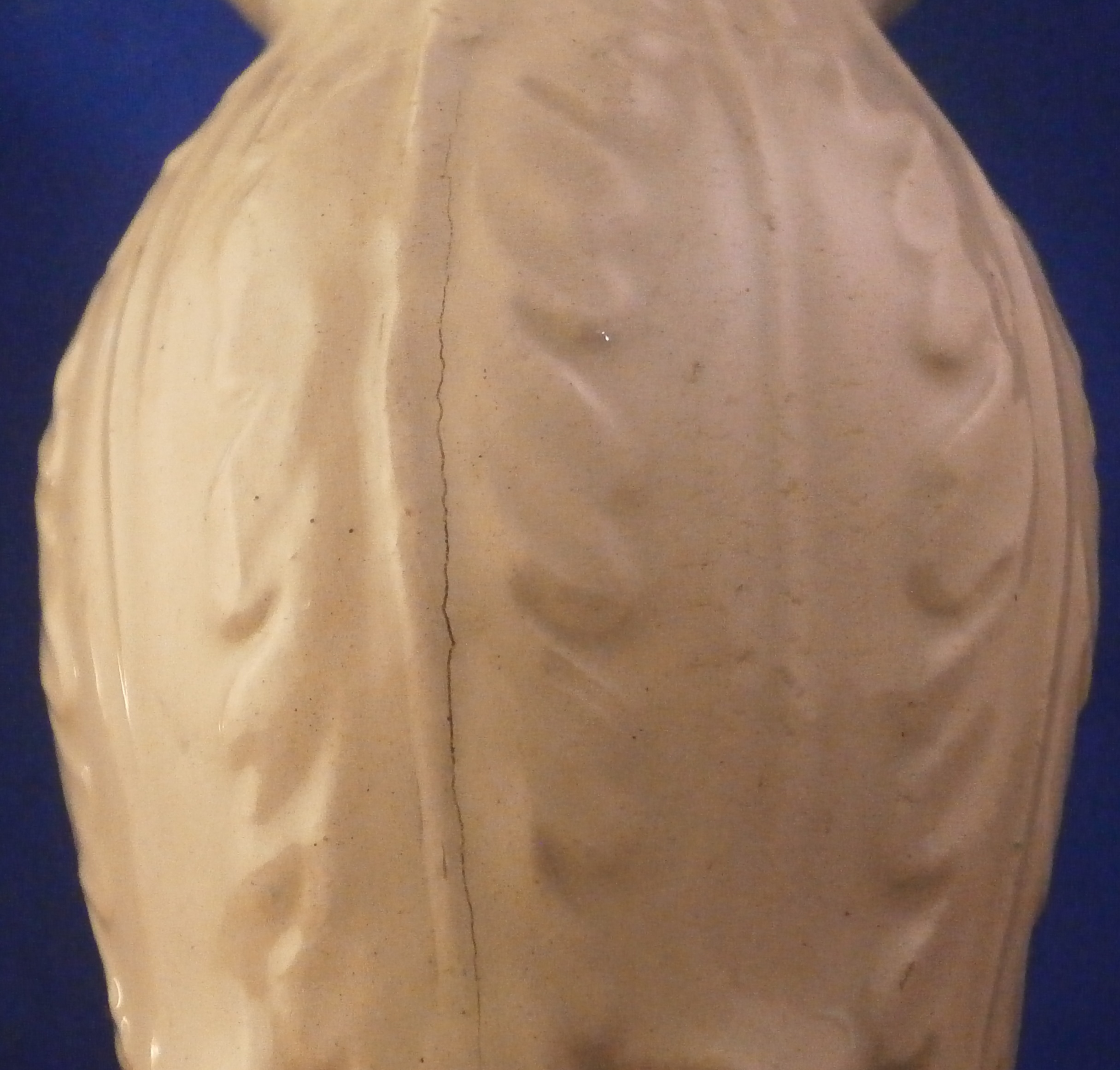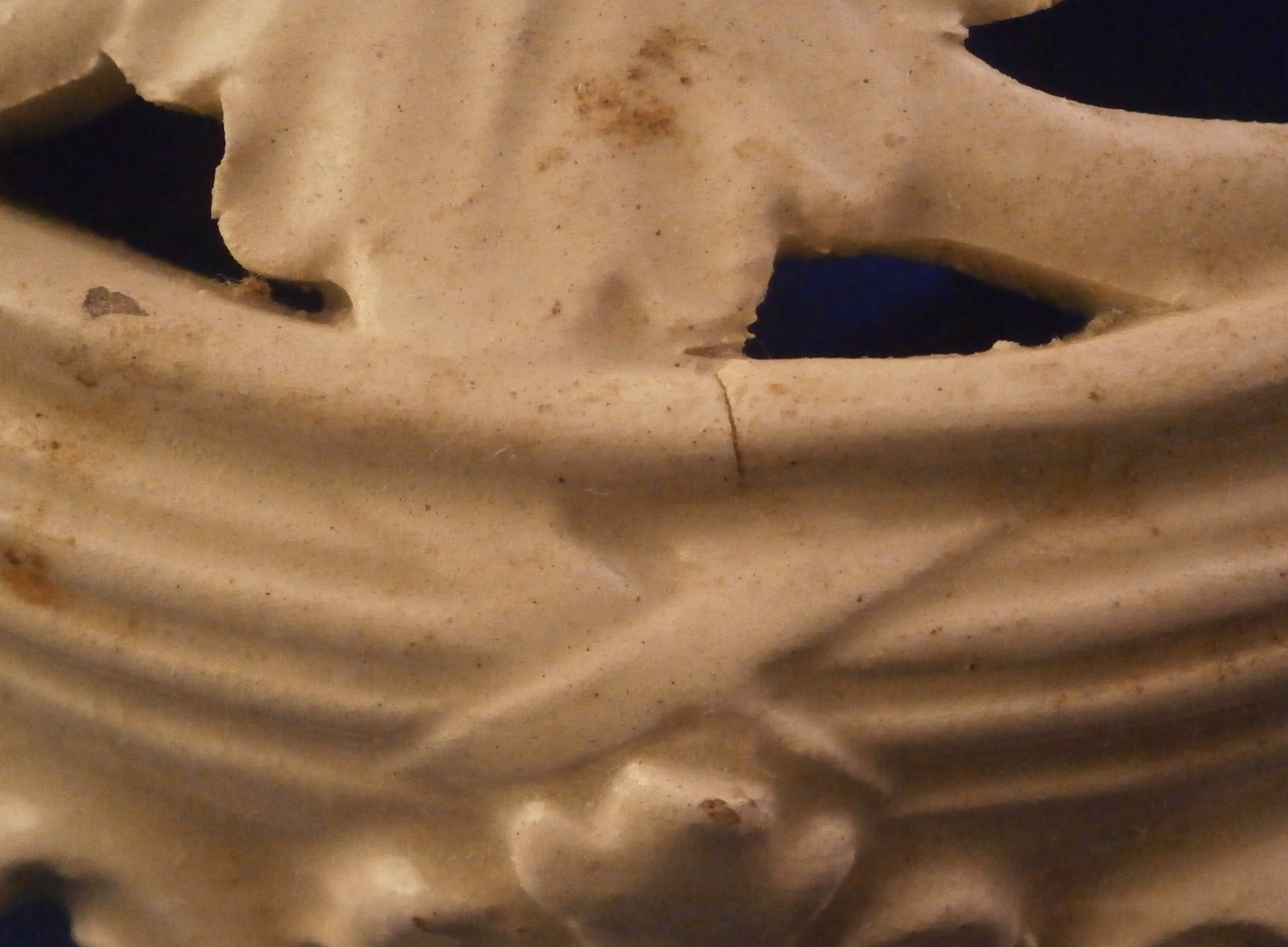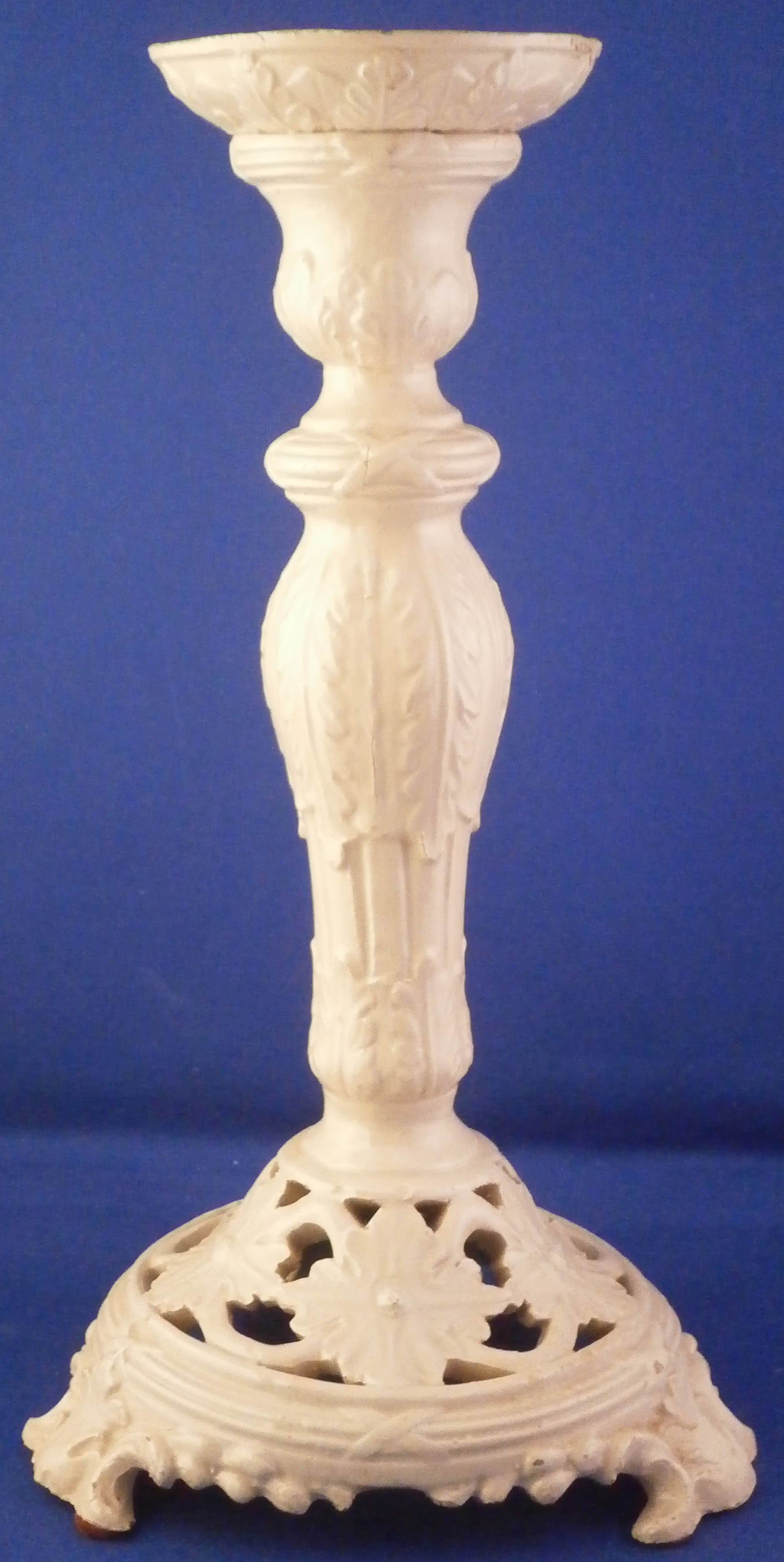 This is a superb pair of candlesticks. I think they are made of creamware but it could be some other sort of pottery in that color range as well. I could not find anything like them even after extensively seaching. Leeds ware comes to mind from the Staffordshrie region but they could be some other ENglish ro even italian maker as well. They definitely ahve some good age to them. Early 19th century or even into the 18th century. Really a nice pair of sticks ! Each has a nicely reticulated base with a nice design to them in relief. They sit on three feet and both are heavily detailed with different relief designs. The bobeche part appears to have been made separately before being joined with the rest of the piece. A stunning set of candleholders that would look amazing on any table or mantle. Both pieces are unmarked underneath but that's pretty common on antique wares of this style. They are in great condition but not without flaws - most from when they were made! A couple of minor firing cracks and a very minor hairline, a few tiny glaze chips and one has a small repaired chip to the top edge which could be done better and another large chip but that is glazed over and from when it as made. They displays amazingly together! Each is about 10.25 inches tall with the base being about 5 inches in diameter with the feet sticking out a bit from there. Please email me for more information or other pictures.