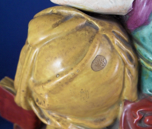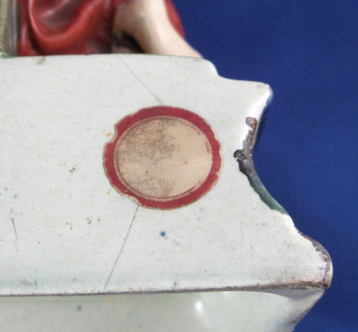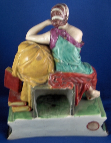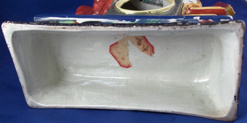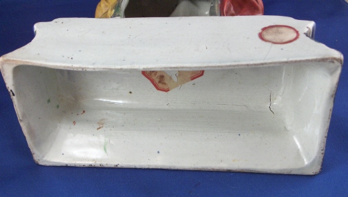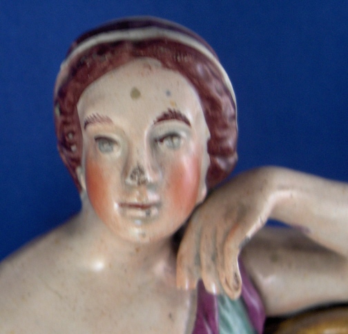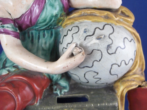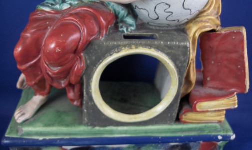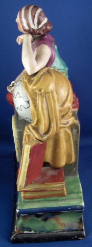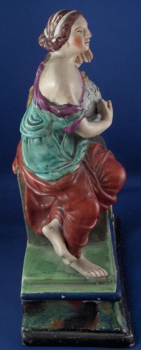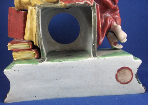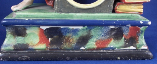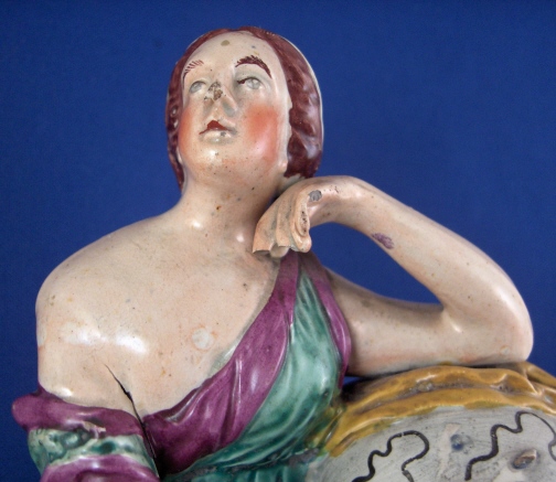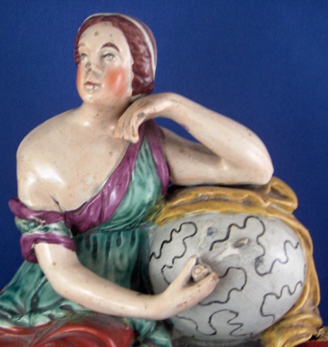 This is a figural pocket watch holder made made in the Staffordshire region around 1800. The piece is based on a Paris porcelain clock, with Urania sitting on top of the empty watch holder and pointing to the celestial sphere with some books stacked up on the other side. The base has a nice colorfull sponged look likely meant to look a bit like marble. I think she is made of Pearlware as the piece has that blueish tint to the underside typical of this type of ware. Not sure who exactly made her but it is definitely one of the better makers of this region. A very well modeled and painted piece with about as good a subject matter as one can wish for. The entire figure is about 9 inches tall, 7 inches wide and 3.25 inches deep. She is in great condition with some minor issues like paint flakes, a small chip to one corner, the pointers in her hand are broken off and three fingers have damage as well. There is a tight stable hairline to a back left side as shown and some old stickers from previous owners / sellers. Not marked which is normal. Please email me for more information or other pictures.