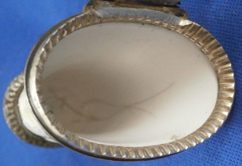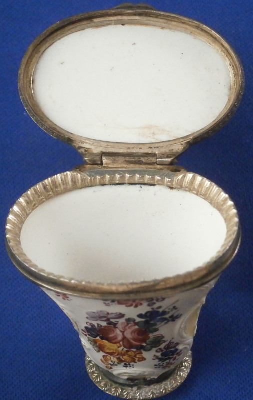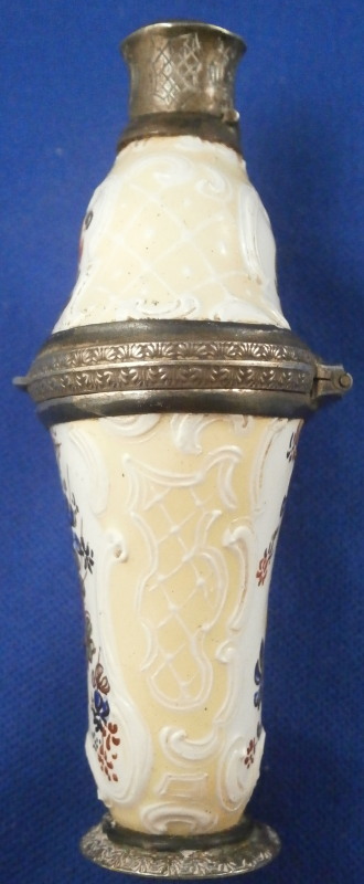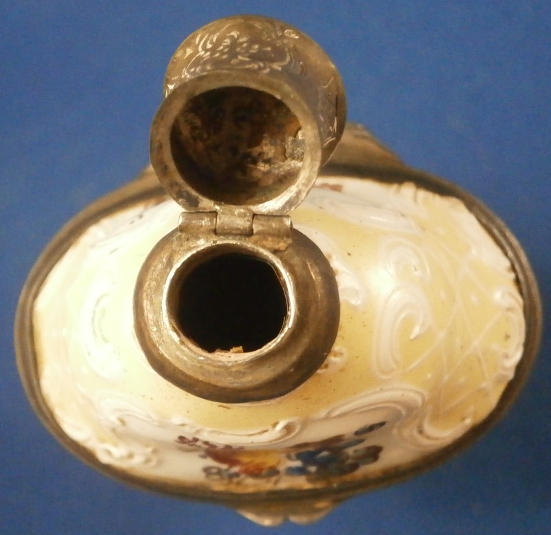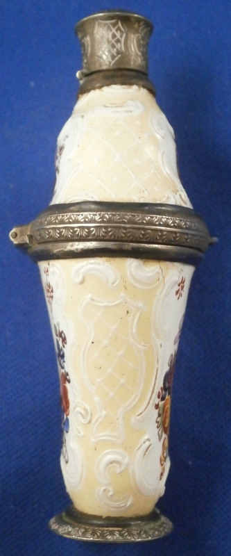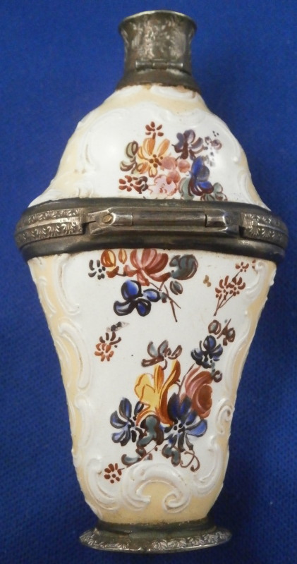 This is a superb pill or snuff box and perfume bottle combo (or scent flakon and bonboniere if you wish) made in England in the late 18th century in the Bilston area of Southern Staffordshire which is famous for their Battersea enamel pieces. I have not seen many combination pieces like this so I was thrilled to own it. This piece has a nicely hand painted floral arrangement to either side of the main body as well as the lid on white ground while the rest of the peice has a light yellow ground color to it with some raised trim in white over that. The hinged are silver in color but I ccould not find a mark so I will leave it at that. The piece is in great condition with some hairlines to the enamel on the inside as shown. The outside is superb! The hinged are in good shape and the lids close nicely but are a bit loose. The underside of the box has some odd resin to it - not sure why that is or if something was groundflat later on. It stand well on a flat surface so no issues there. This is a superb piece that is quite decorative and elegant. The piece is 3.125 inches tall, 1.75 inches wide and 1.25 inches deep. Please email me for more information or other pictures.