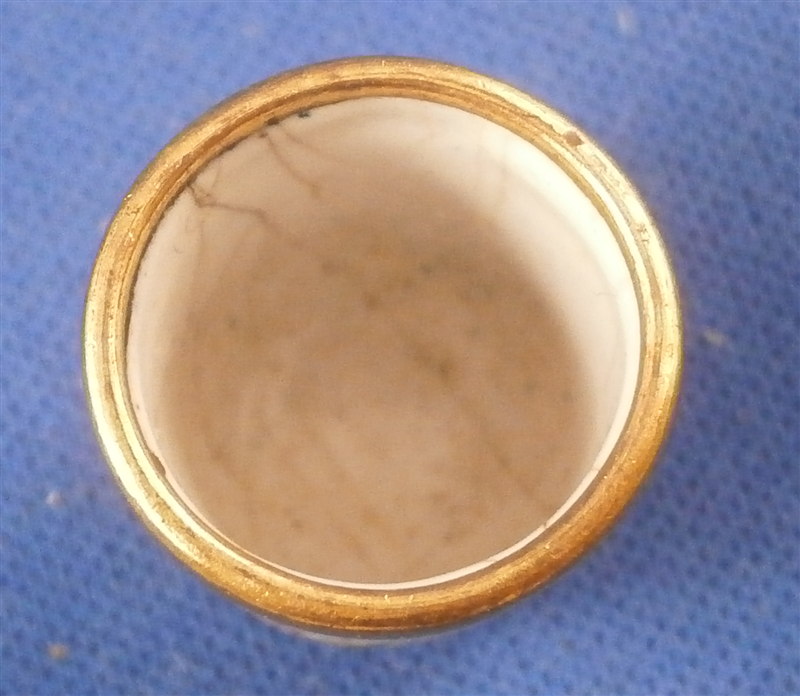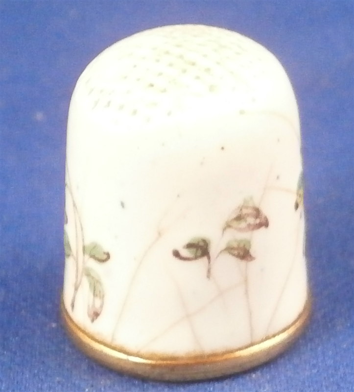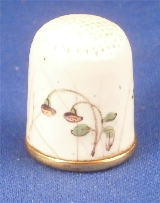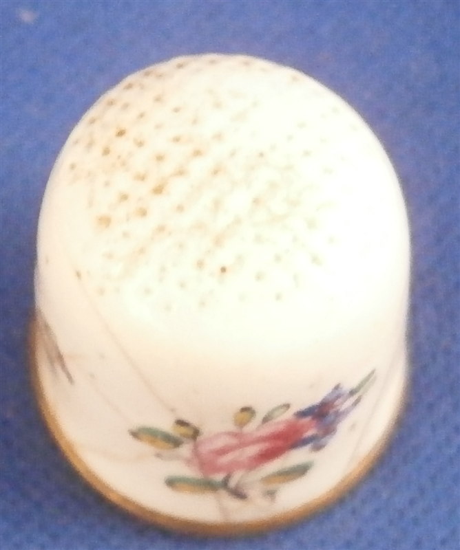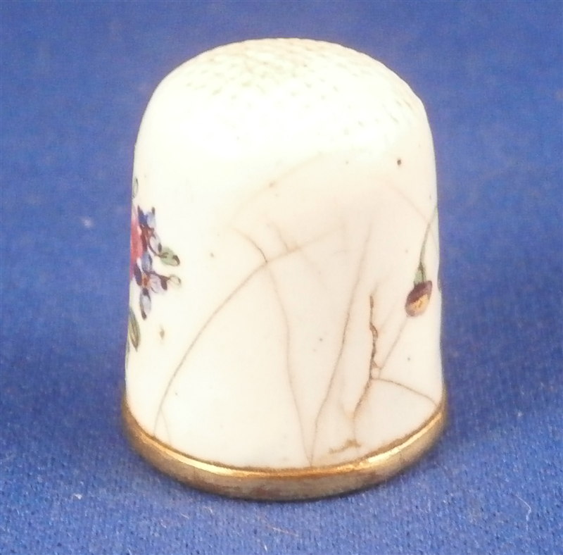 This is a superb little sewing thimble made in England in the 18th century. It was probably made in the Bilston area of Southern Staffordshire. They are famous for their enamel pieces. This piece has some nicely handpainted flowers all around on a white enamel ground color which is probably on copper. The bottom ring is gold colored but not marked so I am not sure metal it is or if it is plated. Cute little piece and not something you come across often. It is in decent condition with hairlines to the enamel as shown. Nothing missing. It displays nicely and is rare enough that I had to have it :) The thimble is 0.75 inches tall and has a bottom diameter of just under 0.625 inches. Please email me for more information or other pictures.