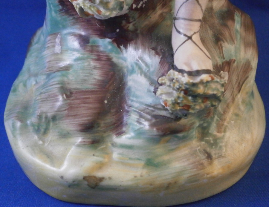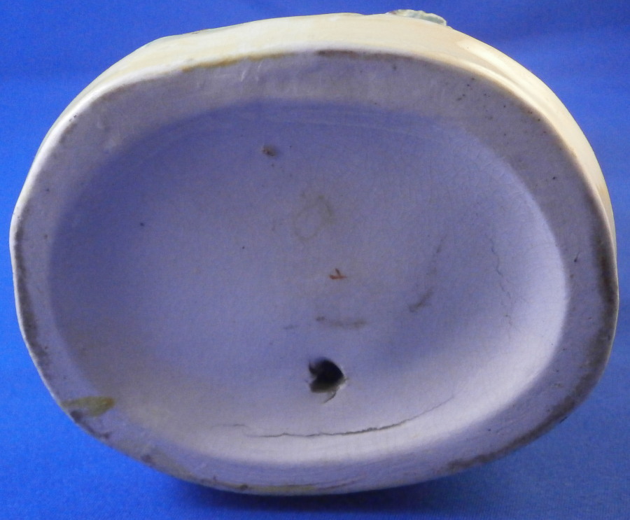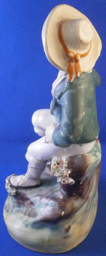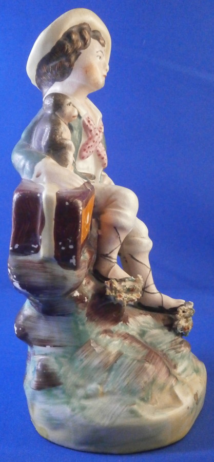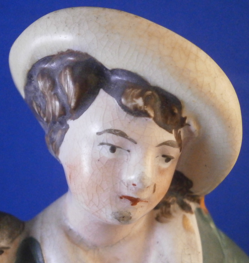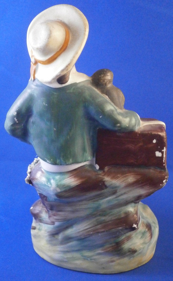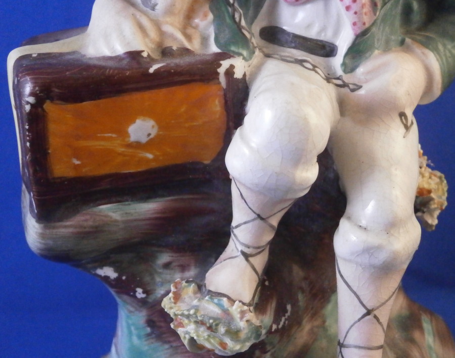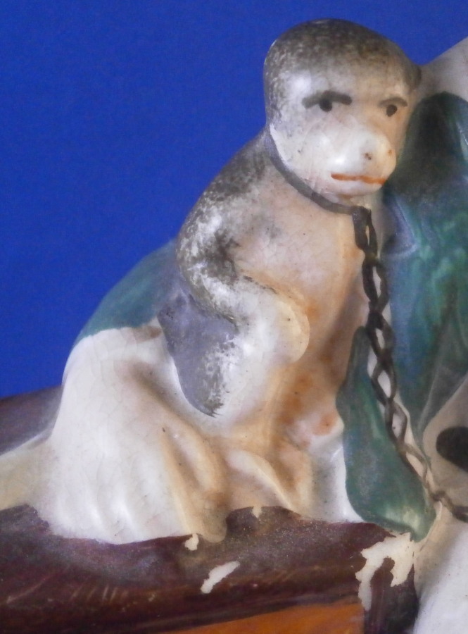 This is a porcelain figurine of gentleman with a moneky made in the Staffordshire region in the mid to late 19th century. He is meant to be an organ grinder with his pet monkey with the geneltman sitting on a nice base with some greenery around his feet and side, the monkey is sitting by his side with the chain from his neck to the man's hand. It's a nice figurine - not as old as I usually buy but it's a great example from this time period. The figure is about 7 inches tall, 3.75 inches wide and 3 inches deep. The piece is in great condition with just some minor paint flaking and some light crazing which is quite typical of these figurines. The figurine is not marked except for a red mark to the udnerside which could be a number but I cannot make much out. Please email me for more information or other pictures.