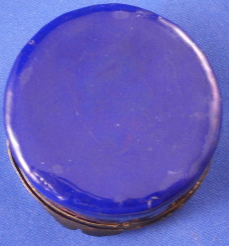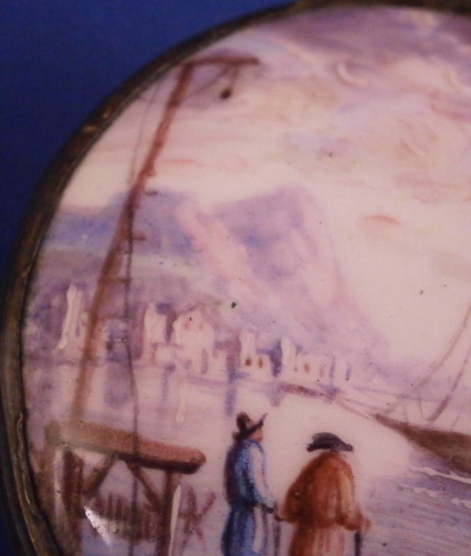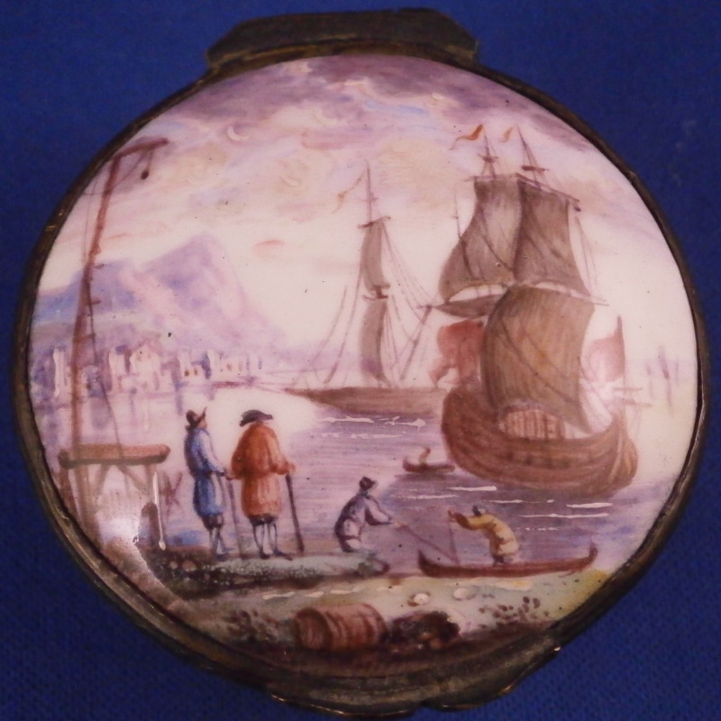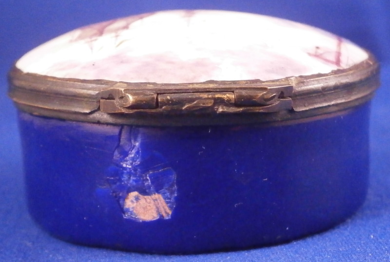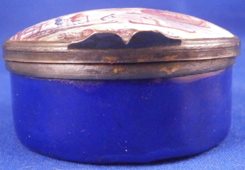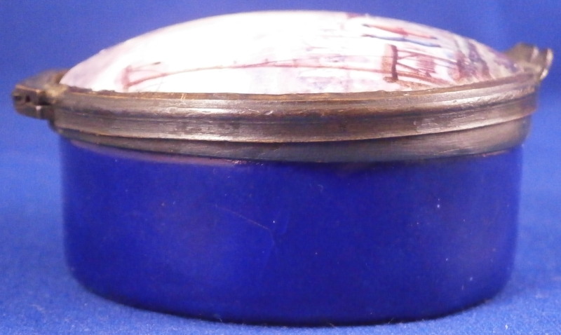 This is a really nice blue ground Battersea enamel over copper pill / patch / snuff box made in England in the 18th century. Probably in the Bilston area of Southern Staffordshire . They are famous for their enamel boxes, etc. The main body has a nice blue ground color to it but the lid is what excited me - it has a really well painted harbor / merchant scene to the top including people, boats, building and everything else you could think of. Really a stunning scene! A flower to the inside lid. The hinges are likely made of brass but they are completely oxidized and really dark now. The box is in good condition with no damage to the top at all but there is some enamel damage to the back of the main body as shown and while the box closes smoothly it does not stay closed but springs back open a little bit. Not a real issue but worth mentioning. All in all a superb piece! The box is 1.25 inches tall and 2.25 inches in diameter. Please email me for more information or other pictures.