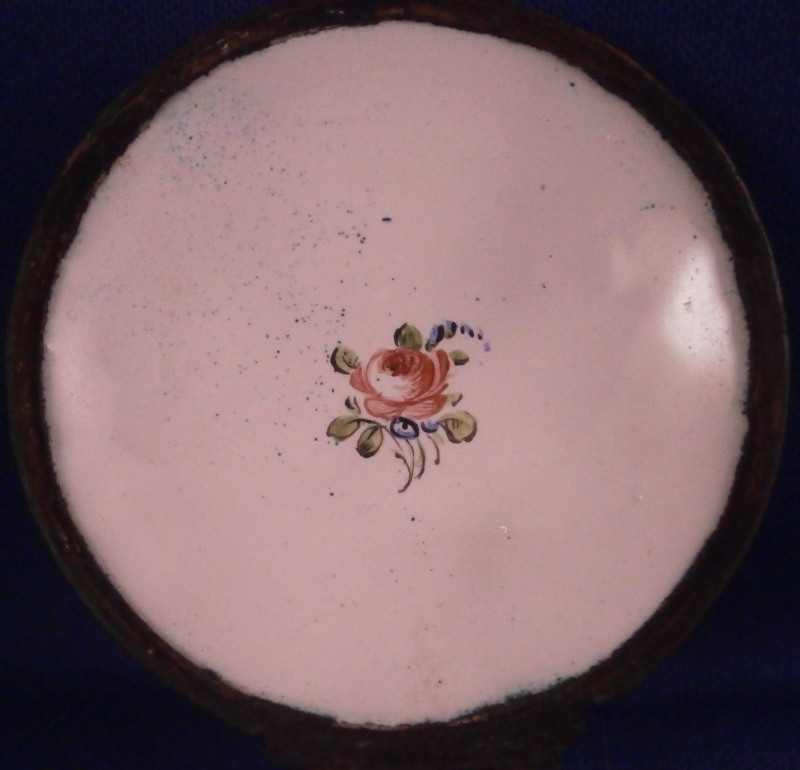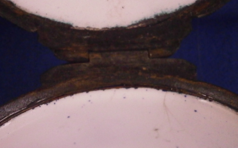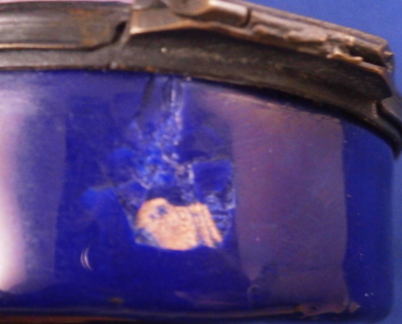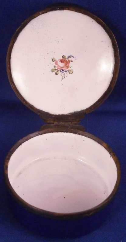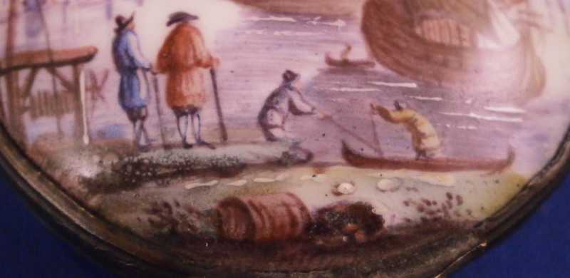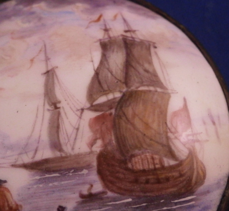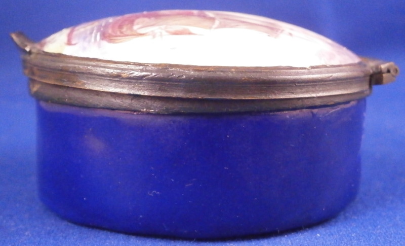 This is a really nice blue ground Battersea enamel over copper pill / patch / snuff box made in England in the 18th century. Probably in the Bilston area of Southern Staffordshire . They are famous for their enamel boxes, etc. The main body has a nice blue ground color to it but the lid is what excited me - it has a really well painted harbor / merchant scene to the top including people, boats, building and everything else you could think of. Really a stunning scene! A flower to the inside lid. The hinges are likely made of brass but they are completely oxidized and really dark now. The box is in good condition with no damage to the top at all but there is some enamel damage to the back of the main body as shown and while the box closes smoothly it does not stay closed but springs back open a little bit. Not a real issue but worth mentioning. All in all a superb piece! The box is 1.25 inches tall and 2.25 inches in diameter. Please email me for more information or other pictures.