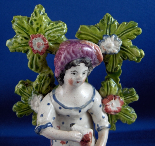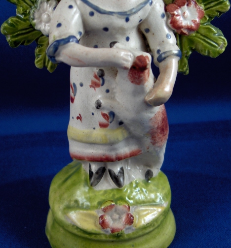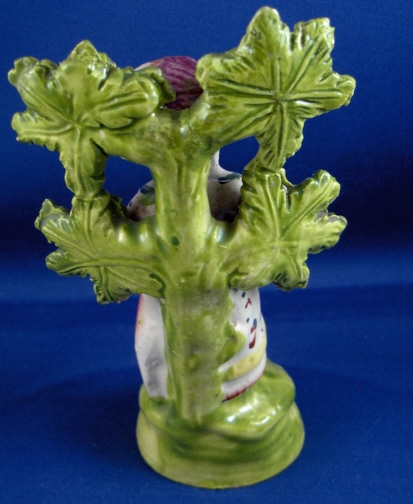 This is a figurine of a lady standing in front of a tree petting a dog (or a sheep) made by one of the Staffordshire makers in the early 19th century. It is very well handpainted and really a nice example. Nice color and detail. The figure is in great condition with a small chip on the dog's ear and one giant leaf of the boccage was redone perfectly. The piece is not marked underneath which is normal for these types of figures. The figurine is 5.75 inches tall, 3.25 inches wide and 1.875 inches deep. Please email me for more information or other pictures.