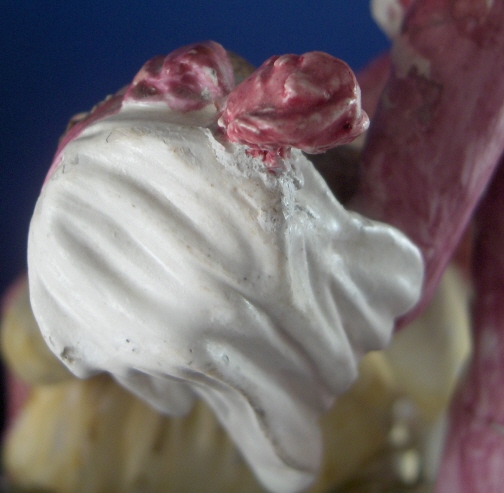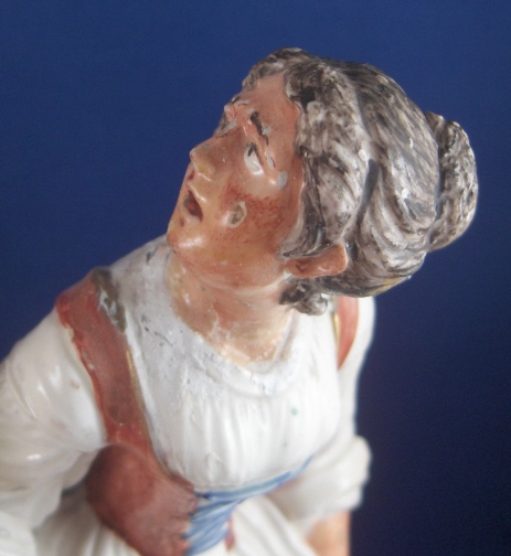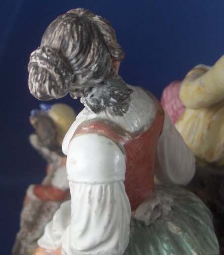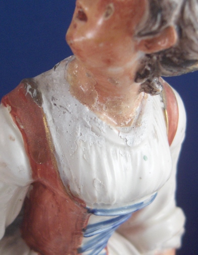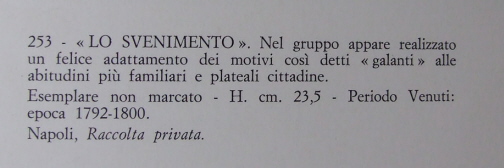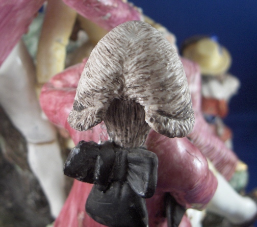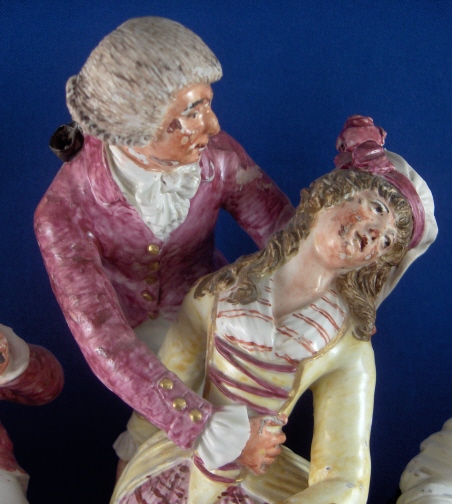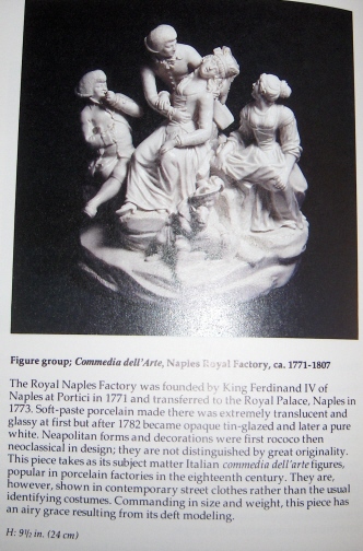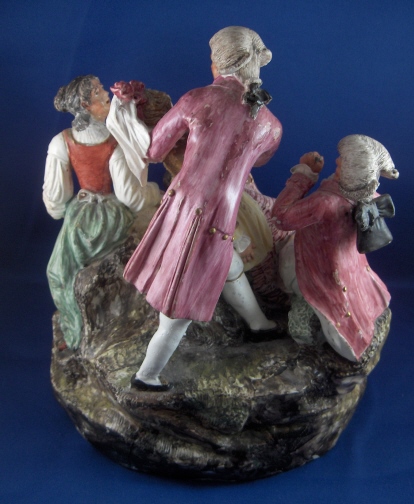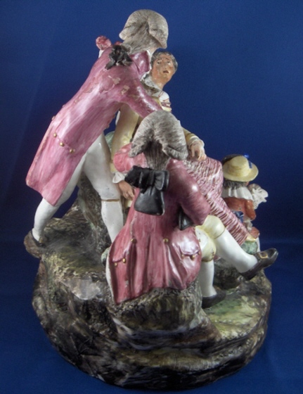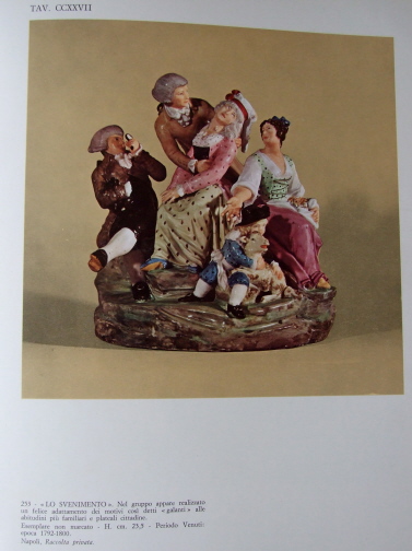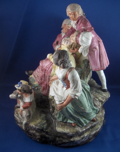 This is a very rare large figurine called "The Fainting" supposedly of the Commedia dell'arte characters in street clothing made by Naples ( Real Fabbrica Ferdinandea ) around 1775. Looks more like a scene from Hogarth to me :) The Capodimonte factory existed near Naples from 1743 until 1759 when it was moved to Buen Retiro. The Naples factory was founded by Ferdinand IV in 1771 and made mostly softpaste at first and later went to soft and hard paste porcelain and looked similar to Capodimonte porcelain but they also worked in other pastes and ceramics. It was around until 1806 when the French occupied it and after that the molds, etc. were sold all over the place. The figurine is made of a superb softpaste and consists of 5 figurines and a sheep on top of a large rock formation type base. There is the fainting lady in the center being held up by one of the gentlemen, another gentleman poses a bit like Napoleon, a boy sits in the front holding the sheep and another lady is on the right side looking at the two figures in the center. The figurine is in decent condition for the size and age but obviously not perfect. The base was broken (I think) and repaired at some point and it is hard to see what exactly was damaged. There is flaking to the paint all around, whatever the gentleman on the left side was holding in his right hand is broken off, one of the sheep's ears is restored, the neck of the lady on the right side was broken, the right leg of the gentleman in the back center is redone and there are some small chips to bows, flowers, etc. It sounds worse than it looks and the figurine is absolutely stunning and very rare! It is unmarked except an area I thought might be incised writing but I cannot make anything out. The entire piece is about 10 inches tall, 8 inches wide and 8 inches deep. This piece is also pictured in the Real Fabbrica Ferdinandea book and I added three pics of that. Please email me for more information or other pictures.