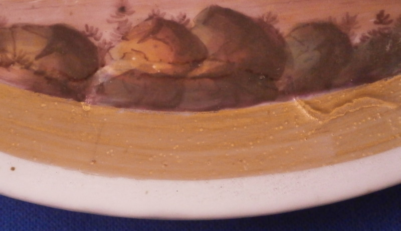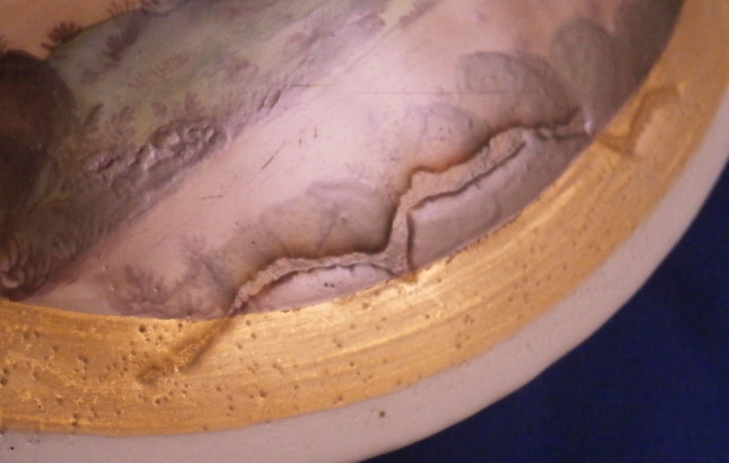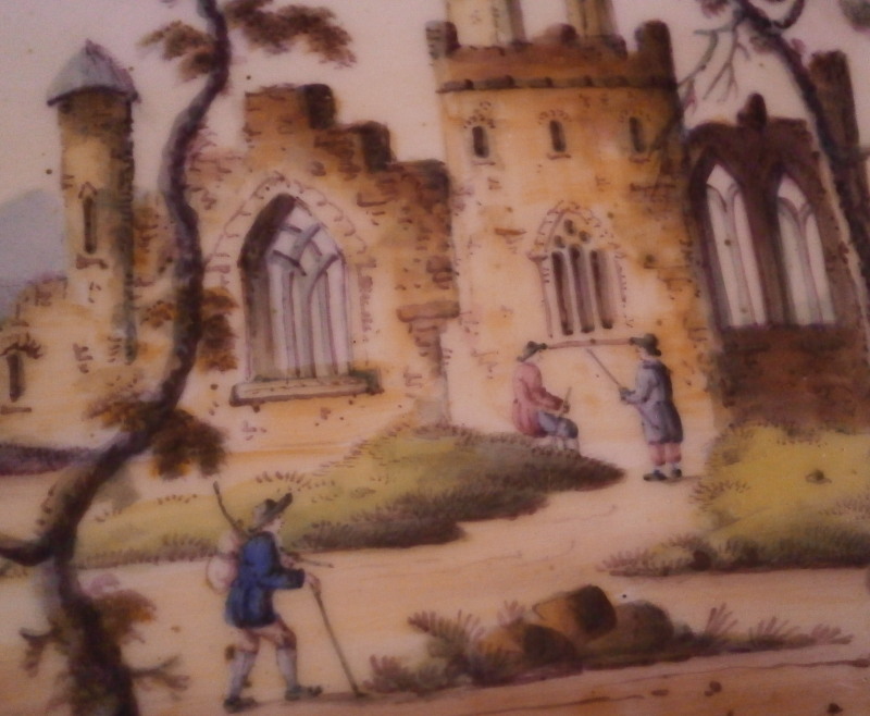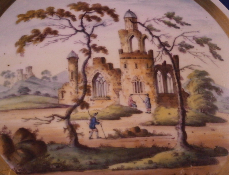 This is a nice round scenic plaque made in the Staffordshire region of England in the early 19th century. The piece has a groove in the back with a metal wire around the tinner part so one can hang it on the wall. The plaque is fully glazed and has a hand painted scene to the front that is quite nice. It includes a ruined building with two people in front of it with another person hiking along a trail in the foreground. A castle to the background and lots of greenery and rocks, etc. all around. Gold trim surrounds the scene with a bit of white showing along the edge. Really a nice scene! The plaque displays very well and is in great condition with a large long line where the glaze had separated during the firing but was covered with paint/gilding during the second firing so it's not all that obvious when displayed. A couple of small black firing spots normal to these early pieces but otherwise it is superb. Not something one comes across often at all! The plaque is unmarked which is the norm around this period of English porcelain. It is 0.75 inches thick and has a diameter of about 8 inches. Please email me for more information or other pictures.