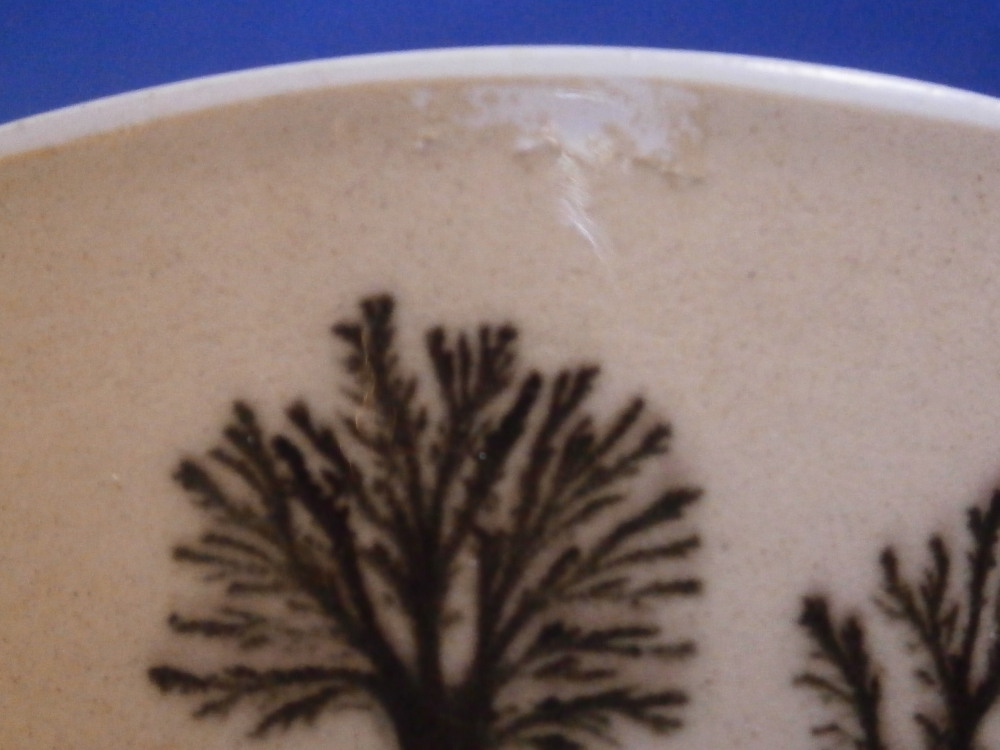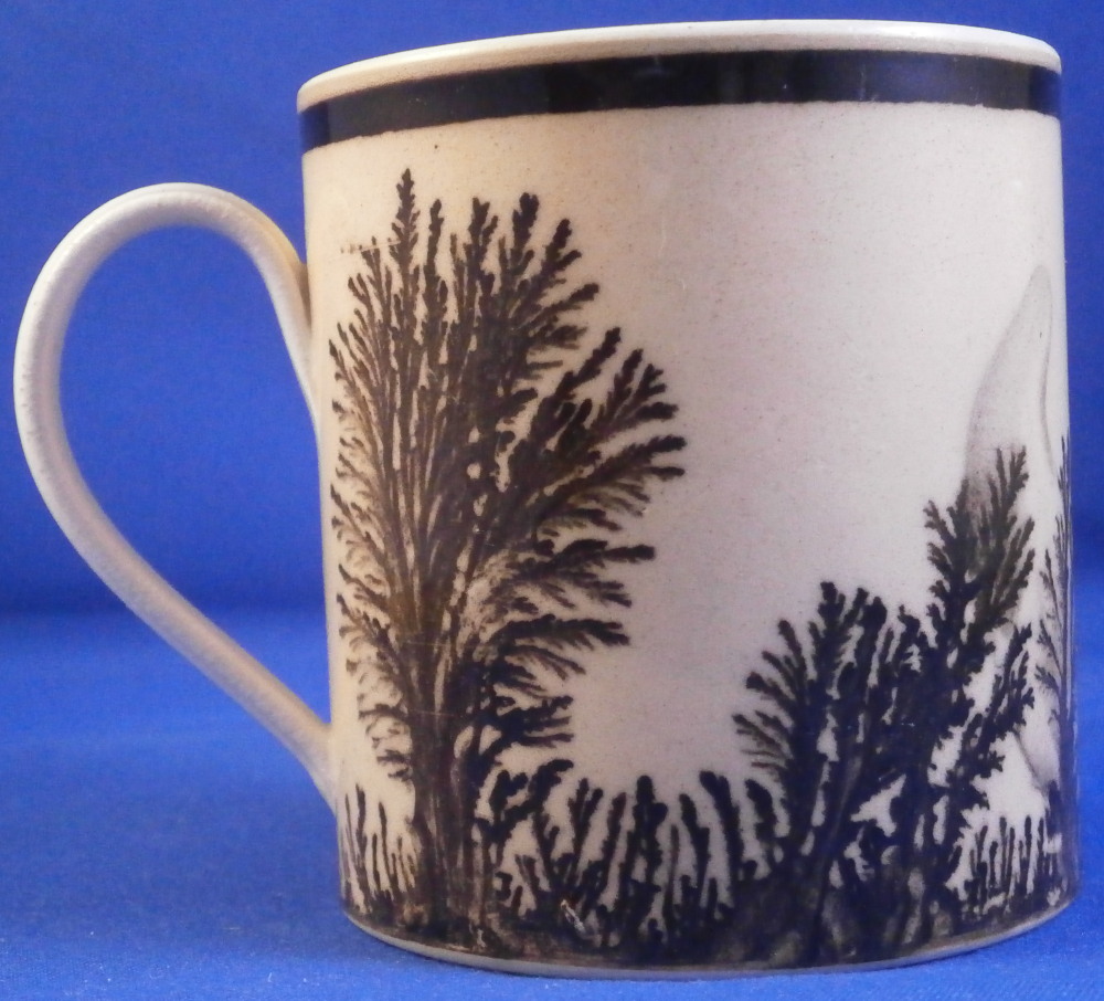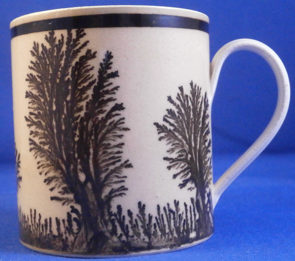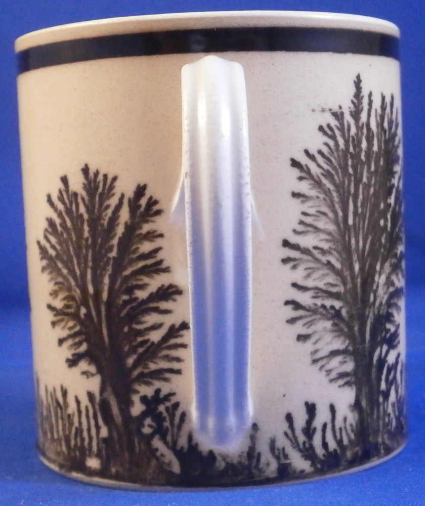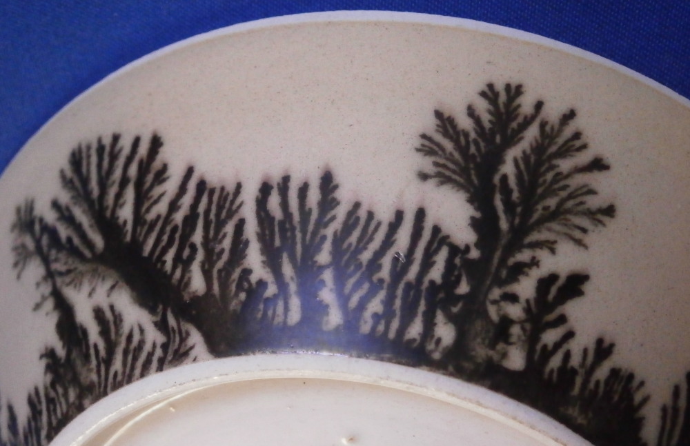 This is a superb Creamware cup and saucer either made in the Staffordshire region of England or by Creil et Montereau of France. I have seen these described as either and am not sure. Definitely an early 19th century set! Made of a creamware type material and often called mochaware because of the dendritic design to it. The paste has a creamy color to it hence its name and the outside of the cup and underside of the saucer have a darker off white ground color to them with the black tree or seaweed looking design to it and a black trim to the edges. Each unique dendritic pattern is created by touching or dripping an acidic tea solution onto the wet slip. The designs are called mochaware because they resemble the patterns found in moss agate. It's a very unique design and one rarely finds it on a cup and saucer set! The set is in great condition. A manufacturing flaw to the underside edge of the saucer where the darker ground color missed a spot, two lines to the inside paste of the cup - indented into the paste - this is not a crack or hairline!! One are of the cup design that has a shadow to it as if the liquid bled a bit instead of growing into the tree design. All from when it was made. It's a great looking set! Neither piece is marked but that is normal for this type of item during this period. An old auction label at the bottom of the cup as shown. The cup is 2.5 inches tall and has a diameter of 2.25 inches and the saucer is 1.125 inches tall and has a diameter of 4.75 inches. Please email me for more information or other pictures.