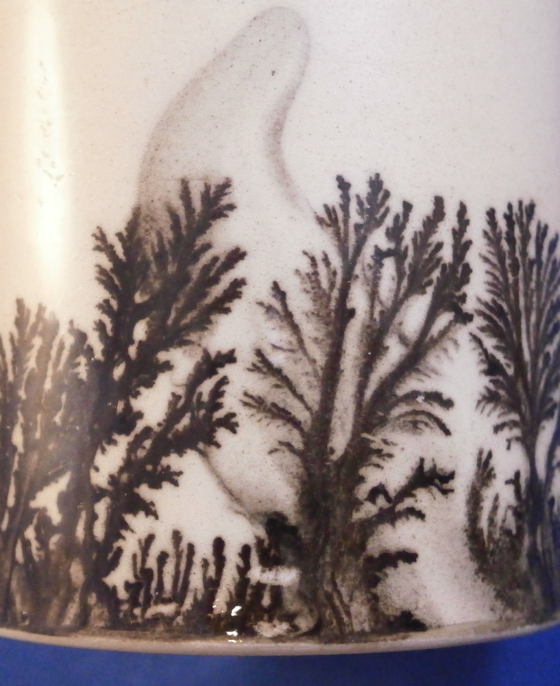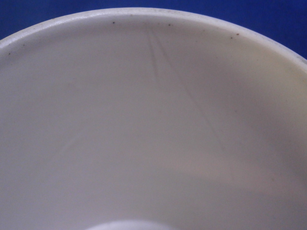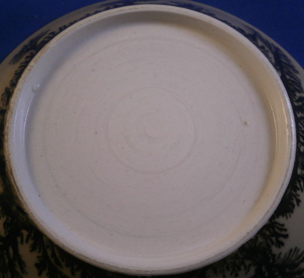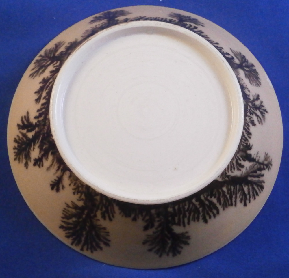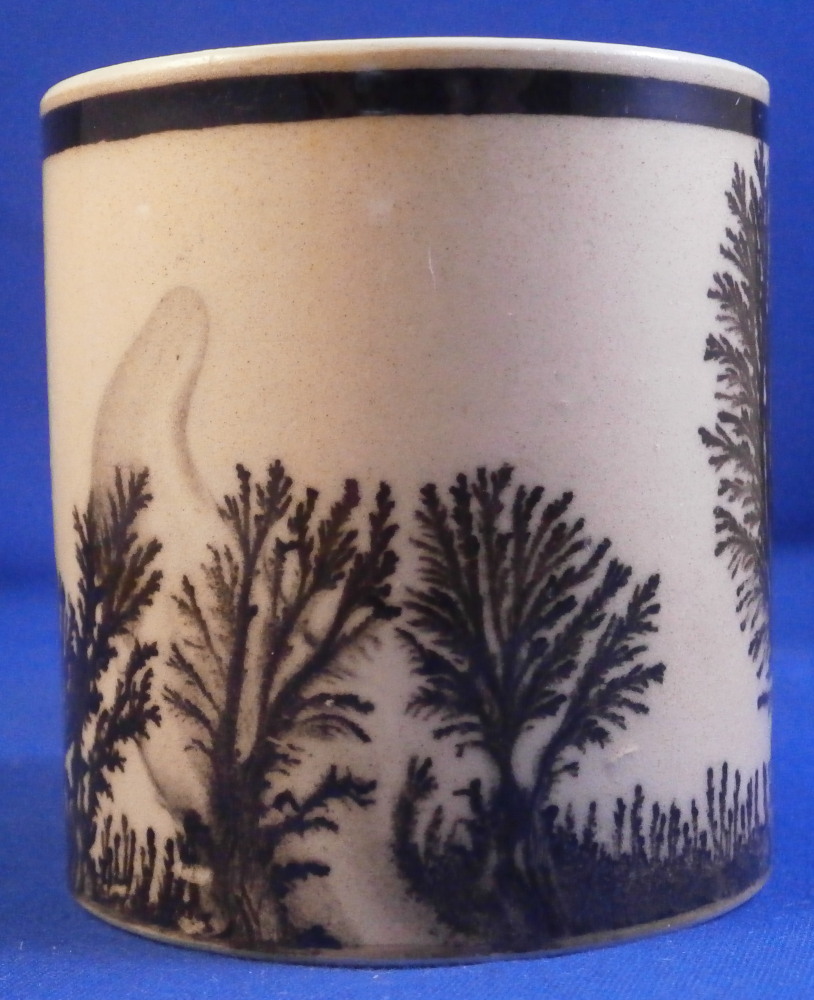 This is a superb Creamware cup and saucer either made in the Staffordshire region of England or by Creil et Montereau of France. I have seen these described as either and am not sure. Definitely an early 19th century set! Made of a creamware type material and often called mochaware because of the dendritic design to it. The paste has a creamy color to it hence its name and the outside of the cup and underside of the saucer have a darker off white ground color to them with the black tree or seaweed looking design to it and a black trim to the edges. Each unique dendritic pattern is created by touching or dripping an acidic tea solution onto the wet slip. The designs are called mochaware because they resemble the patterns found in moss agate. It's a very unique design and one rarely finds it on a cup and saucer set! The set is in great condition. A manufacturing flaw to the underside edge of the saucer where the darker ground color missed a spot, two lines to the inside paste of the cup - indented into the paste - this is not a crack or hairline!! One are of the cup design that has a shadow to it as if the liquid bled a bit instead of growing into the tree design. All from when it was made. It's a great looking set! Neither piece is marked but that is normal for this type of item during this period. An old auction label at the bottom of the cup as shown. The cup is 2.5 inches tall and has a diameter of 2.25 inches and the saucer is 1.125 inches tall and has a diameter of 4.75 inches. Please email me for more information or other pictures.