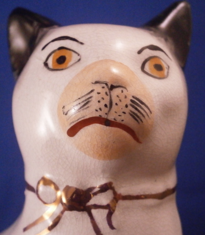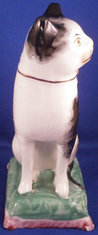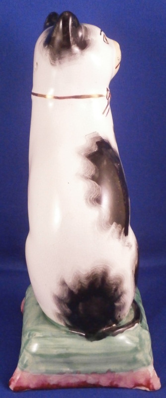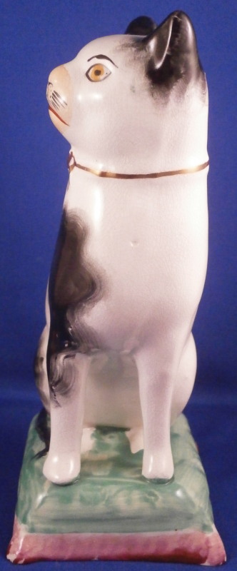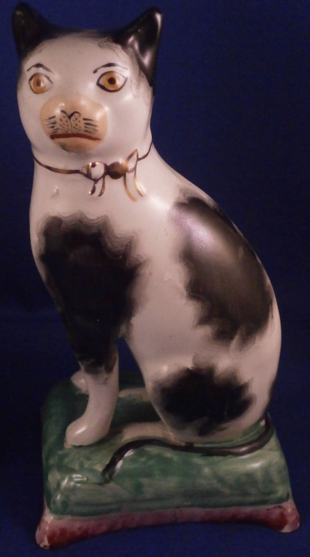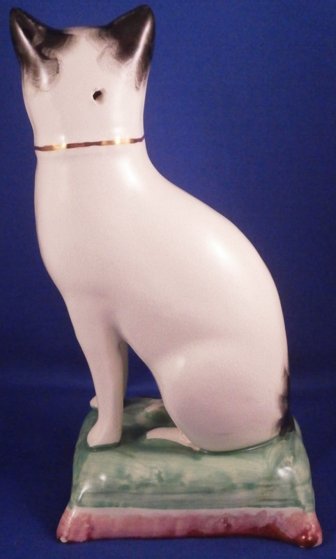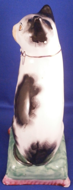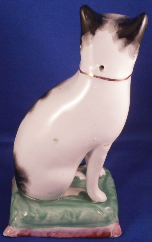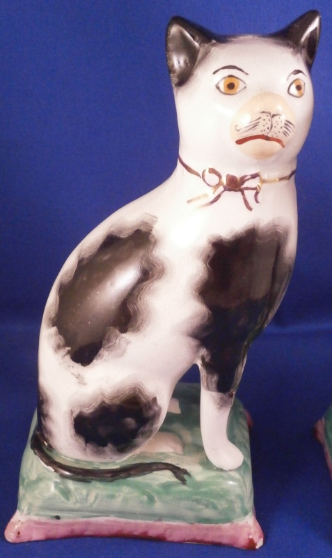 This is a rare proper pair of creamware pottery cat figurines sitting on a green pillow with pink trim made in the Staffordshire region in the early 19th century. It is not easy to find these as a pair and they are a really nice example of this sort of ware. One sees the dogs much more often! Each cat is nicely modeled and decorated with a black decoration and a copper luster bow around their necks. Each figurine is in superb condition with some minor edge nibbles to the corners of the pillows, one has a glaze flake to the black on the back of her neck, a couple of manufacturing flaws like stray paint or a lump or bump to the paste and a firing crack to the bottom edge of one cat and one figure has fine crazing throughout while the other has some craze lines in her belly region as shown and a possible hairline to one leg though it is probably just a stained craze line. The set displays perfectly and is really nice! As is the norm neither figure is marked. One of the figures is 7.25 inches tall while the other is a touch shorter while the pillows are 3 inches deep by 3.625 inches wide. Please email me for more information or other pictures.