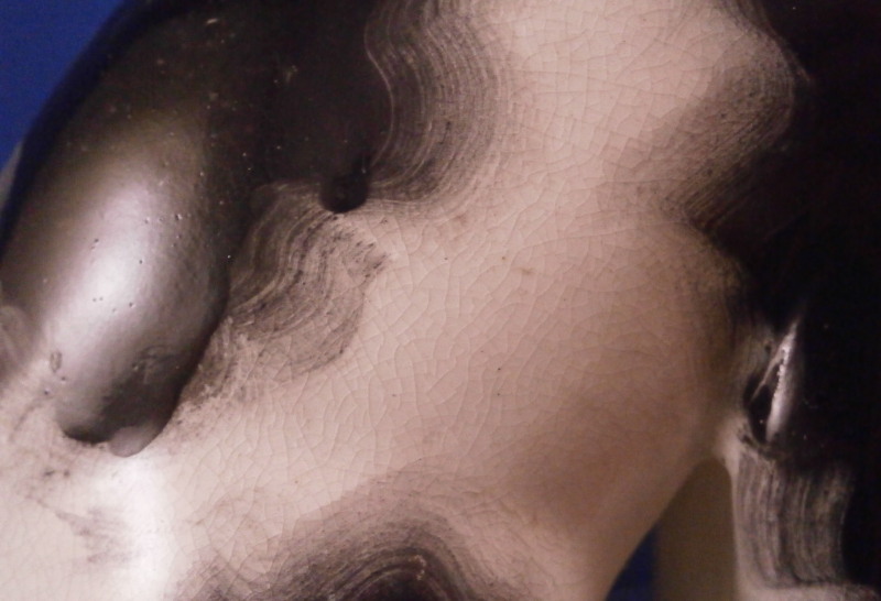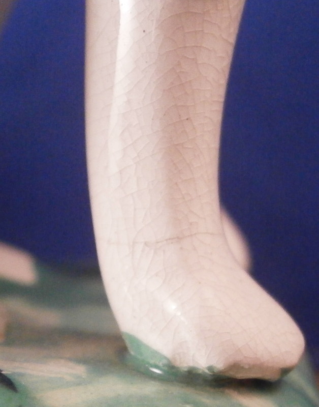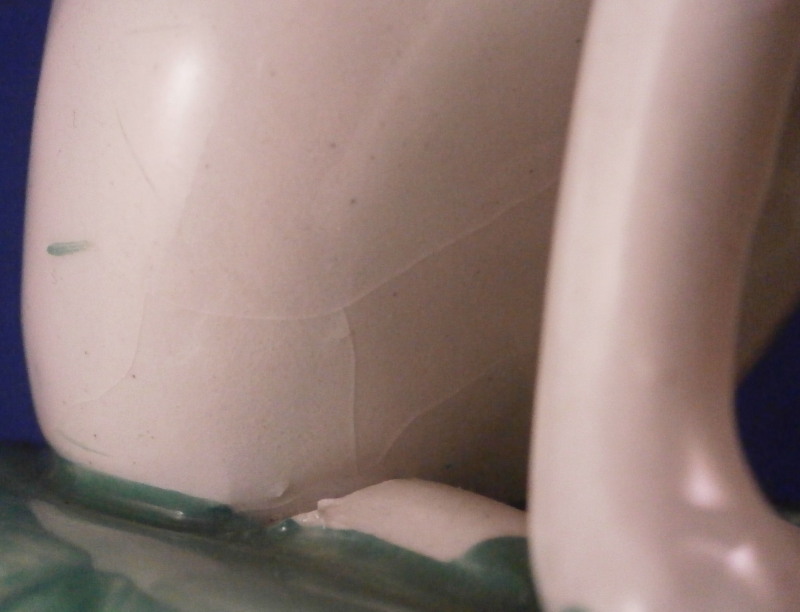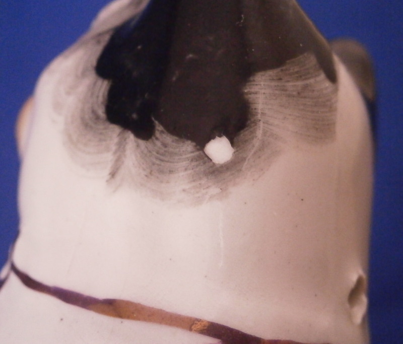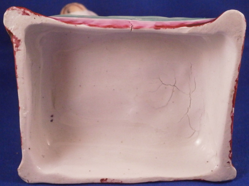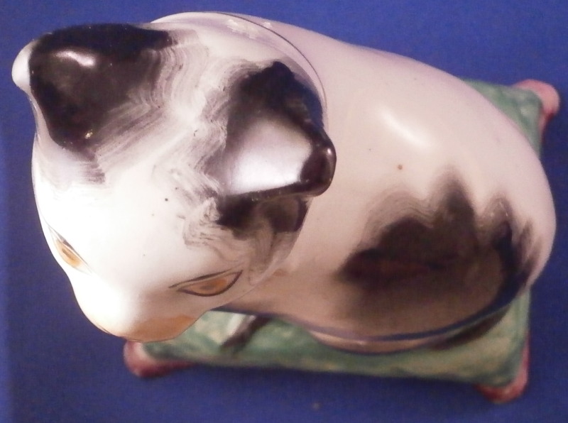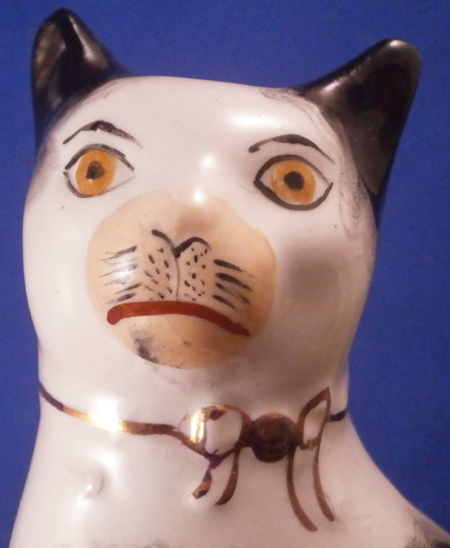 This is a rare proper pair of creamware pottery cat figurines sitting on a green pillow with pink trim made in the Staffordshire region in the early 19th century. It is not easy to find these as a pair and they are a really nice example of this sort of ware. One sees the dogs much more often! Each cat is nicely modeled and decorated with a black decoration and a copper luster bow around their necks. Each figurine is in superb condition with some minor edge nibbles to the corners of the pillows, one has a glaze flake to the black on the back of her neck, a couple of manufacturing flaws like stray paint or a lump or bump to the paste and a firing crack to the bottom edge of one cat and one figure has fine crazing throughout while the other has some craze lines in her belly region as shown and a possible hairline to one leg though it is probably just a stained craze line. The set displays perfectly and is really nice! As is the norm neither figure is marked. One of the figures is 7.25 inches tall while the other is a touch shorter while the pillows are 3 inches deep by 3.625 inches wide. Please email me for more information or other pictures.