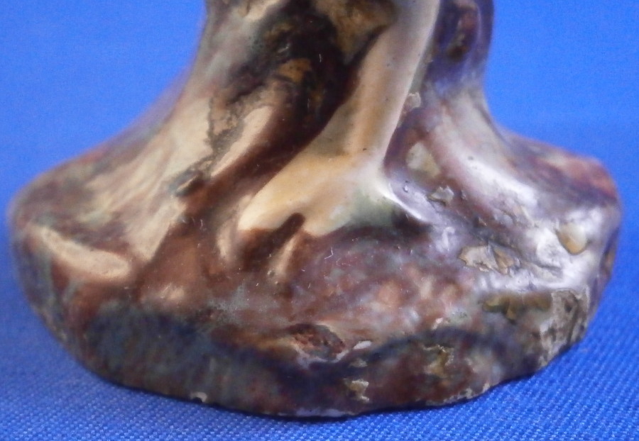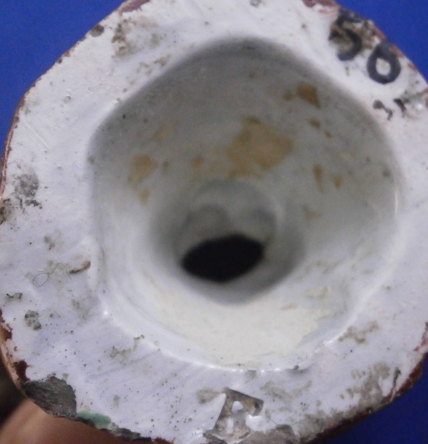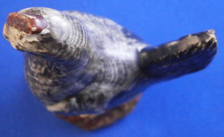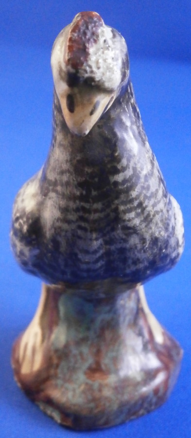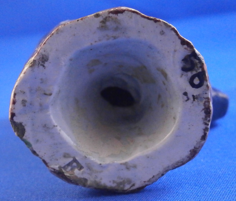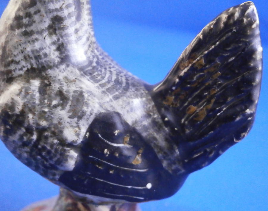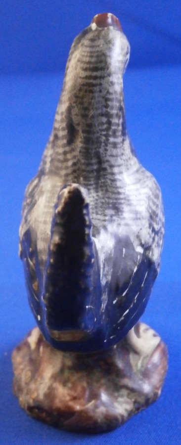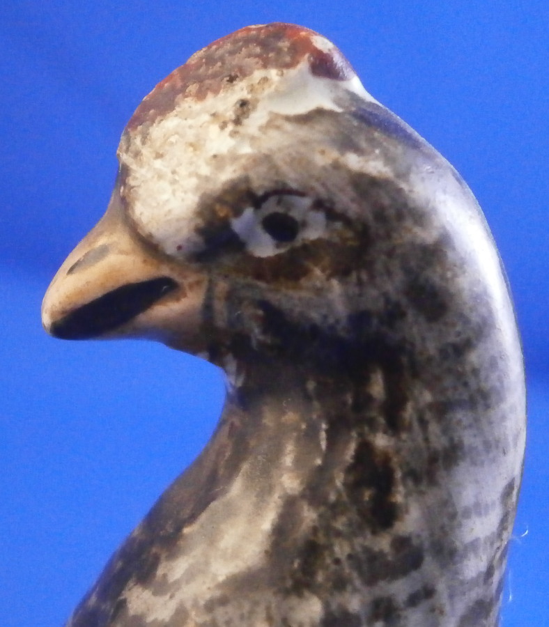 This is a fun miniature pearlware figurine of a chicken made in the Staffordshire region in the early 19th century or possibly even a touch earlier into the very late 18th century. A rare piece to find and I ahve not seen one in this dark colored version before which I really like. The bird is standing on a little base and is superbly modeled and hand painted. The figurine is in great condition with a minor rough spot to the tip of the feathers on one side and the comb got squished during the firing a bit - looks like something stuck to it but it displays superbly and looks wonderful. There isa bit of residue on the tail in the pics but I washed that off now as I didn't realize it was there until I saw it in the pictures. The figure is marked udnerneath which is very unusual. Looks to be a black 56 as a painter's mark and an impressed letter F or E as shown. The piece is 3.125 inches tall, 2.375 inches from beak to tail and 1.5 inches wide. A really fun piece to look at! Please email me for more information or other pictures.