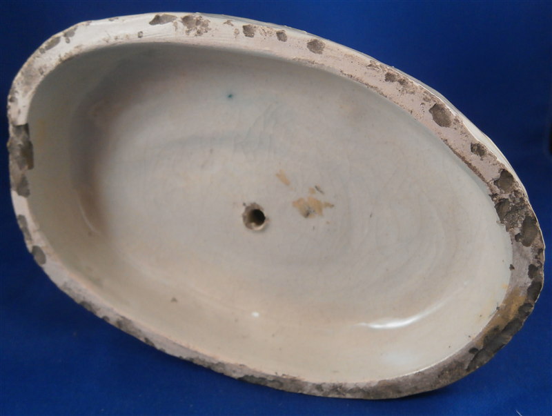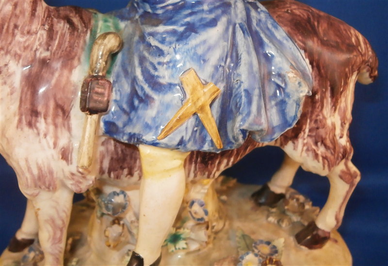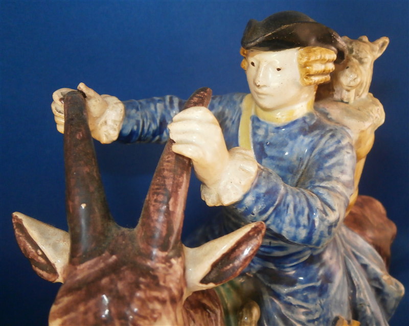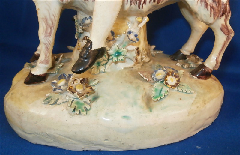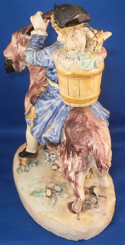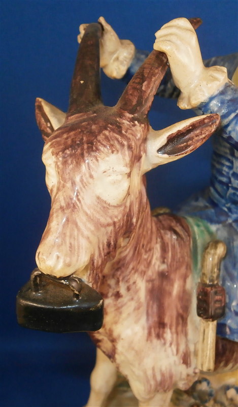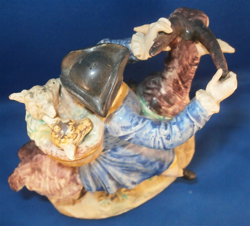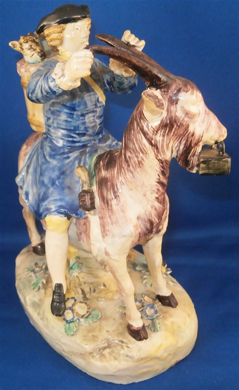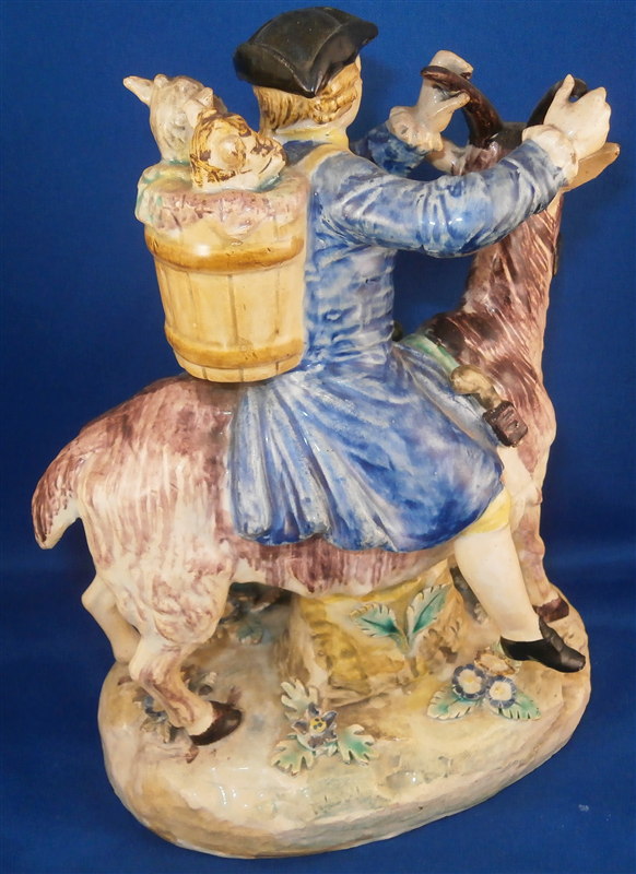 This is a superb figure of the tailor on his gaot after a Meissen original. This one here seems to be made of Pearlware or possibly Creamware and was made in the Staffordshire region in the 18th century. One of the nicest ones I have ever come across from this region! The tailor is sitting on his goat holding the horns with a basket of baby goats on his back. The goat has an iron in its mouth and the tailor has a pair of scissors on his coat as well as a pair of guns that I am fairly sure was not on the Meissen addition. The base has some nicely modeled flowers on it as does the stump udnerneath the goat. All in all a superb and fun figurine! Not sure who exactly made this piece but it is of top quality! The figurine is about 8.25 inches tall, 4 inches wide and 6 inches long. The piece is in superb condition with the top of the scissors missing, a glaze chip to his coat, one of the guns has the barrel missing and the base has some chipping to the bottom edge most of which is likely original to the making! Unmarked as is the norm. Please email me for more information or other pictures.