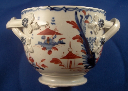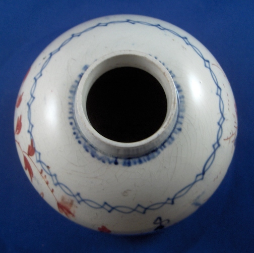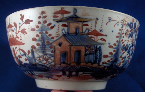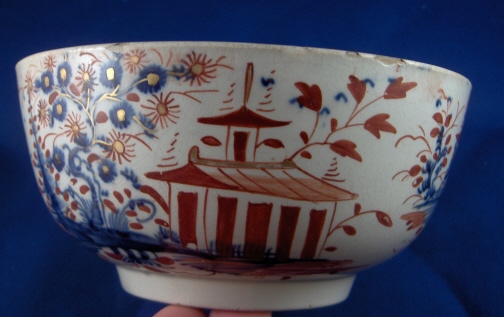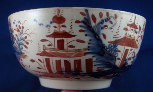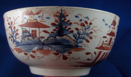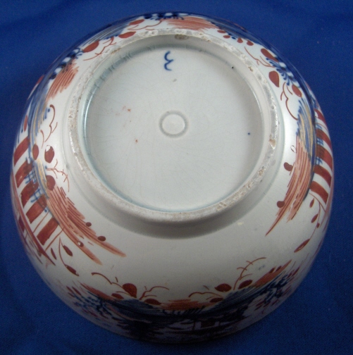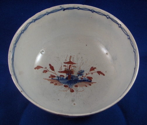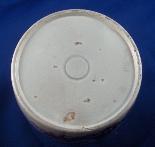 6) Waste Bowl - 4 small rim chips that are mostly glaze chips. Wear to inside bottom but most of inside picture is still there and a few spots of red enamel flaking. One spot of missing glaze on outside like a shallow chip but in the middle of the outside area. It is 2.625 inches tall and 5.75 inches in diameter.