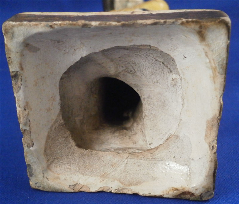 This is an interesting Prattware figurine made in the Staffordshire region in the late 18th century. The figurine is of a gentleman that seems to be cold since he is putting his hands in his coat. Might represent winter. He is well done for this sort of ware - it is more primitive than porcelain usually is but has a certain charm to it that is quite nice! The colors are superb. He displays nicely but has some issues - the right leg has an indent to it going down the side but that is from the making. His head has a weird greenish color to the skin so I am assuming it has been worked on but I cannot tell. On porcelain it is usually easy to figure out but here I am lost. The hat looks to have had some repainting done to it to hide glaze chips but again I am not sure. Either way an attractive piece with some real age to it. Unmarked as is the norm. The figure is about 6.5 inches tall with the base being about 2.625 inches on each side. Please email me for more information or other pictures.