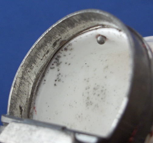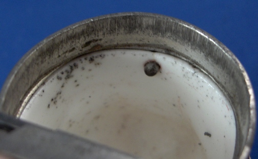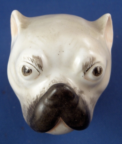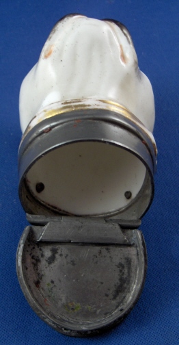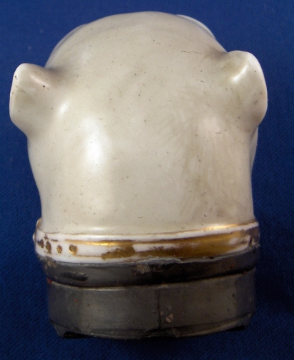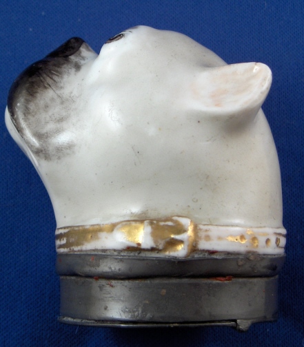 This is a superb patch or snuff box made most likely in the Staffordshire region in England in the early 19th century. The box is shaped like a pug dog's head with nice modeled and handpainted detail to it. There is a gold collar around the base and the metal lid part is made of pewter which was cheaper than silver or gold. The pewter seems to have been painted red at some point as there are tiny red paint fragments left here and there! The pewter was attached the old way by melting it through the porcelain in three spots as shown. The box is in great condition with the red paint almost entirely gone on the pewter and some wear mostly to the gold collar. No chips, etc. Some black firing spots on the inside. The piece is not marked but certainly about 200 years old and most likely from Staffordshire. Someone about 130 years ago has scratched a date into the pewter that seems to say Sept. 16 1874 but that is not the date of manufacturing. The box is 2.375 inches tall, 1.875 inches wide and 2.25 inches deep. Please email me for more information or other pictures.