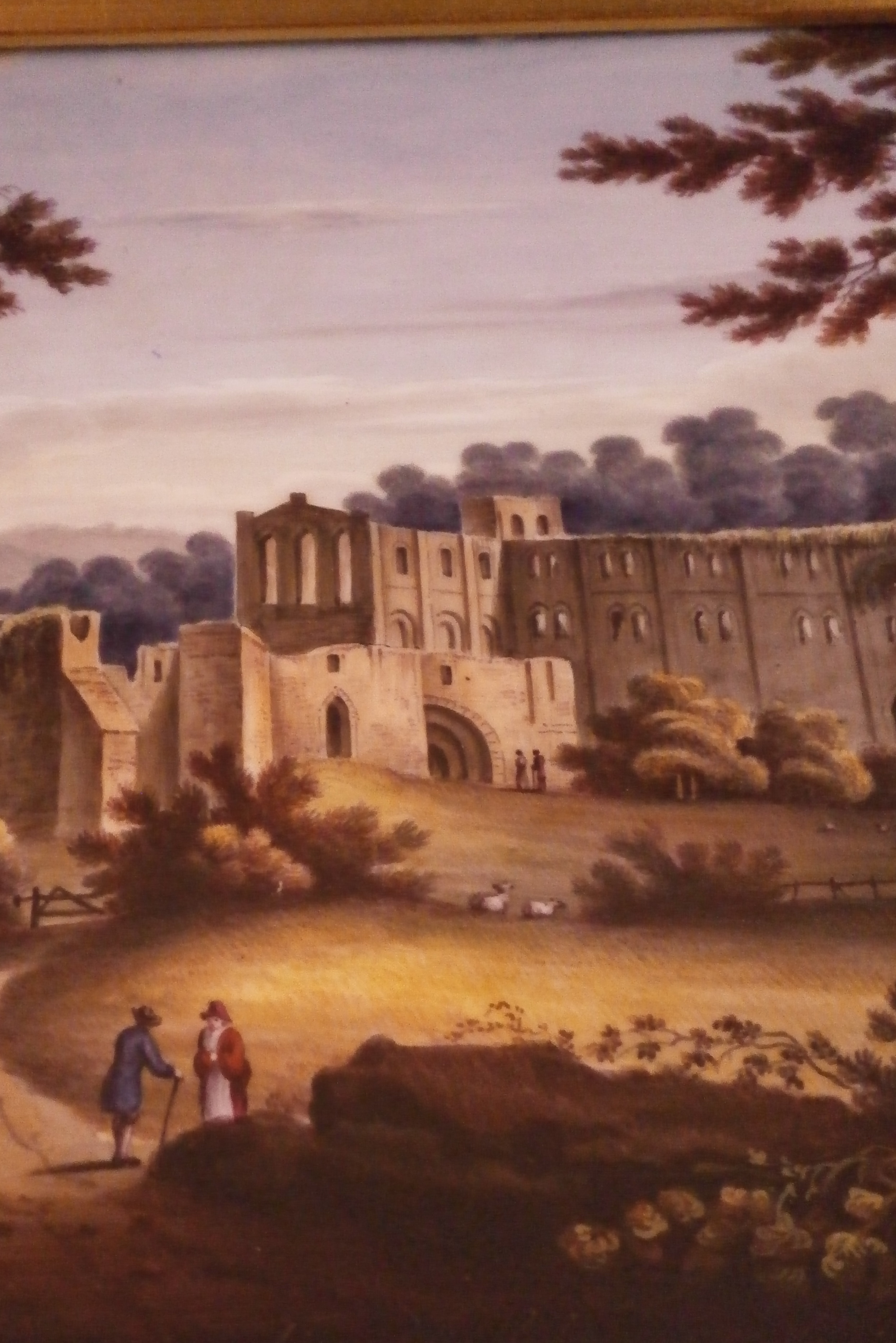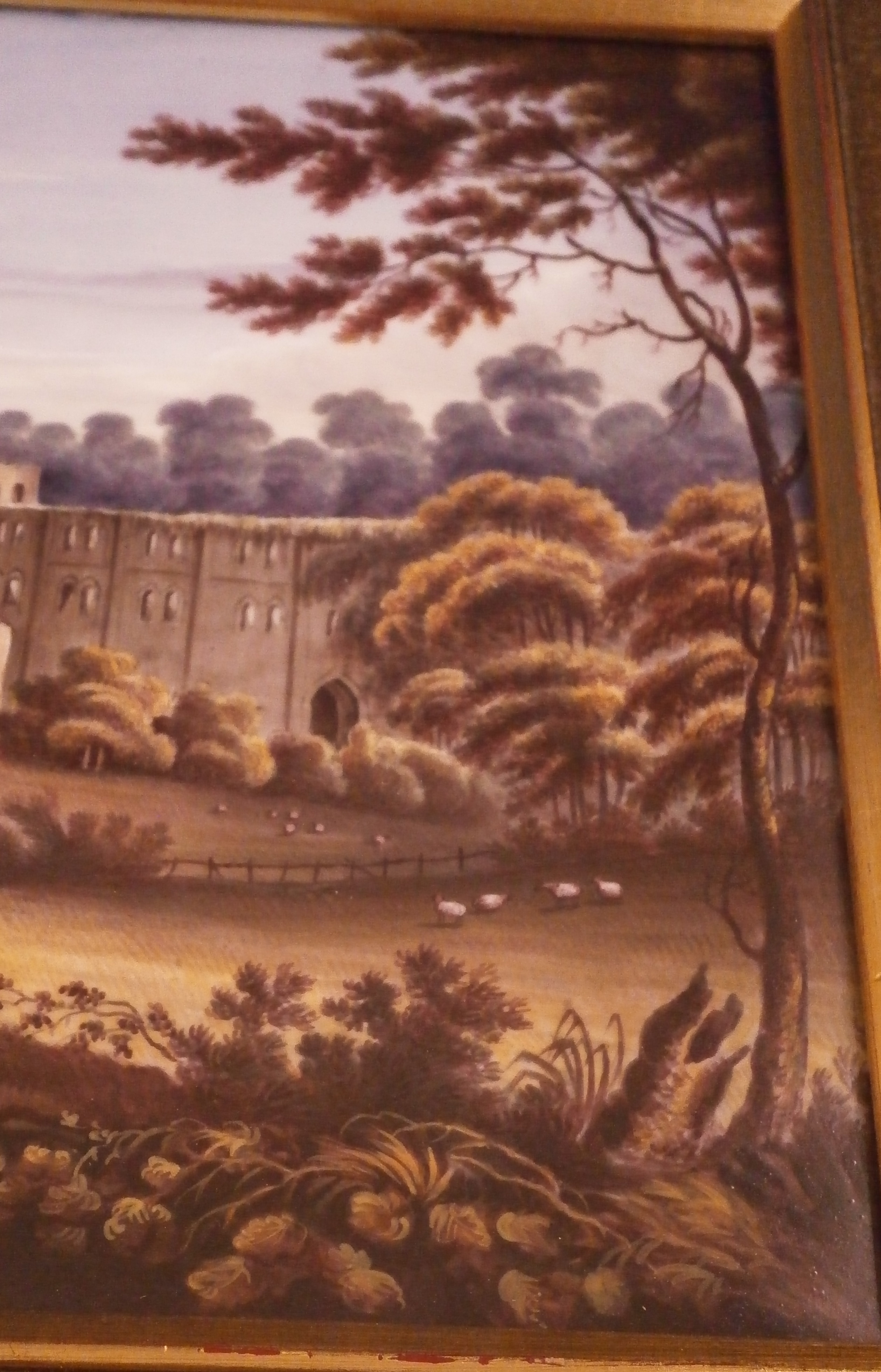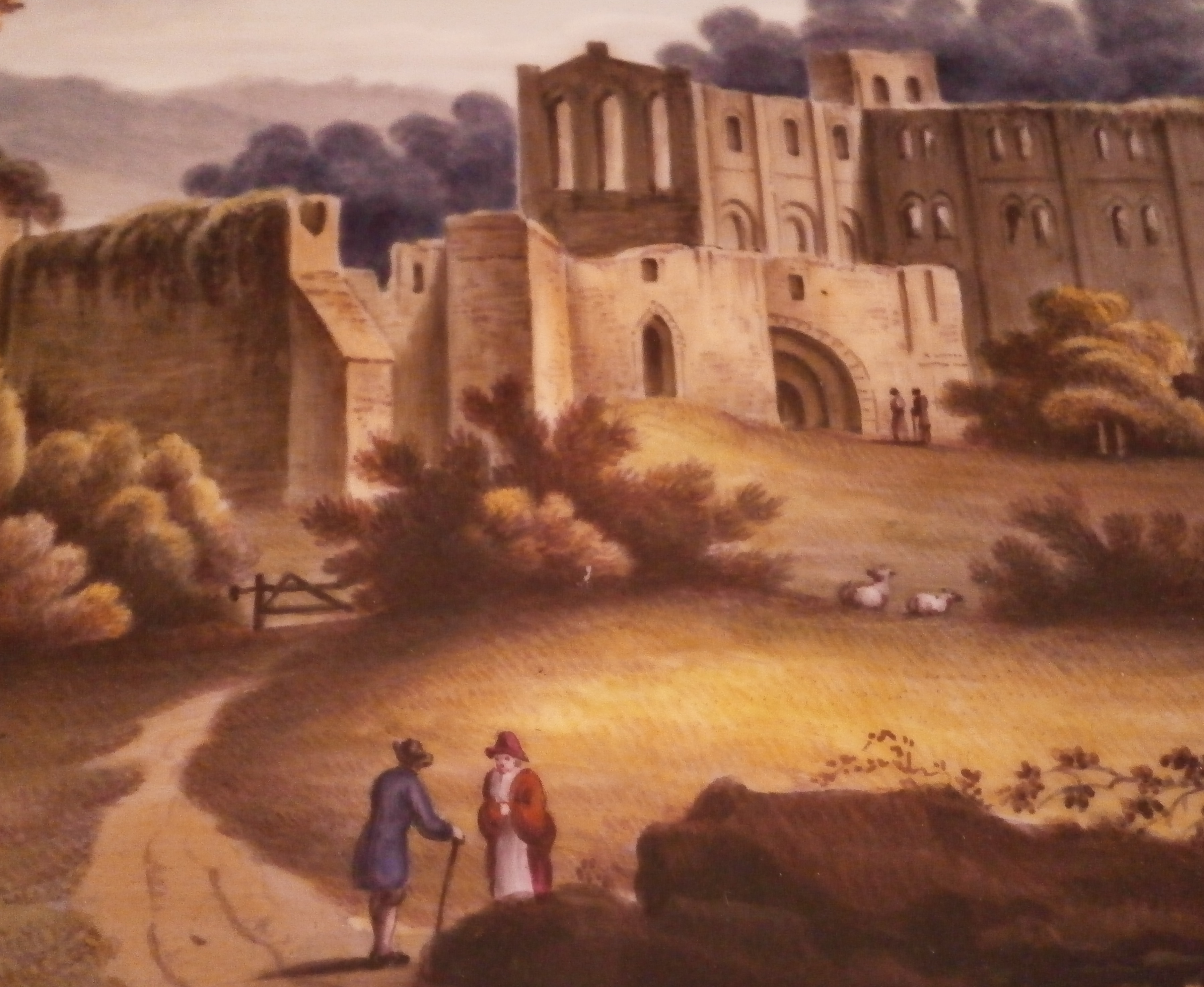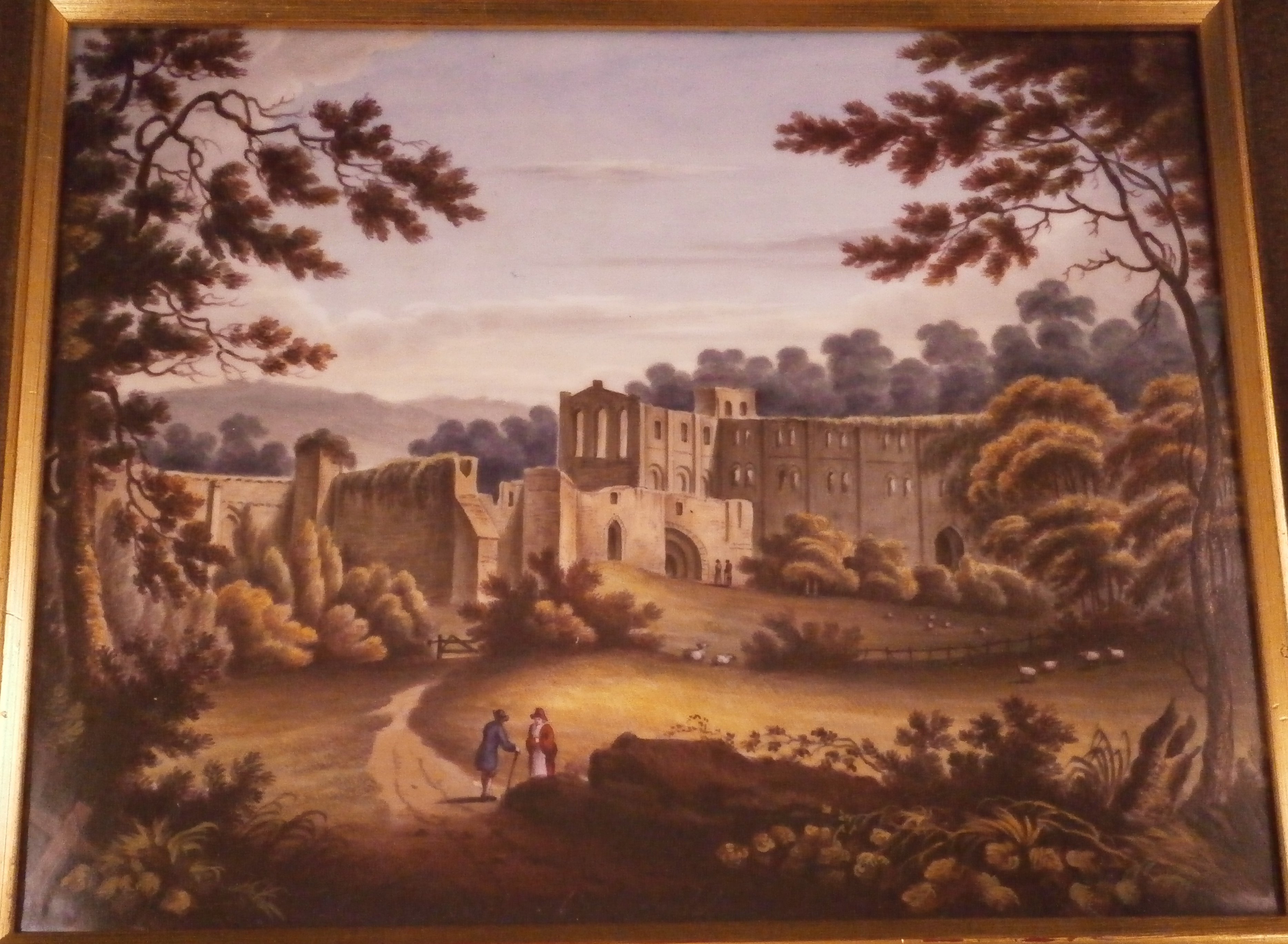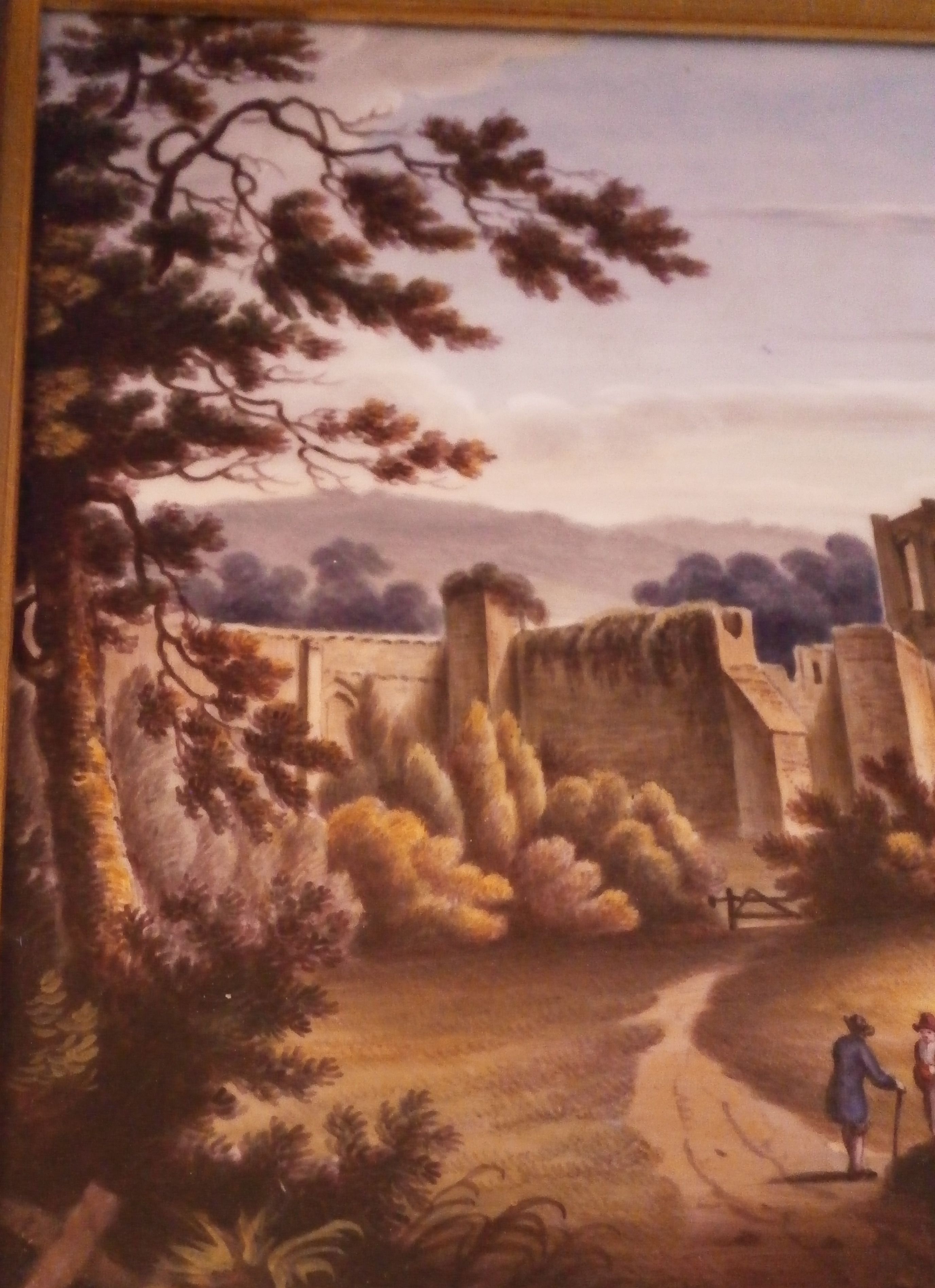 This is a nice large scenic plaque made in the Staffordshire region of England in the early 19th century. The piece is hand painted with a superb scene including a large at least partially ruined building with two people right in the front and two more along a path leading up to the castle, some sheep on a pasture nearby and lots of greenery all around. A really well done piece of a nice size! There is a title written on the bottom part of the scene that I just aw now but I cannot make out what it says as it blends in perfectly with the brown ground. Some sort of Abby Yorkshire maybe but that is more guessing than reading. The plaque is in perfect condition and comes in a nice older frame that is gilded and has a fuzzy cloth part with another gold tiny frame toward the scene. A couple of small issues to the frame but it displays nicely the way it is and does not need to be replaced. The plaque is likely unmarked but since the back is closed up I am not going to rip it open. So the buyer might find a surprise there. The entire piece in the frame is 13.5 inches wide 11.5 inches tall and about 1.5 inches thick. The visible plaque is 9.125 inches wide by 7.25 inches tall. Please email me for more information or other pictures.