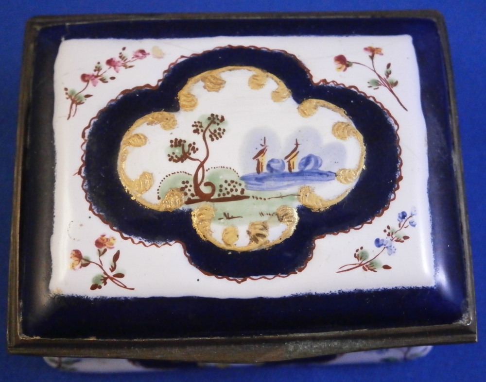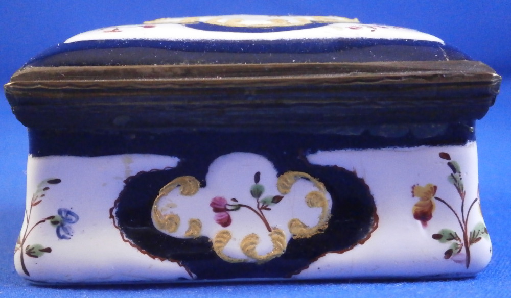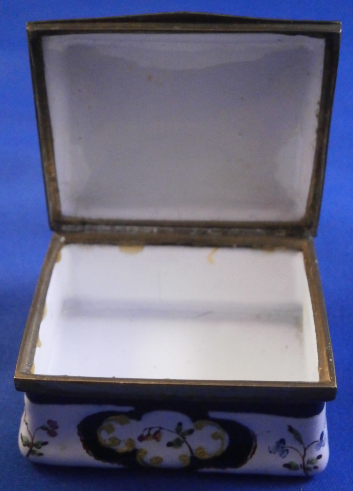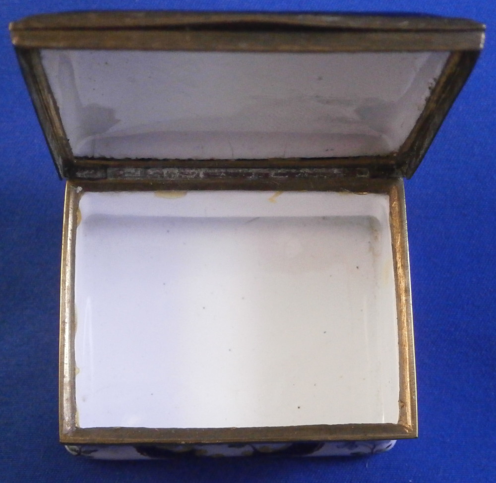 This is a cute little enamel on copper box made in England - probably in the South Staffordshire region - in the late 18th century. Probably in the Bilston area or possibly Birmingham or even London but definitely English from the 1700s. They are famous for their Battersea enamel boxes, etc. This here is a true snuff box / tabatiere / pill box and it is a really fun piece! Smaller than most I have owned but really nicely done. The box is decorated on the outside lid with a little hand painted landscape scene in a quatrefoil shape with some raised gold trim around the edge and cobalt blue trim around that Four little flowers to the corners. Cobalt blue trim around the edgeI have not owned a piece with cobalt blue decoration before and that in combination of the gilding is superb! Each of the sides has a similar design to it eacept instead of scenes in the center there are more flowers. The underside and inside is white. The metal mounts are gold colored so probably brass. The box is in great condition with just some damage to the left side - bottom right corner mainly as shown. The piece displays perfectly and the lid closes nicely and stays shut. A really cute little example! The box is 1.125 inches tall,2.125 inches wide and 1.625 inches deep. Please email me for more information or other pictures.