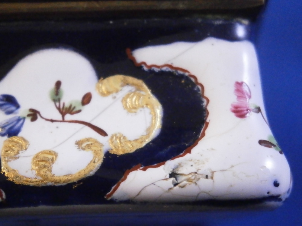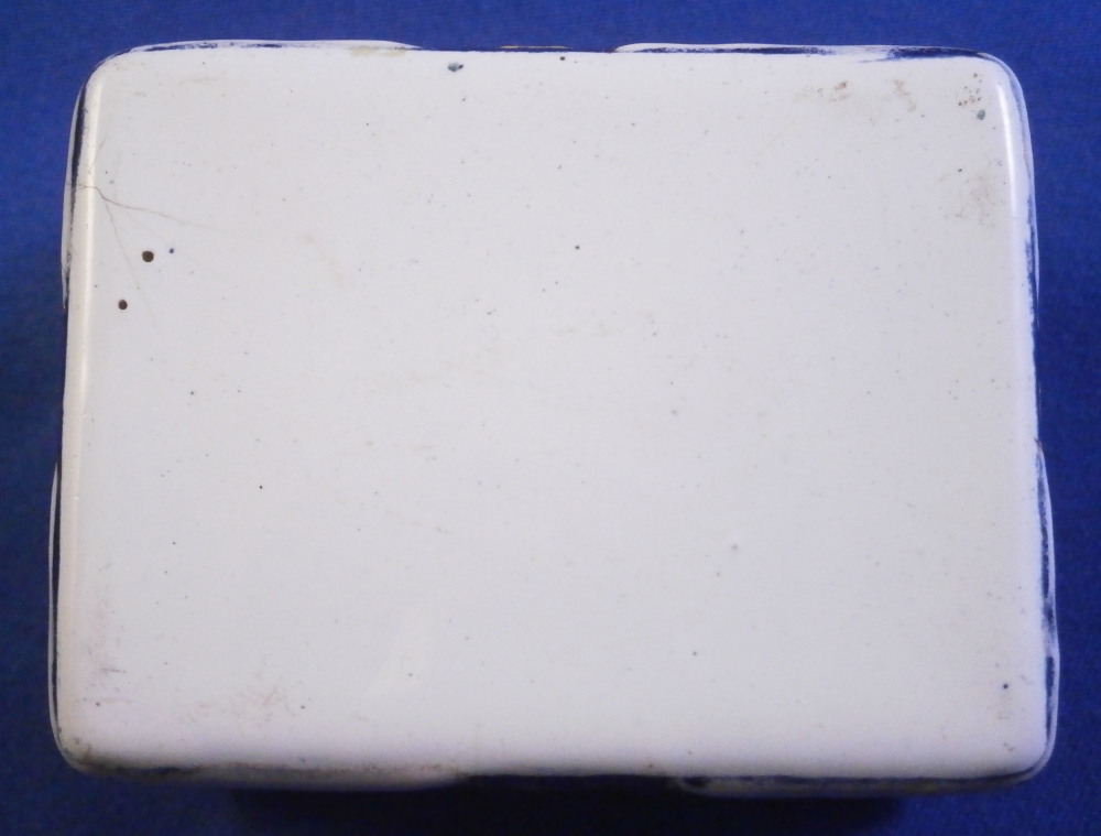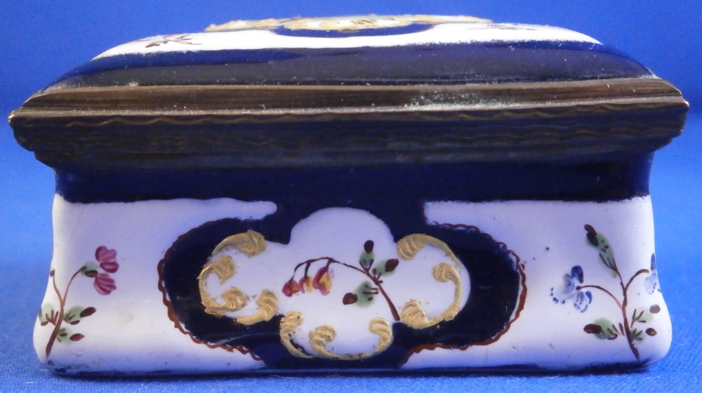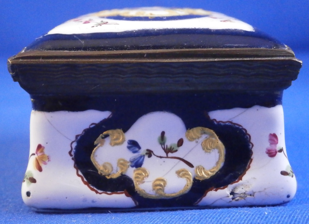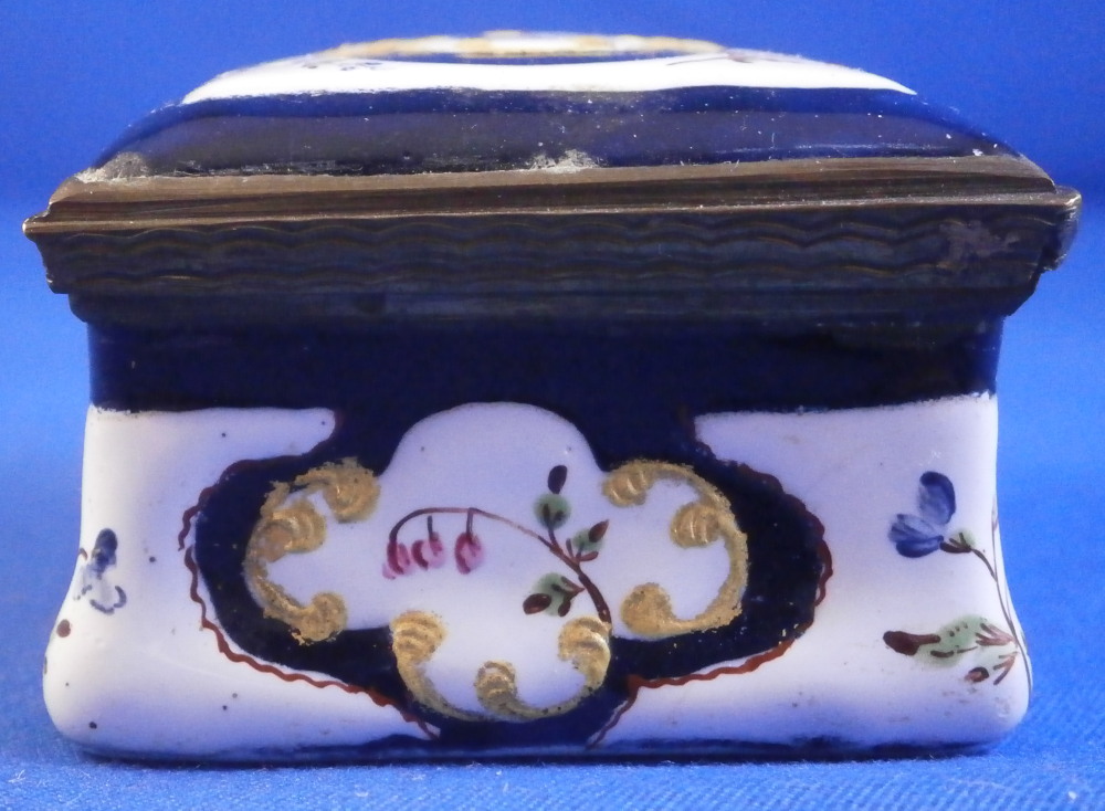 This is a cute little enamel on copper box made in England - probably in the South Staffordshire region - in the late 18th century. Probably in the Bilston area or possibly Birmingham or even London but definitely English from the 1700s. They are famous for their Battersea enamel boxes, etc. This here is a true snuff box / tabatiere / pill box and it is a really fun piece! Smaller than most I have owned but really nicely done. The box is decorated on the outside lid with a little hand painted landscape scene in a quatrefoil shape with some raised gold trim around the edge and cobalt blue trim around that Four little flowers to the corners. Cobalt blue trim around the edgeI have not owned a piece with cobalt blue decoration before and that in combination of the gilding is superb! Each of the sides has a similar design to it eacept instead of scenes in the center there are more flowers. The underside and inside is white. The metal mounts are gold colored so probably brass. The box is in great condition with just some damage to the left side - bottom right corner mainly as shown. The piece displays perfectly and the lid closes nicely and stays shut. A really cute little example! The box is 1.125 inches tall,2.125 inches wide and 1.625 inches deep. Please email me for more information or other pictures.