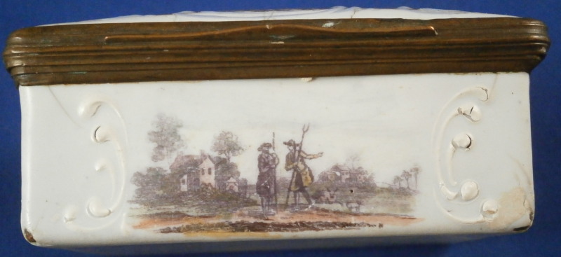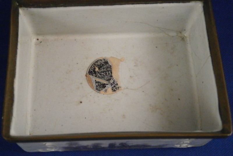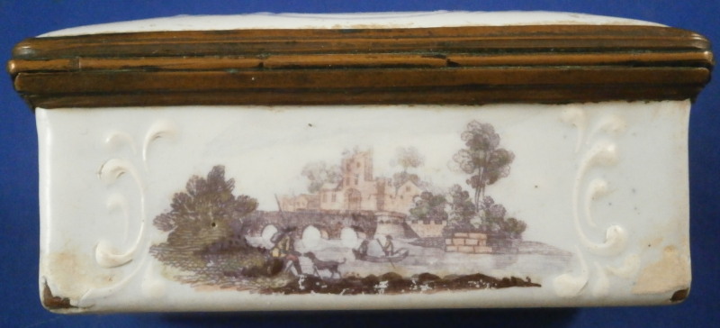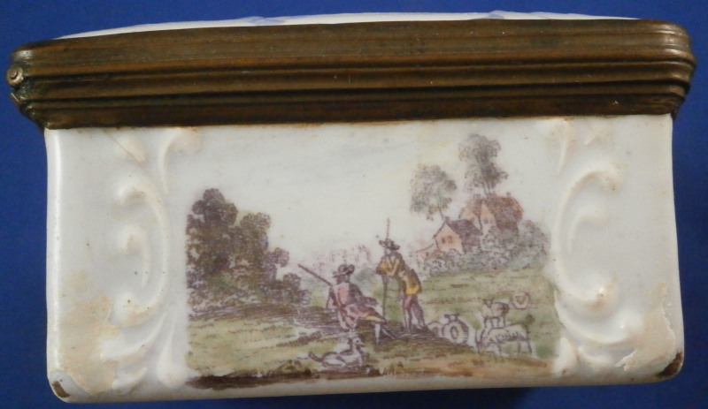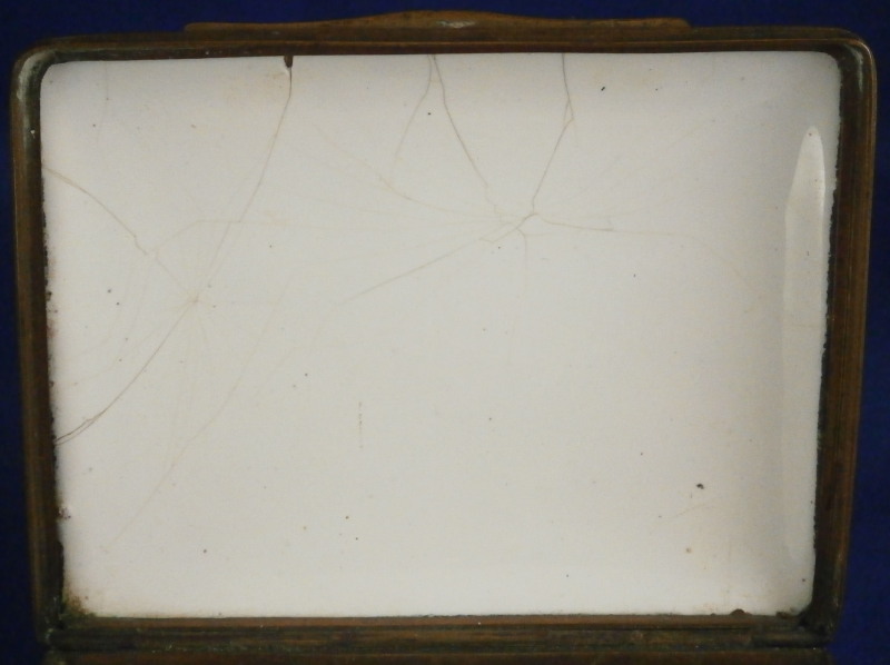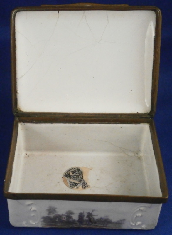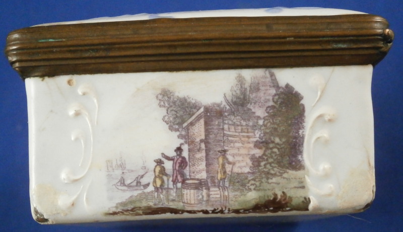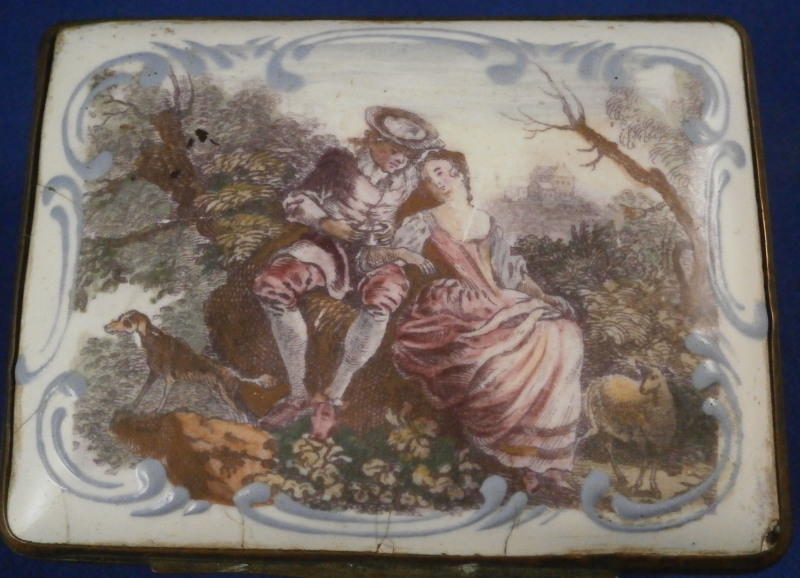 This is a nice larger box made in England - probably in the South Staffordshire region - in the late 18th century. Probably in the Bilston area. They are famous for their Battersea enamel boxes, etc. Not sure if this would be considered a patch box or tabatiere / snuff box but either way it is a fun piece! The box is decorated with lots of difference transfer printed scenes all around which have been colored in by hand, a bit of a raised design around the scenes - in white on the sides and in blue on the lid as shown. The scene to the top is superb! The metal mounts are copper I believe. The box is in pretty good condition given what they often end up looking like but it does have the usual issues of stress cracks though less than most one sees and not very long ones either on the outside. The inside has some longer ones but since there is no design to it it does not matter as much I think. The corners to the outside bottom have the enamel covering worn or chipped away as does one small corner of the lid. The piece displays very well and is a bit unusual with the transfer design that was painted in. The lid closes nicely and stays shut. All in all a great example! The box is 1.375 inches tall, 3.25 inches wide and 2.5 inches deep. Please email me for more information or other pictures.