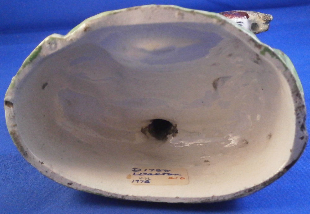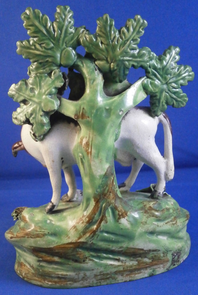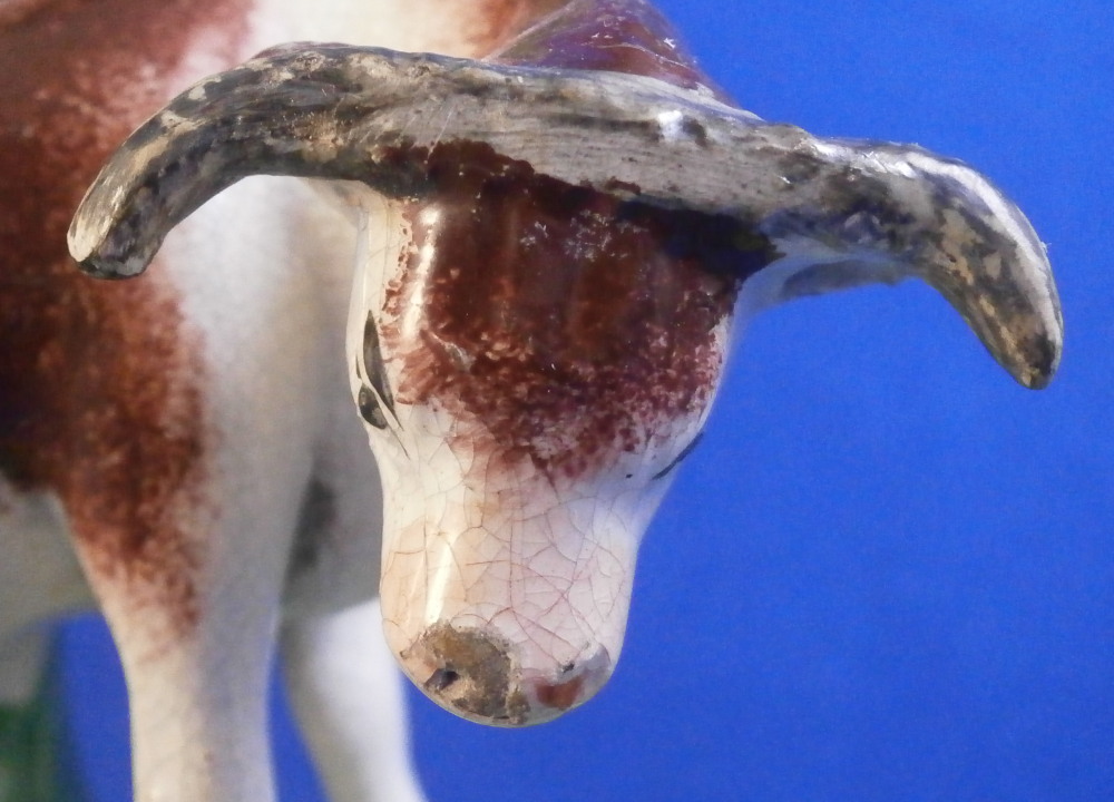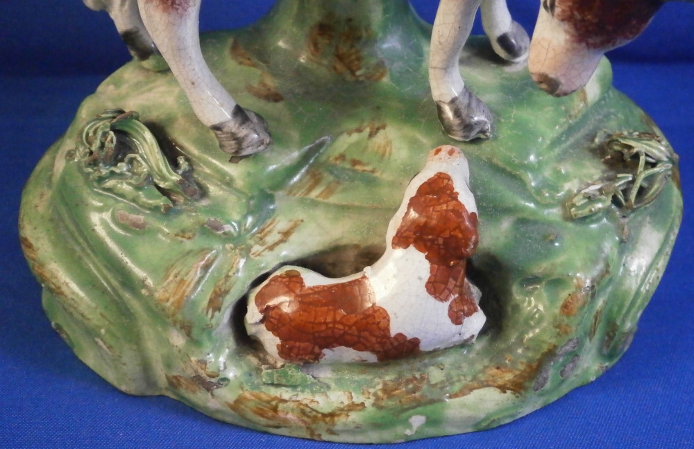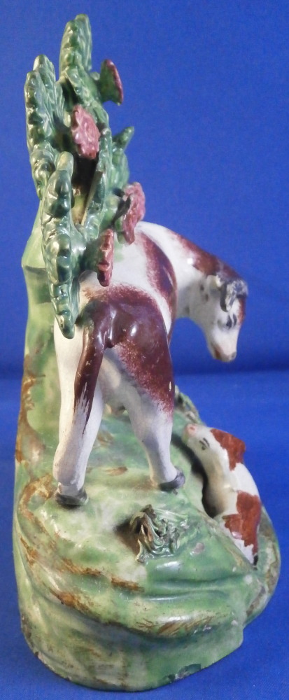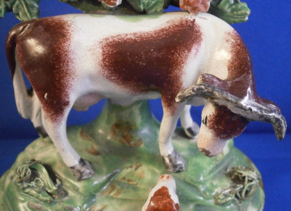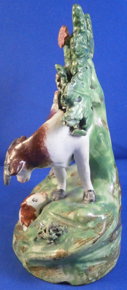 This is a superb figurine made of Creamware in the Staffordshire region around the early 19th century. Possibly by John Waltonthough his pieces are more often than not marked so it could be another maker from this region as well. The figure is of a bull standing in a pasture and looking at a calf lying in front of him. Boccage to the back and some spagetti type grasses applied to the base. It is a nicely modeled and hand painted piece and looks great! The figurine displays perfectly and looks to be in perfect condition but upon very close inspection one can figure out that the horns have had work done to them as well as part of the boccage. It's pretty much perfectly done though so almost impossible to by just looking at it! Some glze missing from the snout of the bull and a hairline crack to his front right leg as shown. The piece is unmarked underneath but that's normal. The figurine is 5.625 inches tall, 4.125 inches wide and 2.75 inches deep. Please email me for more information or other pictures.