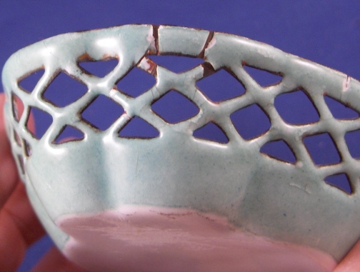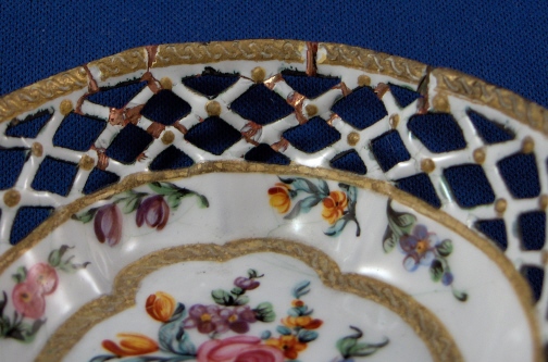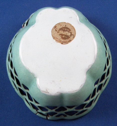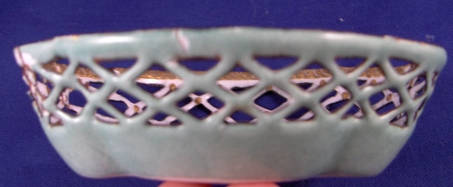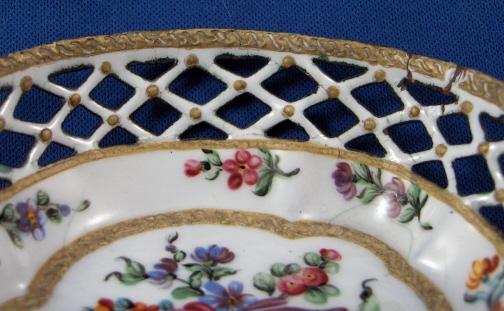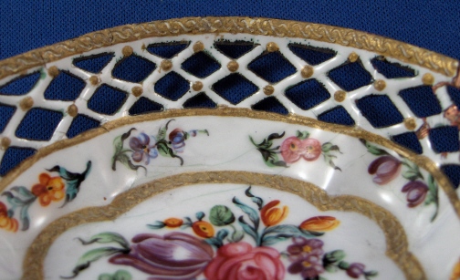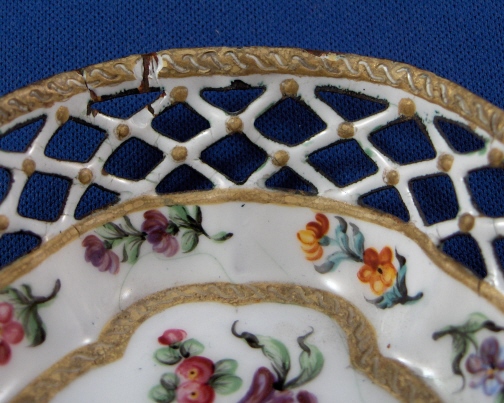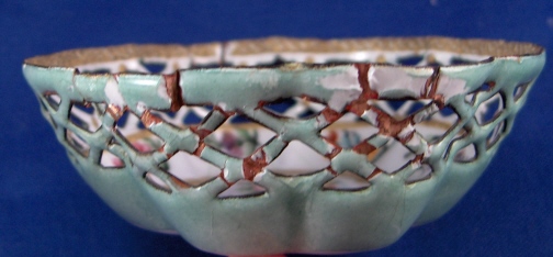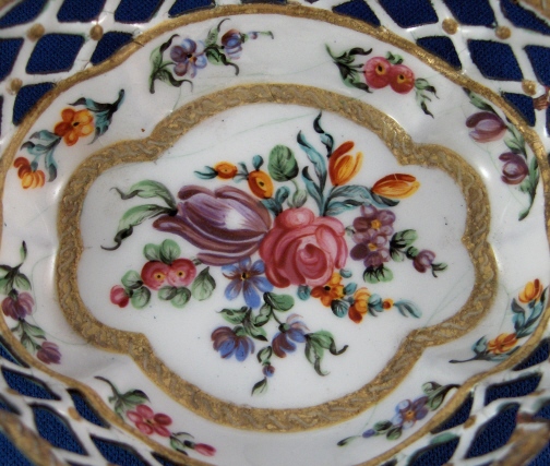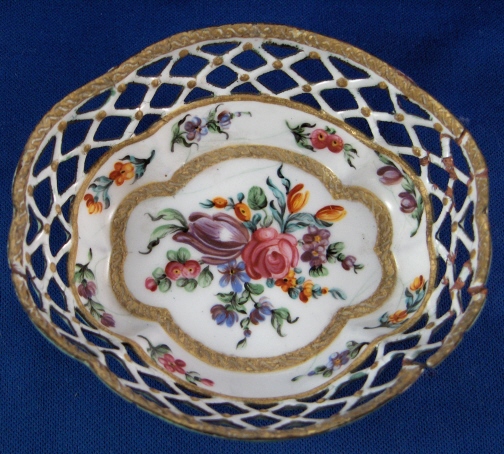 This is something a bit different and unlike anything I have seen before. It is a small reticulated basket made of enamel on copper metal handpainted with a large floral arrangement in the center bottom as well as lots of small flowers and a raised gold design around the center, the top rim and where the reticulated pieces meet. The outside is a nice turquoise color. I would say it was made in England in the late 18th or early 19th century. Likely in the South Staffordshire region. The quality of this piece is superb and the flowers are very detailed. Sadly the piece is not perfect but displays nicely. One side has damage to a section of the top rim with the enamel in a thin stip gone. The other side must have been dropped at some point and the enamel has flaked in spots and the metal bent. It is more noticable from the outside than from the inside and I think the rarity easily makes up for the damage and it should be a fairly easy fix for a good restorer. There are some other very minor damages but these are not bad at all. The basket is not marked underneath but has a very old collection or dealer sticker underneath. It is 1.125 inches tall, 3.75 inches wide and 3.5 inches deep. Please email me for more information or other pictures.