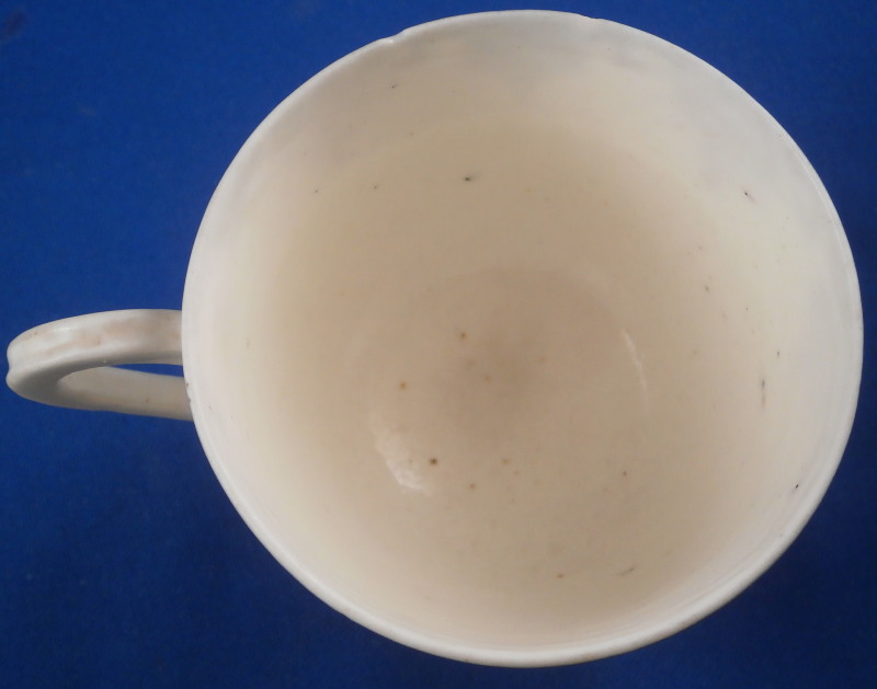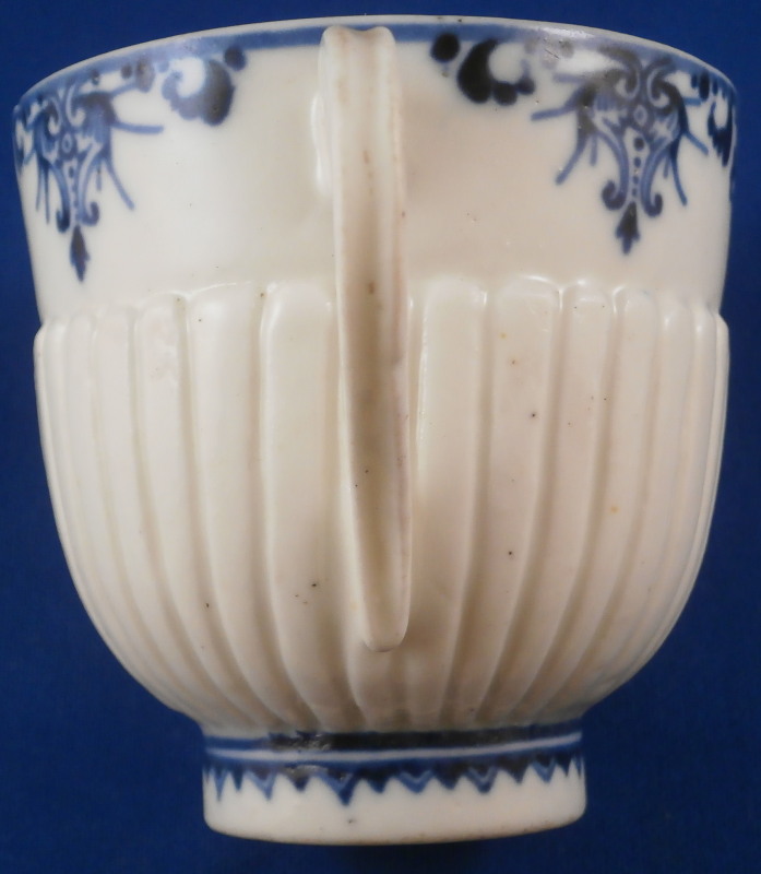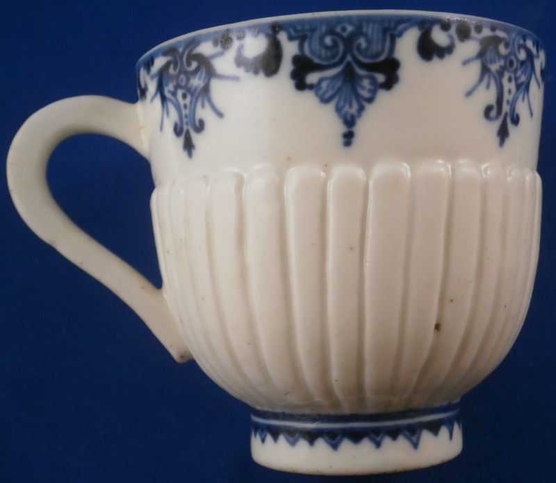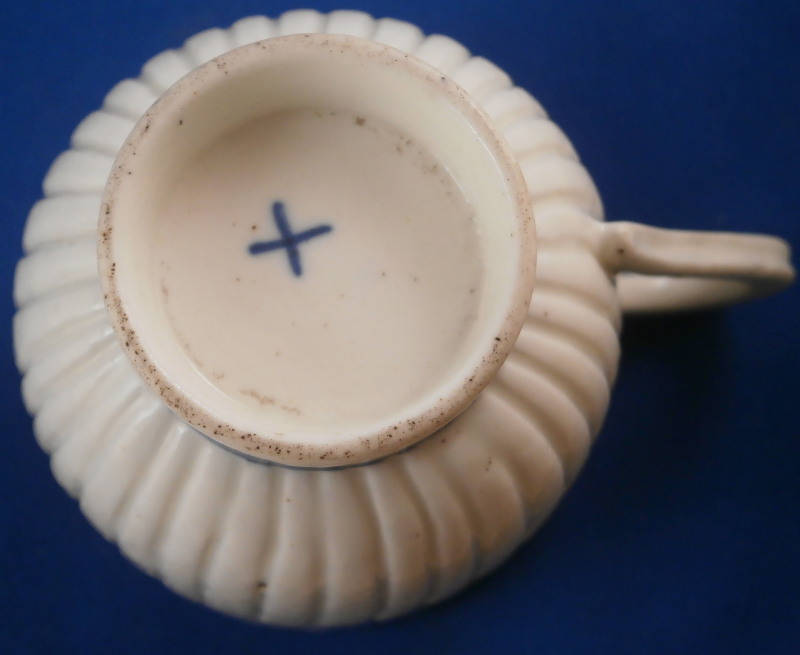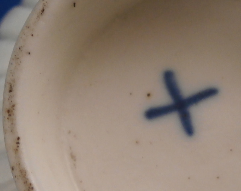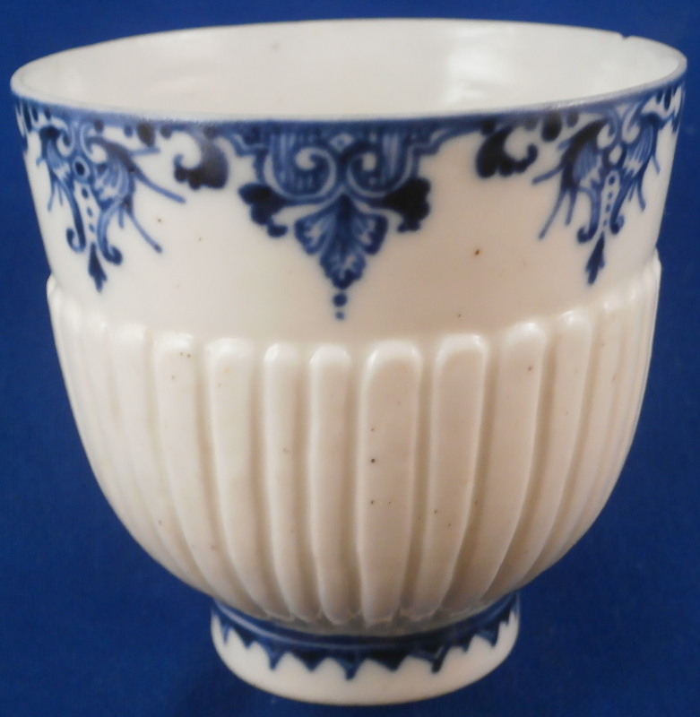 This is a great cup made by St-Cloud during the first quarter of the 18th century. It is made of a creamy colored soft paste with an under glaze blue decoration that is quite nice. Softpaste porcelain has a charm to it unlike any other porcelain! This is a cup with a handle unlike some of the other pieces I ahve owned that were handleless. The cup has a ribbed design to the paste in a section below the blue decoration. The piece is in great condition with just a divet to the top edge which is from the making and glazed and the blue design follows the dent. There is also a thin sliver chip to the outside rim as shown which is super thin and a bit of blue color would hide it perfectly. The cup is marked with an under glaze blue cross or plus sign as shown. The cup is 2.625 inches tall and 2.75 inches in diameter. Please email me for more information or other pictures.