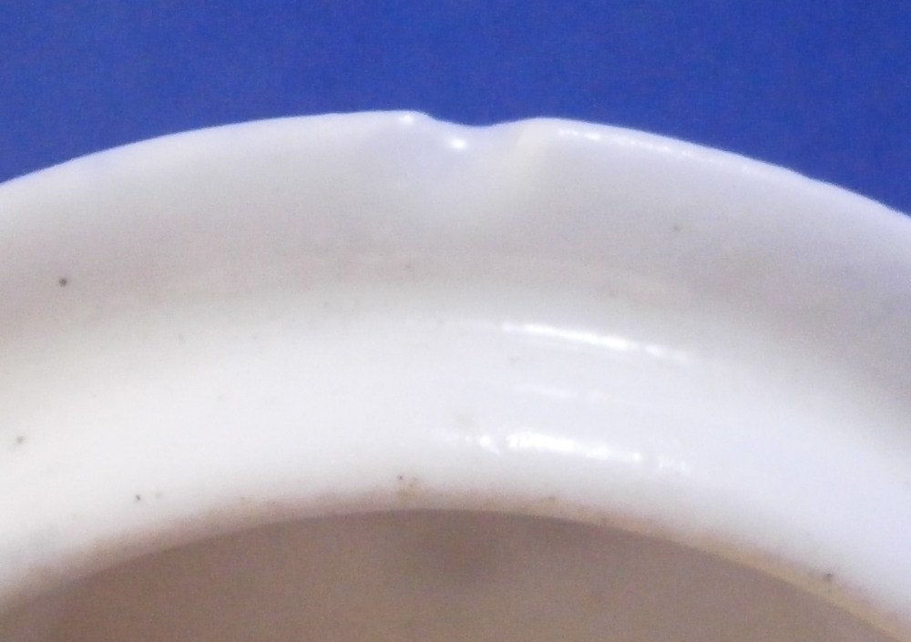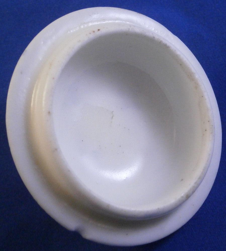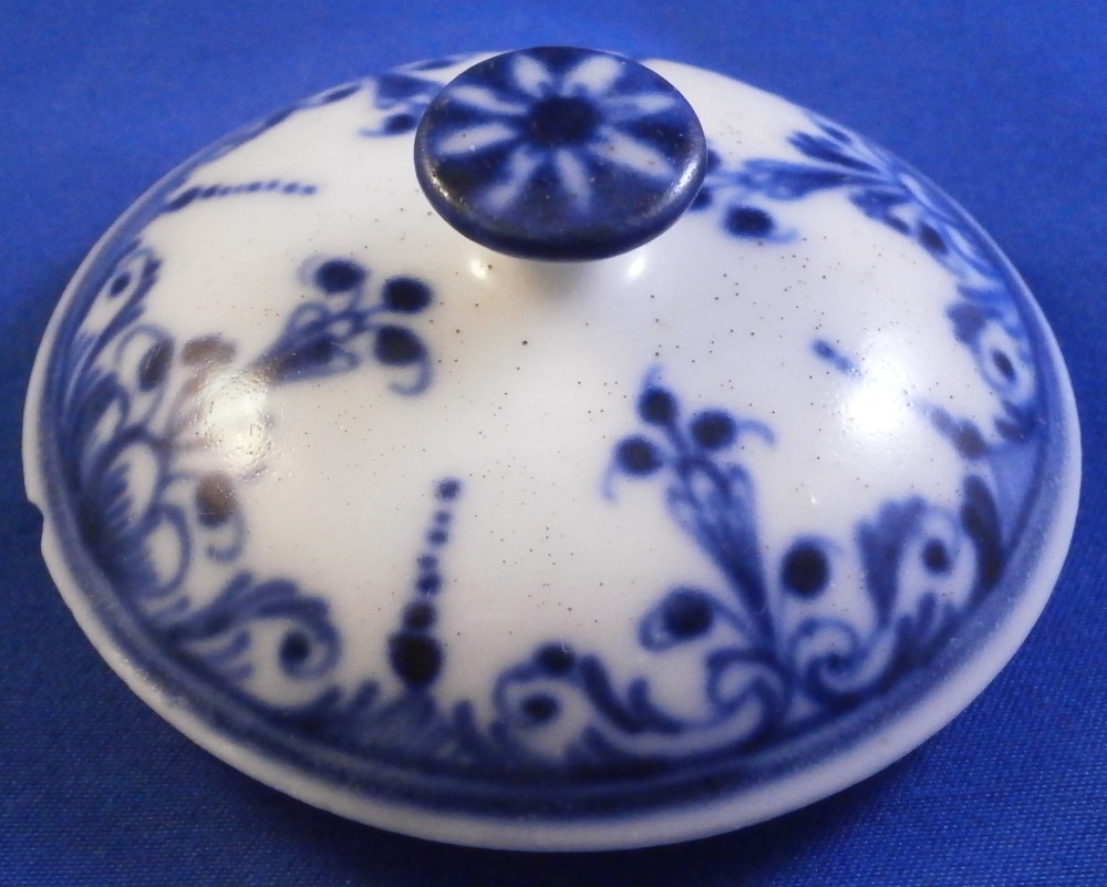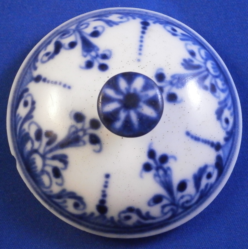 This is a lid for a pot a fard or pommade (for makeup or ointment) made by St-Cloud in the first half of the 18th century. It is made of a creamy colored softpaste with an under glaze blue decoration that is quite nice. Soft paste porcelain has a charm to it unlike any other porcelain and is a must have for the collector! The lid is in great condition with a chip to the edge from when it was made and thus glazed over. I have seen that a few times on their wares which I find a bit odd but I guess back then this was acceptable. Unmarked underneath which would be normal since it is just a lid but definitely made by them during this period! The lid is 0.875 inches tall without the ring on the underside and 2.625 inches in diameter. The ring on the underside that would sit inside its missing body is just under 0.25 inches tall with an outer diameter of 2.125 inches so your piece would need to have an opening of at least that or a touch bigger. Please email me for more information or other pictures.